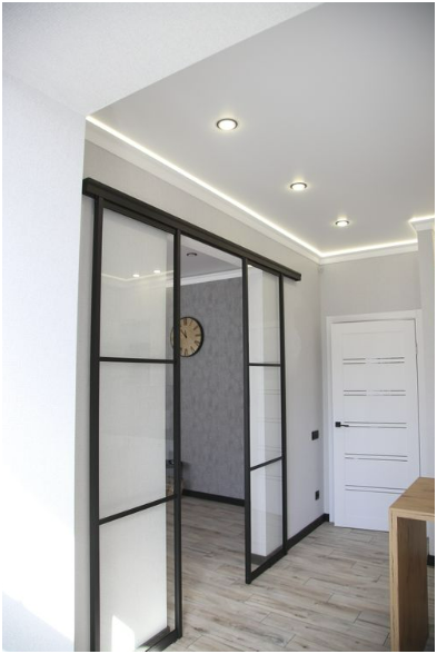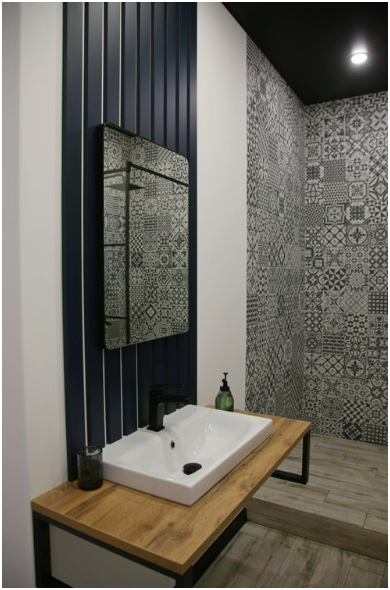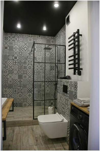 Прекрасная ванная комната с черным потолком и стильной сантехникой позволит принять душ перед сном, а встроенный гардероб позволит удобно разместить все Ваши вещи.