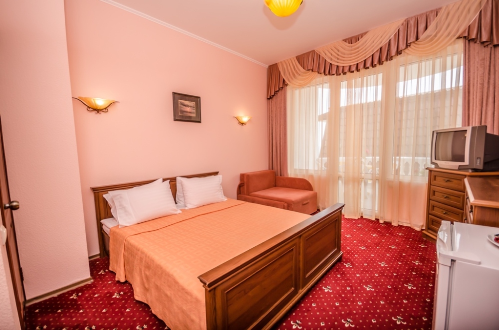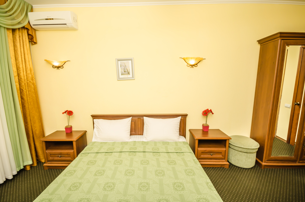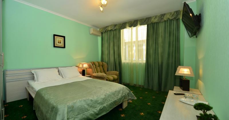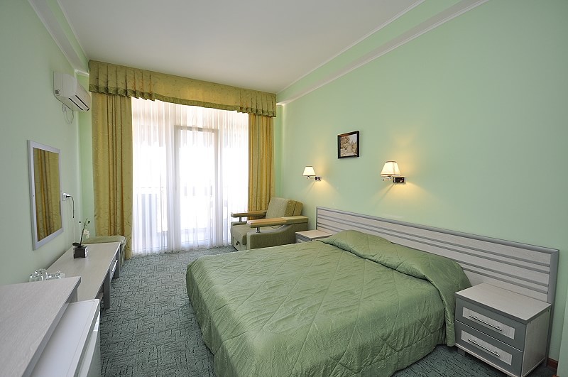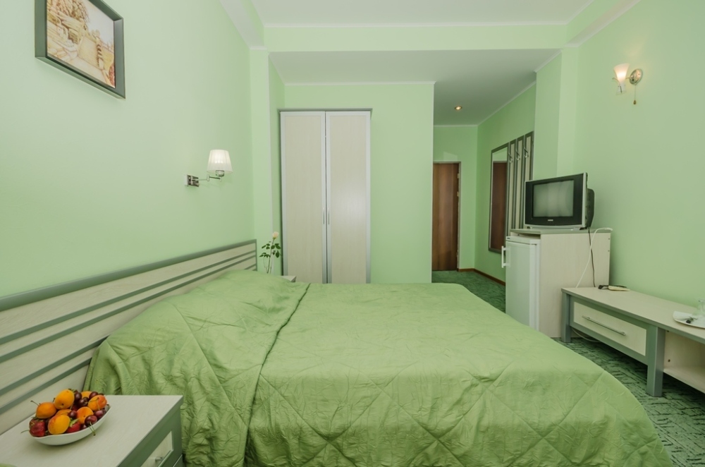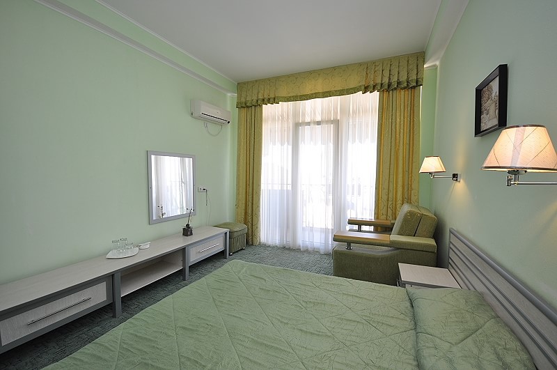 Номера выходят на северную сторону. Для комфортного отдыха вдвоем номер располагает всем необходимым. Это кондиционер для создания прохлады, полный пакет телеканалов, Wi-Fi. Номер без балкона.
