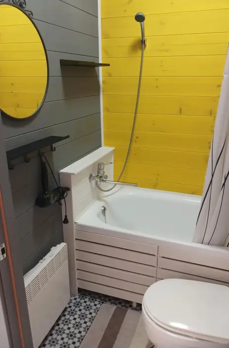 В ванной: теплый пол, фен, ванна, шампунь, полотенца, туалетные принадлежности.