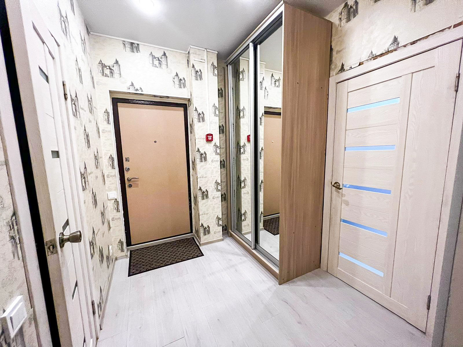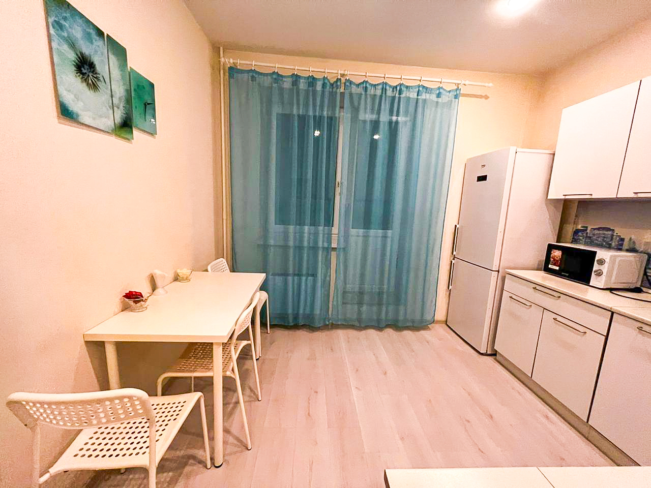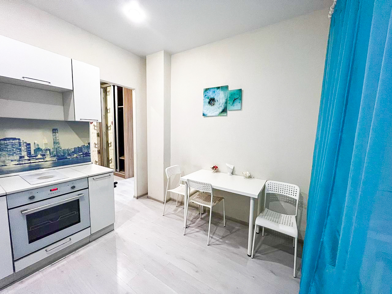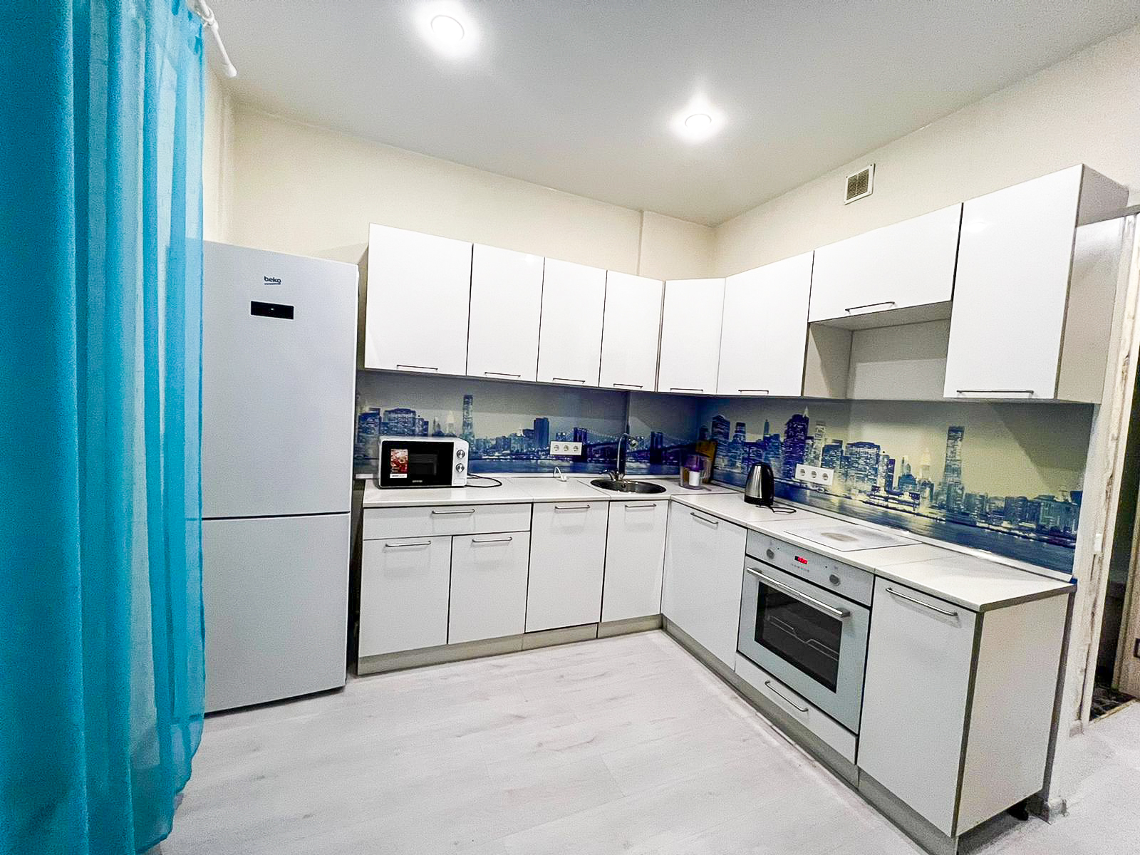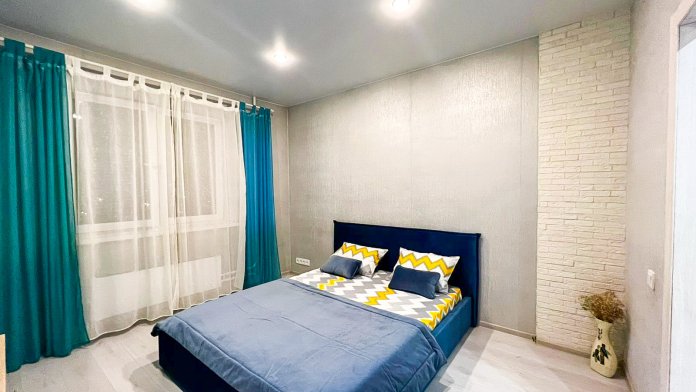 В квартире есть все необходимое: двухспальная кровать, кухонный гарнитур, плита, микроволновка, чайник, стиральная машина, телевизор, шкаф, обеденная зона, гладильные принадлежности, Wi-Fi. Предоставляются туалетно-косметические принадлежности.