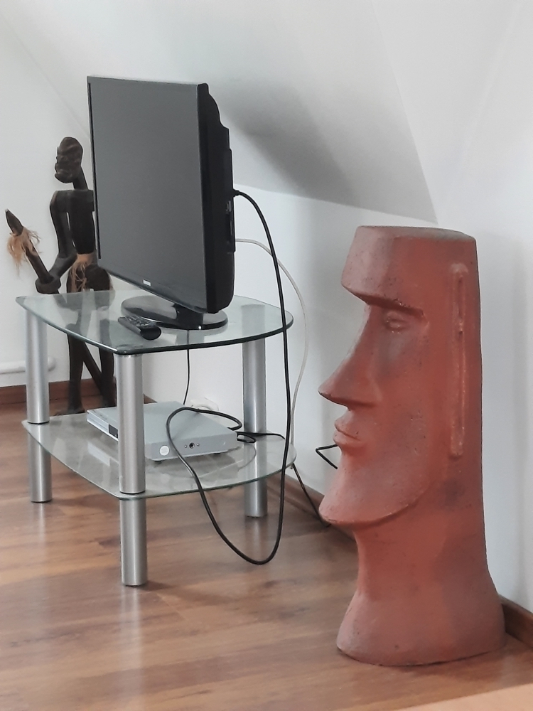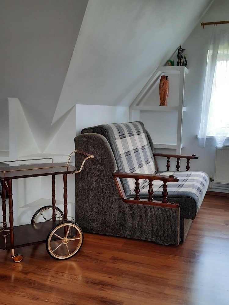 На 2 этаже: комната-студия с библиотекой, телевизором, диваном, креслами для отдыха и большой 2-спальной кроватью.