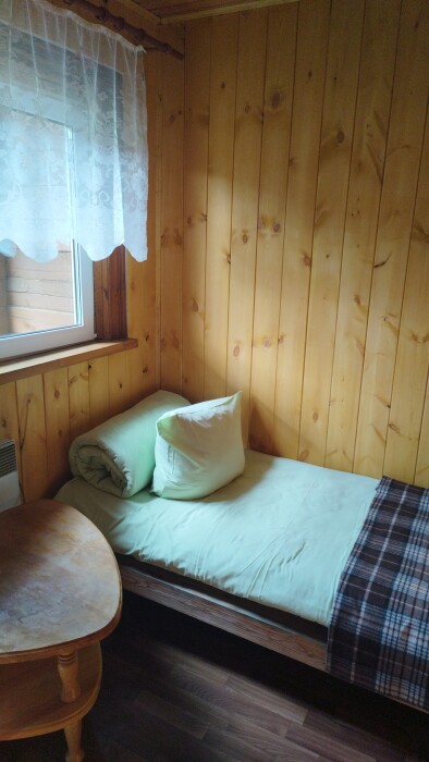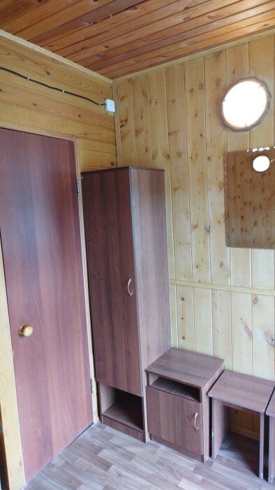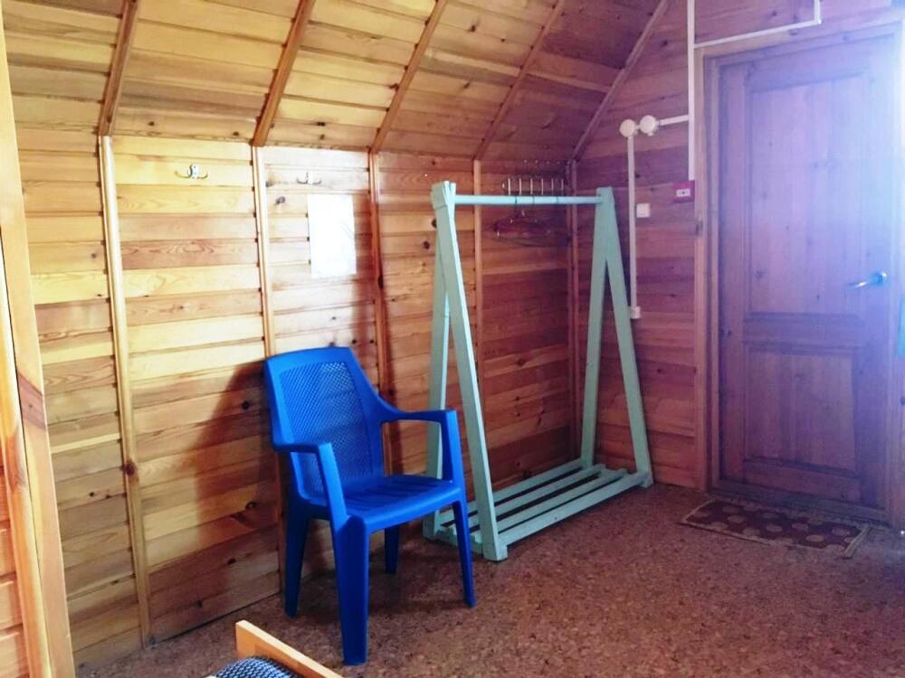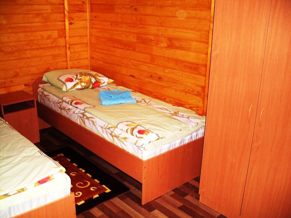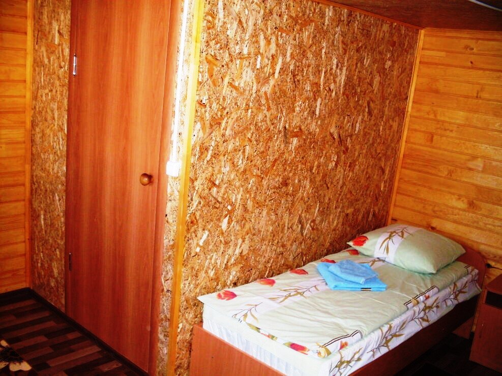 Летний корпус «Стандарт». В номере душевая кабина, туалет, горячая и холодная вода, односпальная кровать, зеркало, тумбочка, коврик).