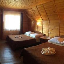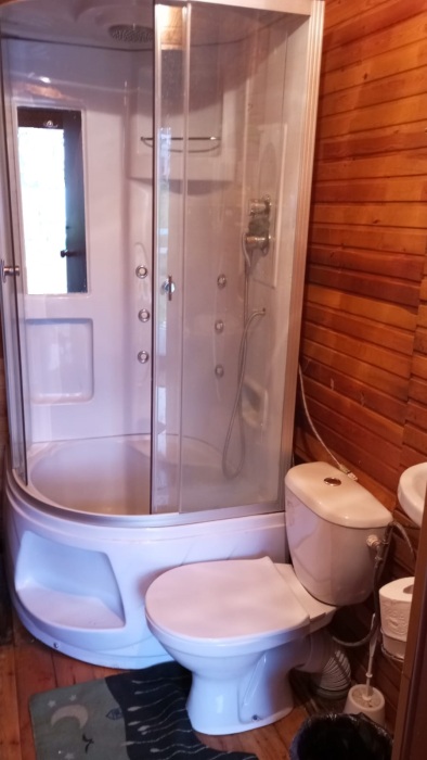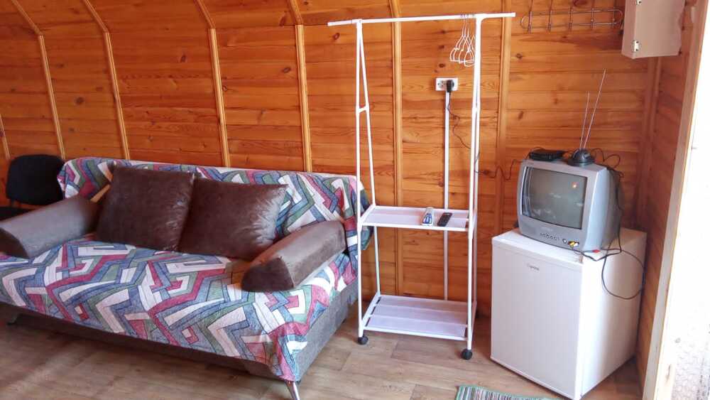 Летний домик повышенной комфортности «Комфорт». В домике туалет, раковина, горячая и холодная вода, душевая кабина, две двуспальные кровати, раскладной диван, зеркало, столик, холодильник, телевизор.