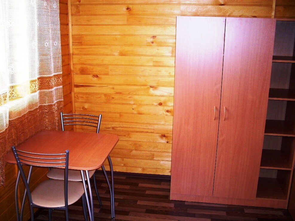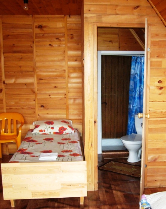 Летний корпус «Гостевой». В номере туалет, раковина, душевая, кровать односпальная, шкаф, тумбочка, зеркало, столик, стулья, коврики.