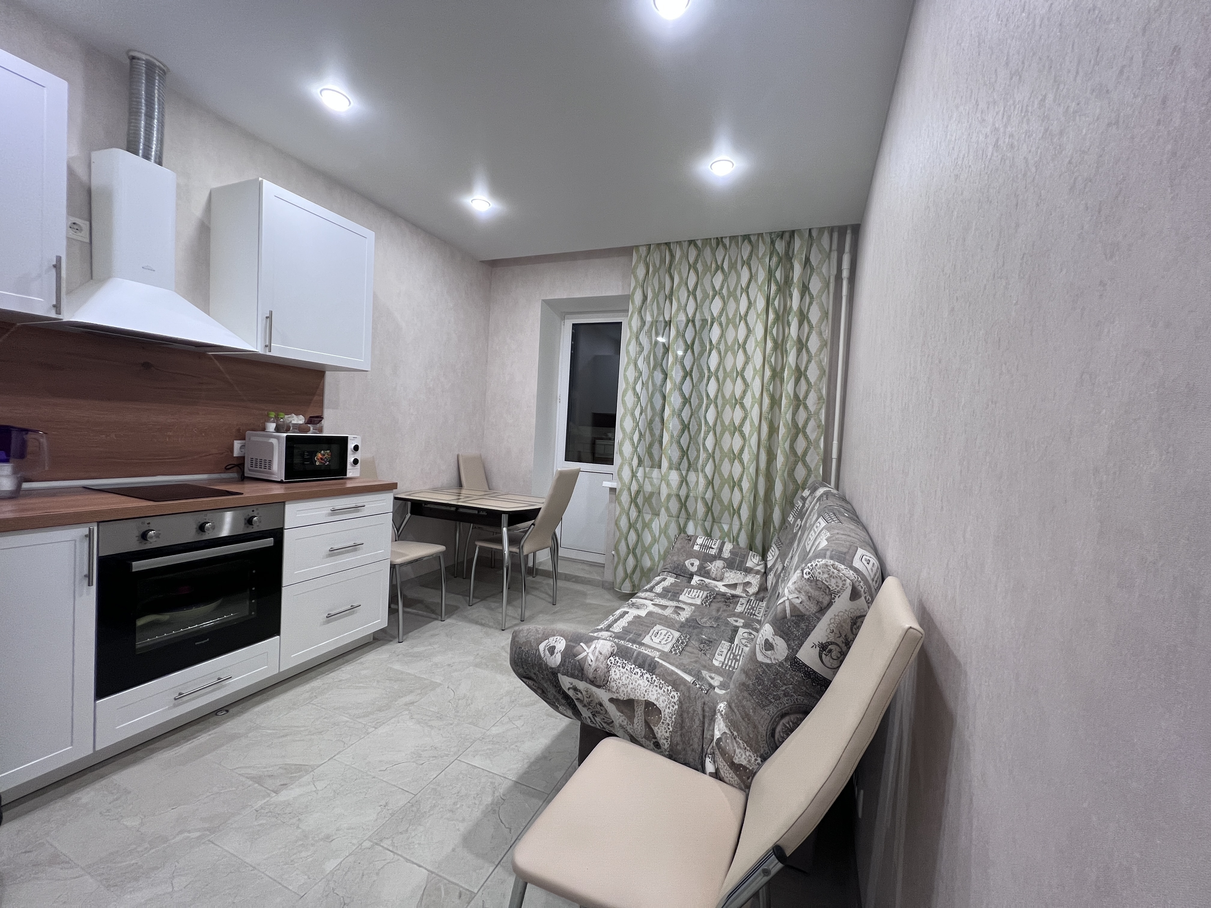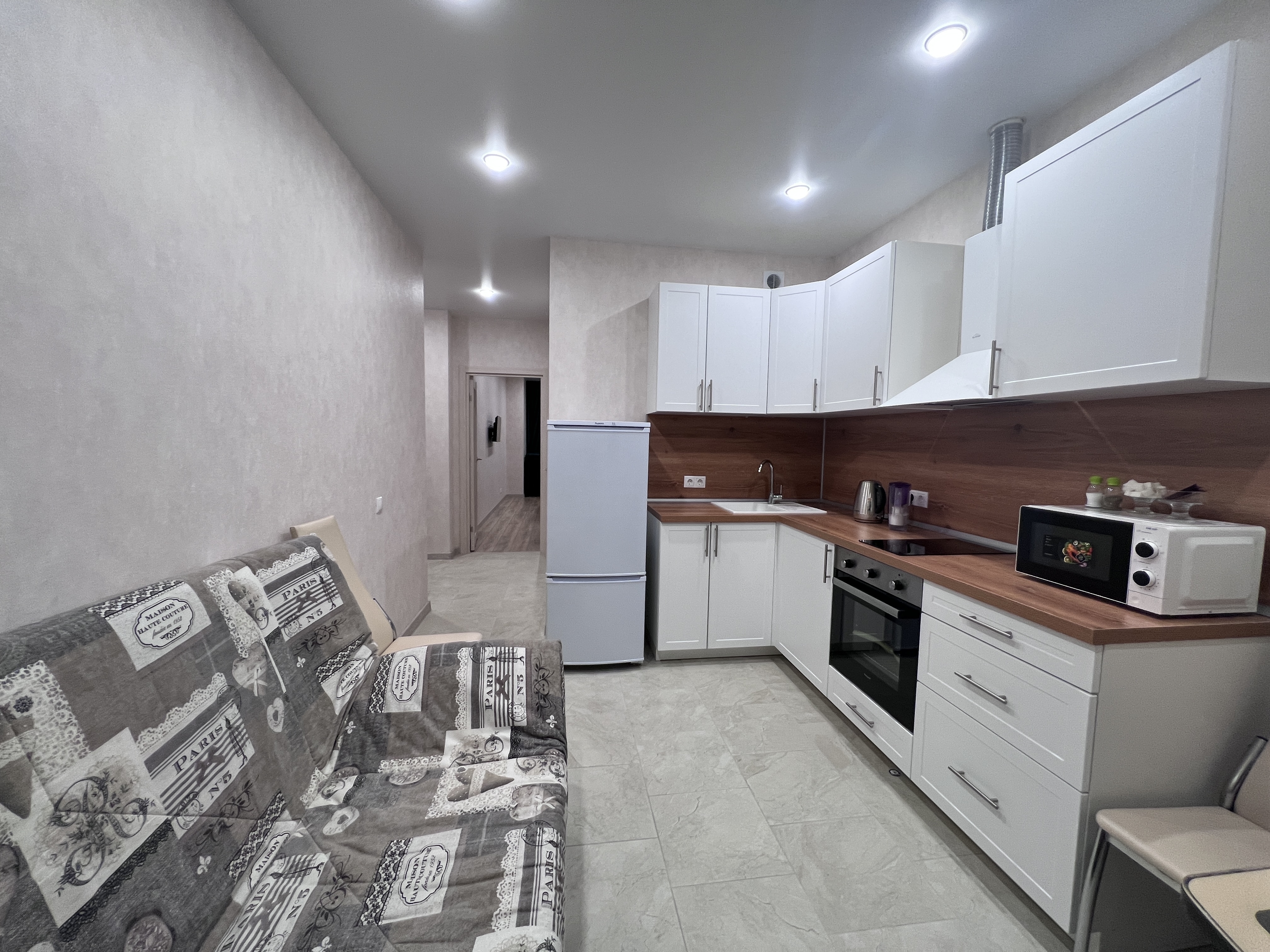 В квартире есть все необходимое: двухспальная кровать, диван, кухонный гарнитур, плита, микроволновка, чайник, стиральная машина, телевизор, шкаф, обеденная зона, гладильные принадлежности, Wi-Fi. Предоставляются туалетно-косметические принадлежности.