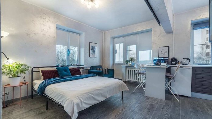 - единое пространство, в котором выделены зона кухни, обеденная и спальная зоны,