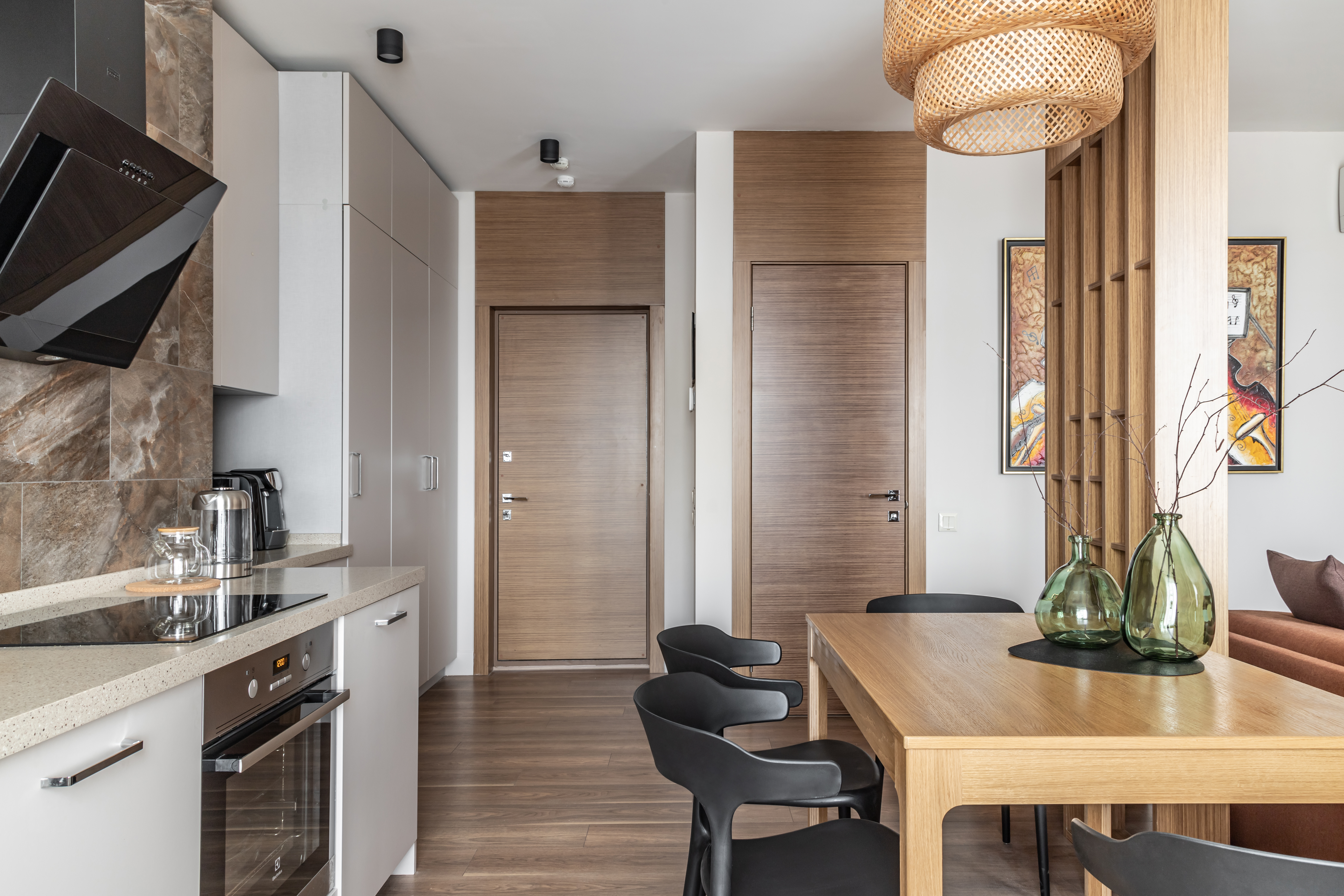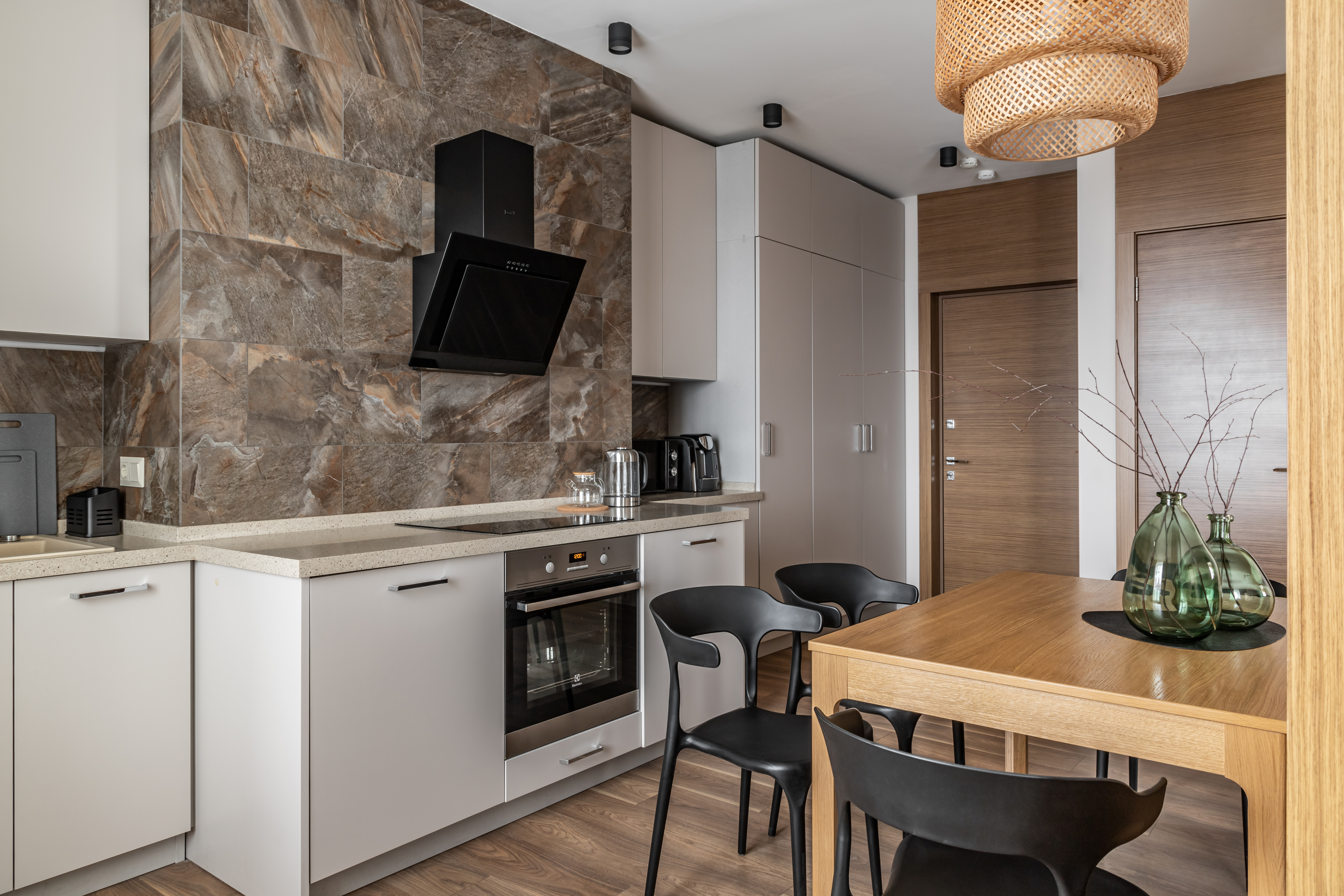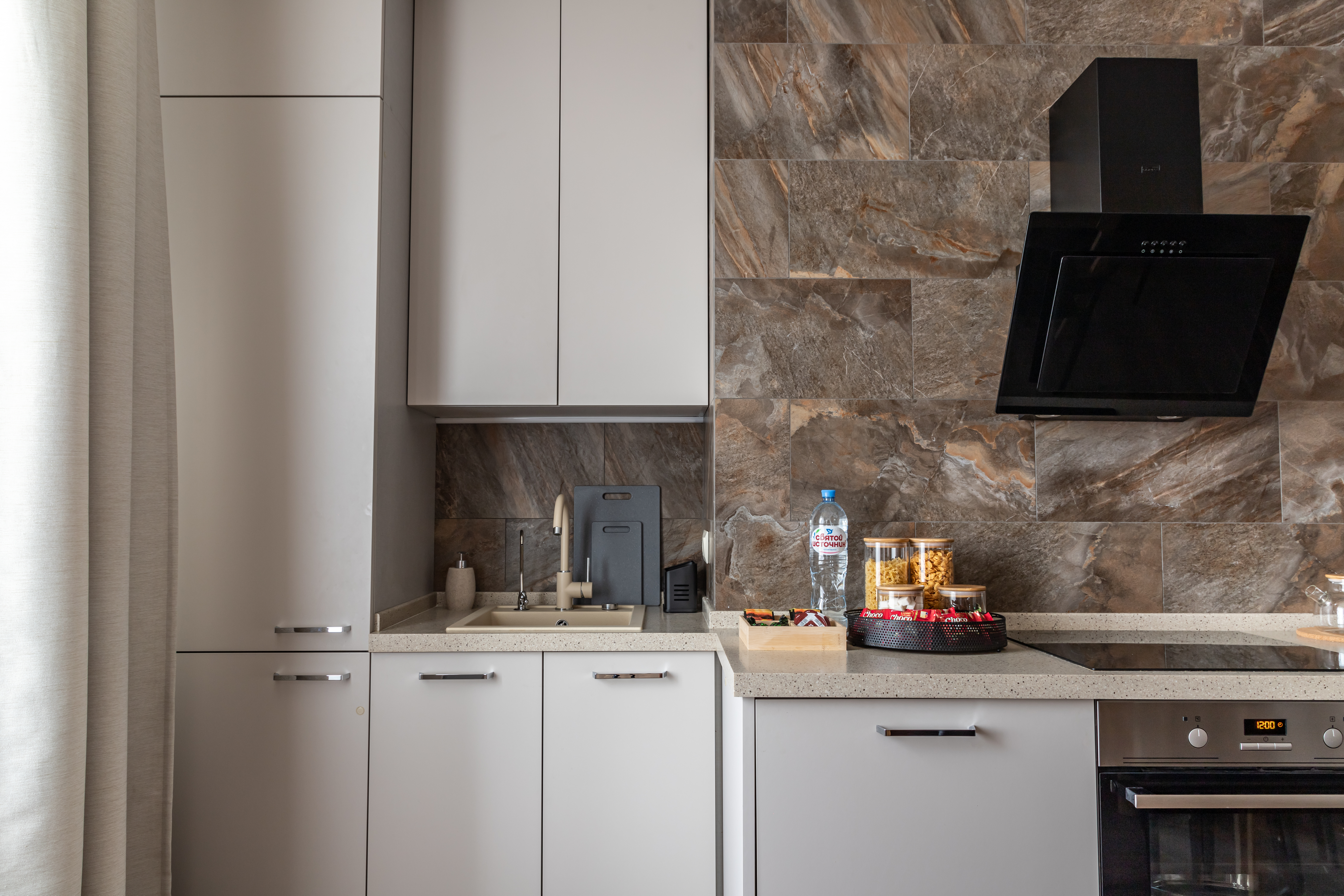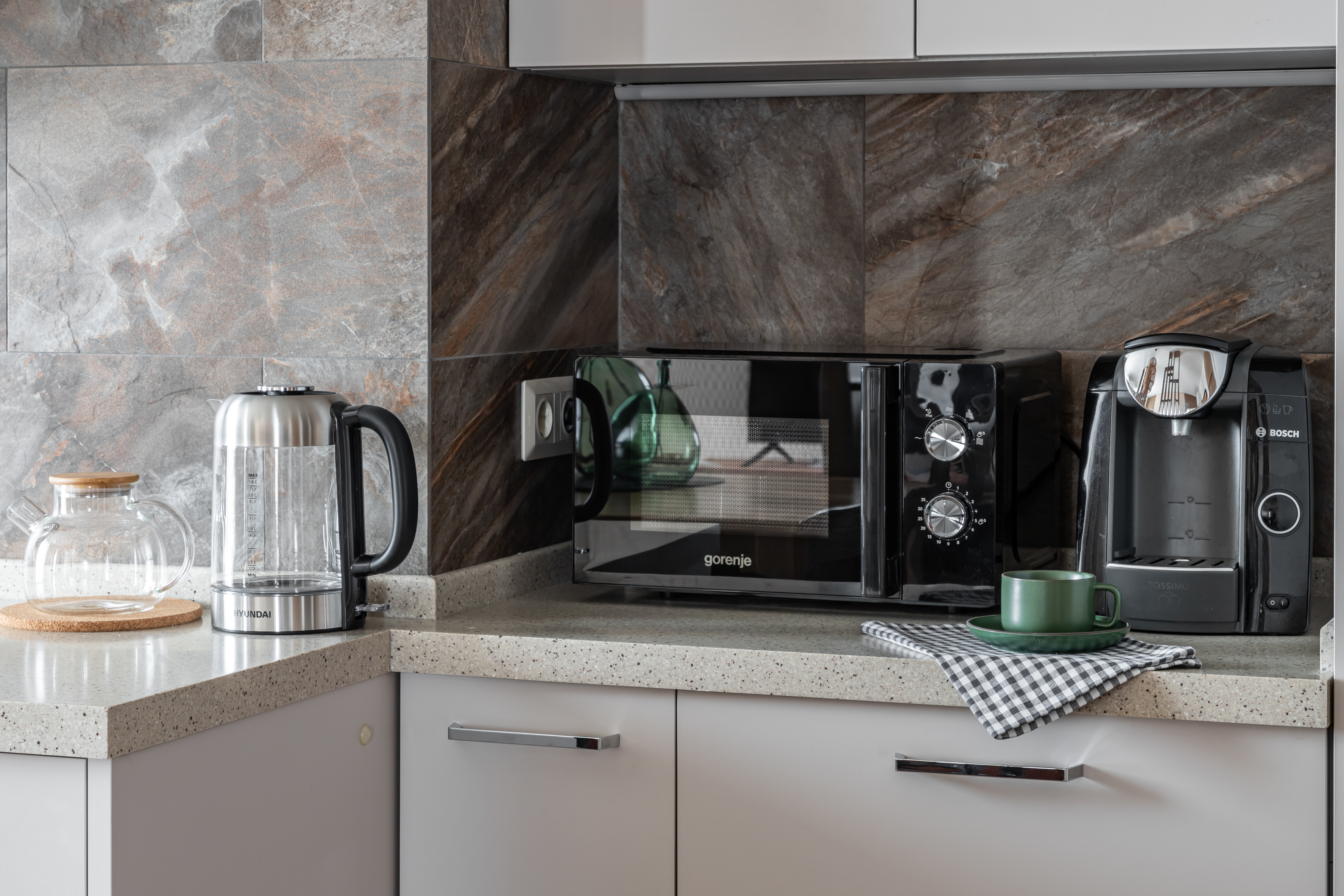 - вся необходимая бытовая техника: варочная панель, духовка, холодильник, микроволновка, посудомоечная машина, капсульная кофеварка,