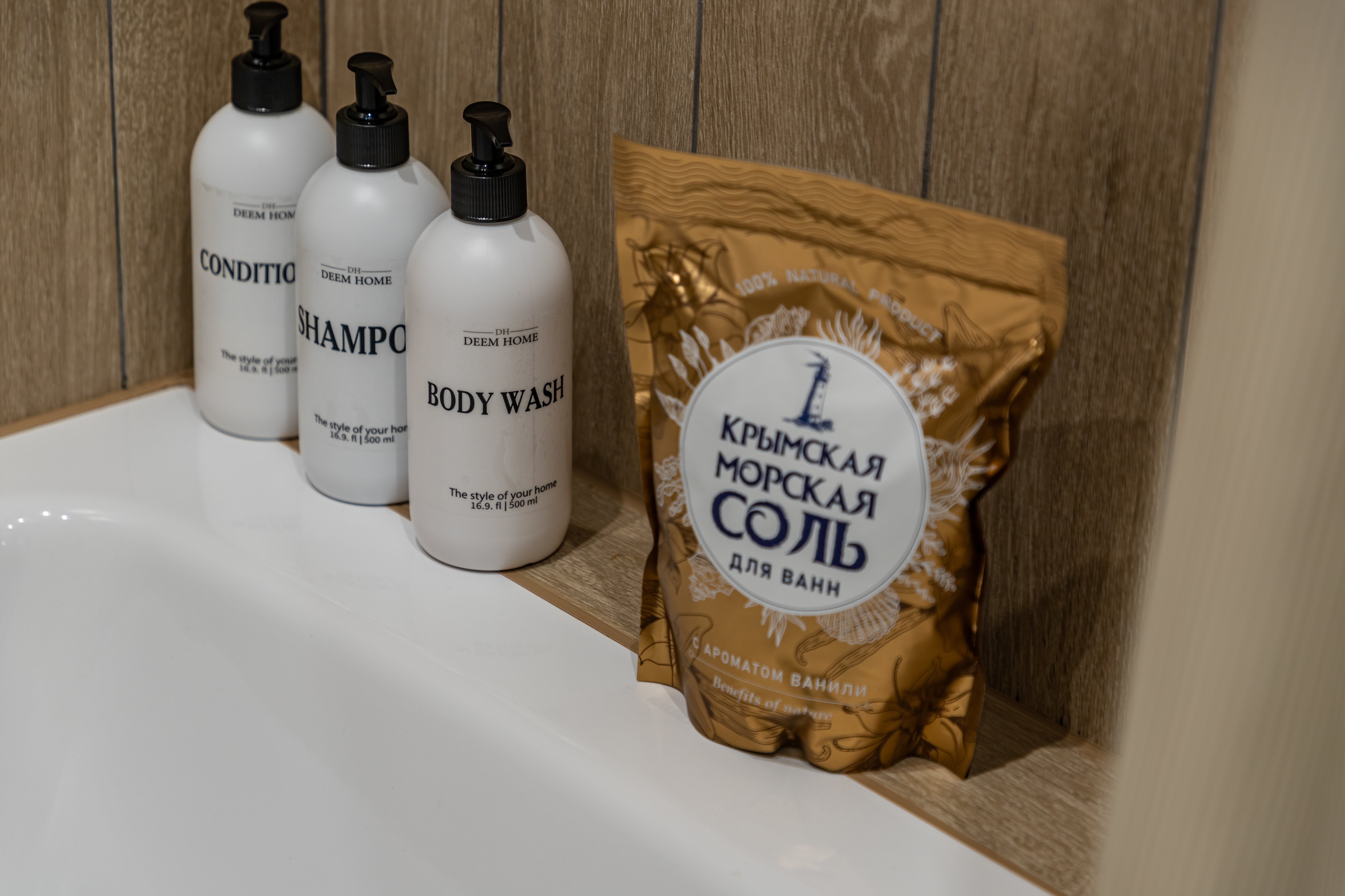 - мягкие халаты, косметические принадлежности (жидкое мыло, шампунь, кондиционер для волос, гель для душа, мицеллярная вода, крема, маски и тд).