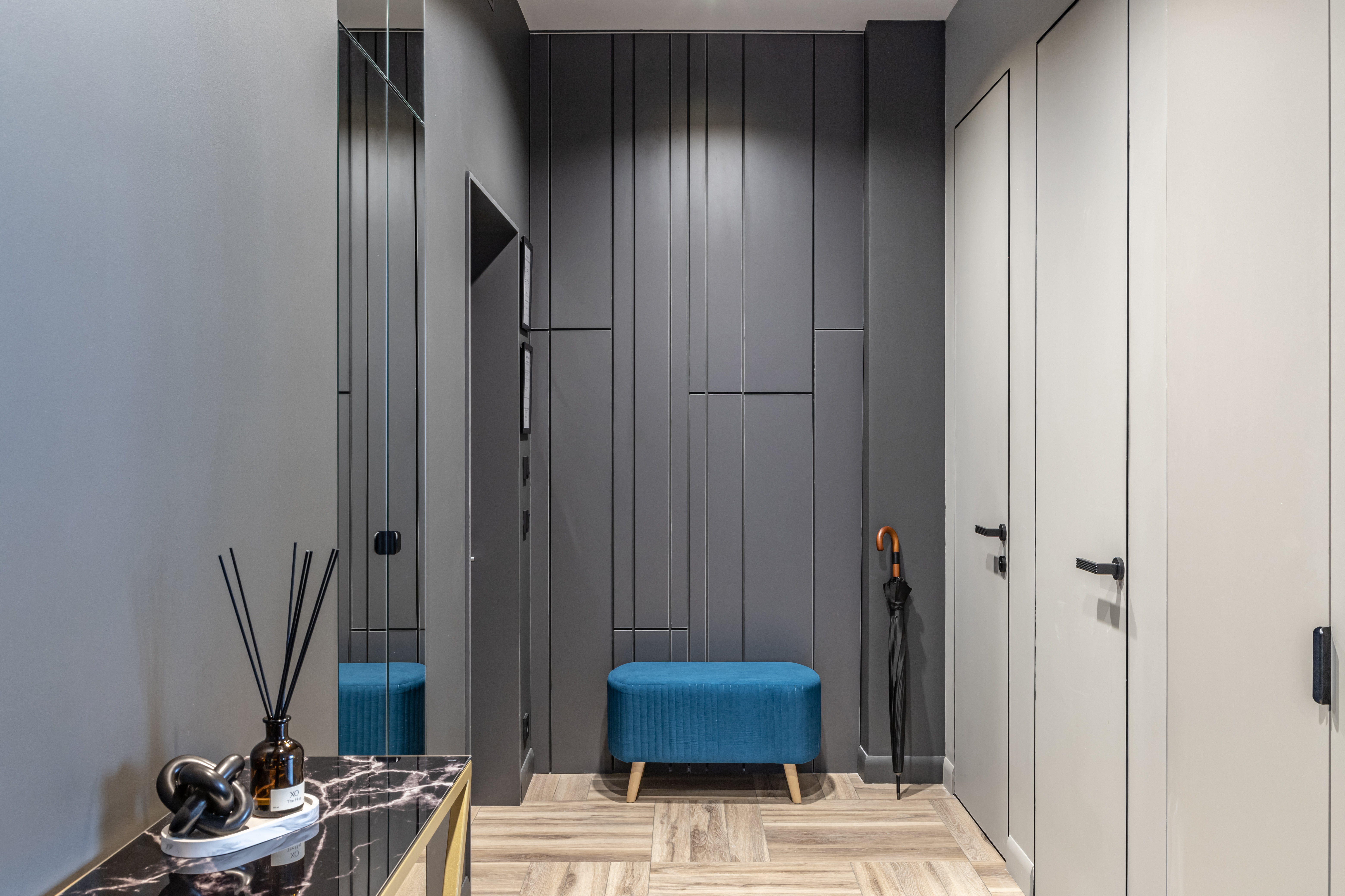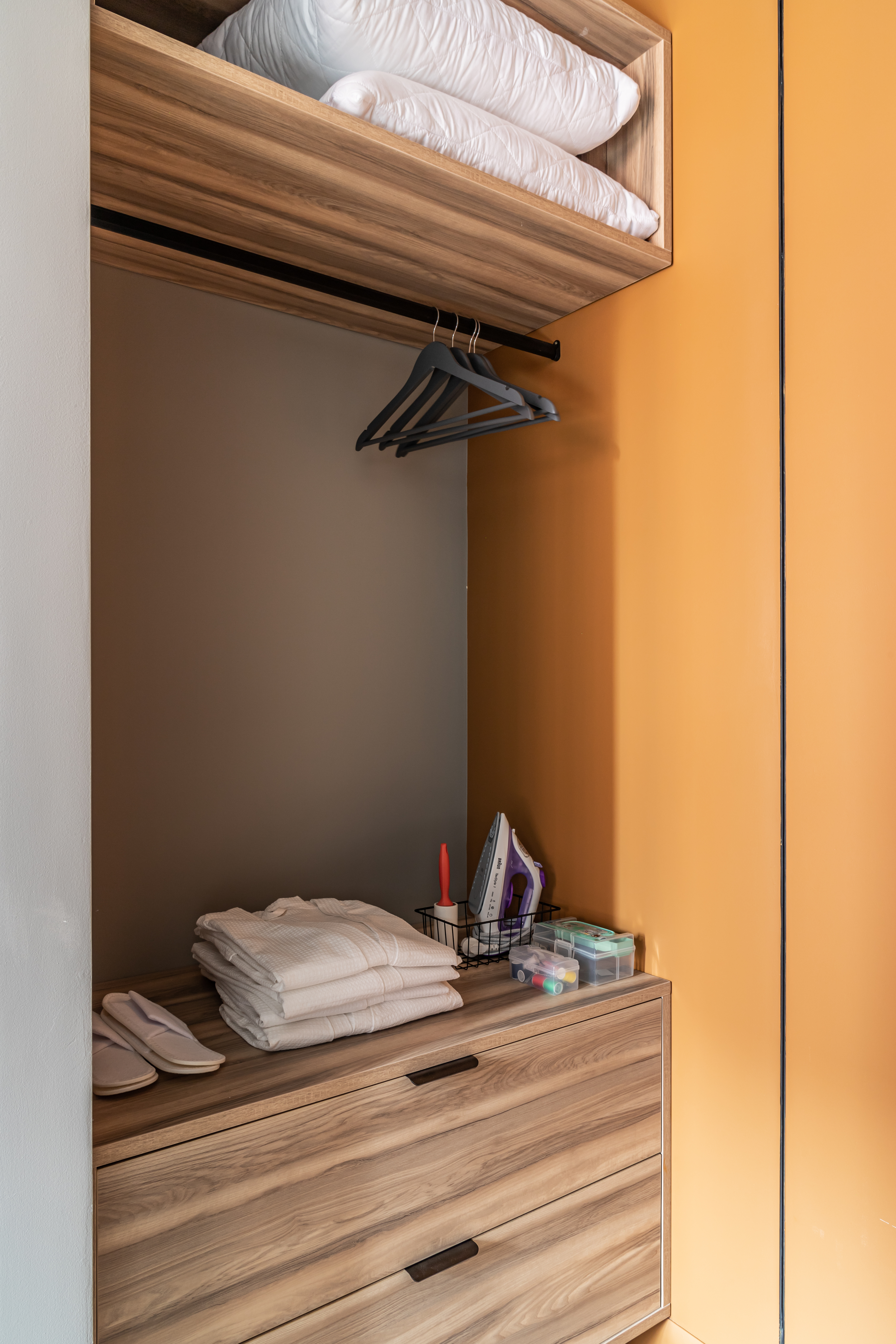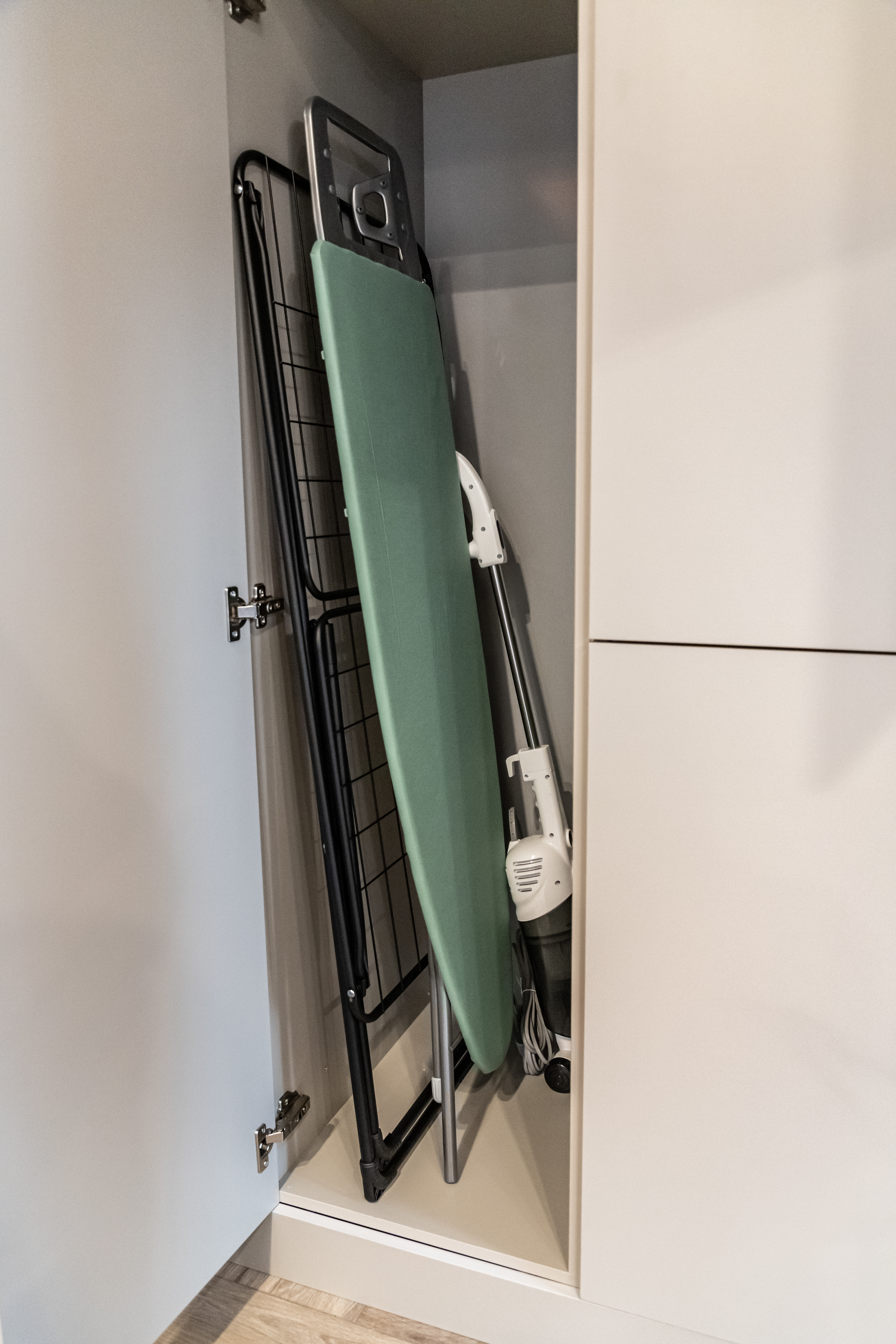 - гардеробная зона, где есть все для вашего идеального внешнего вида (гладильная доска, утюг, вешалки и полки).