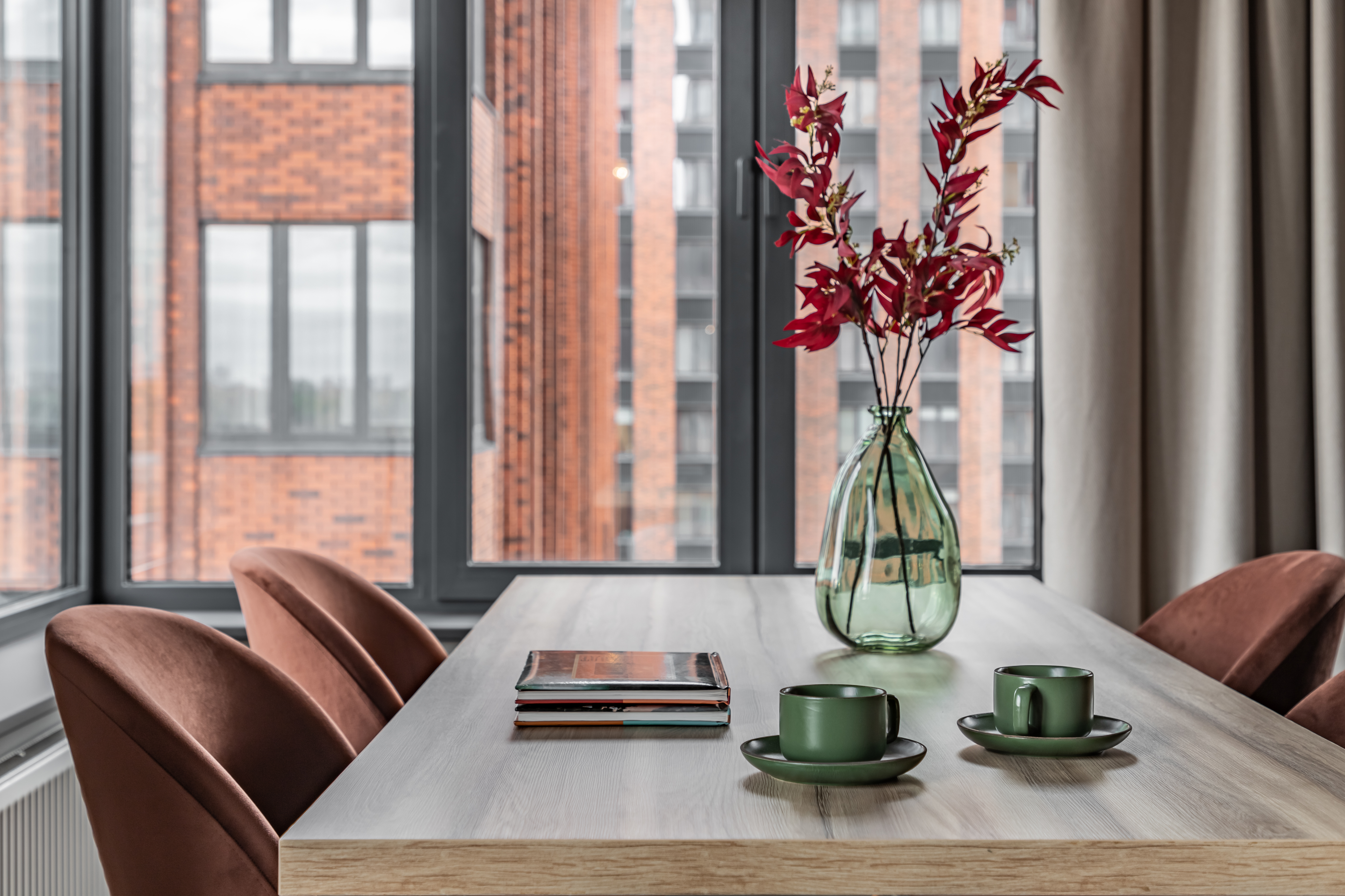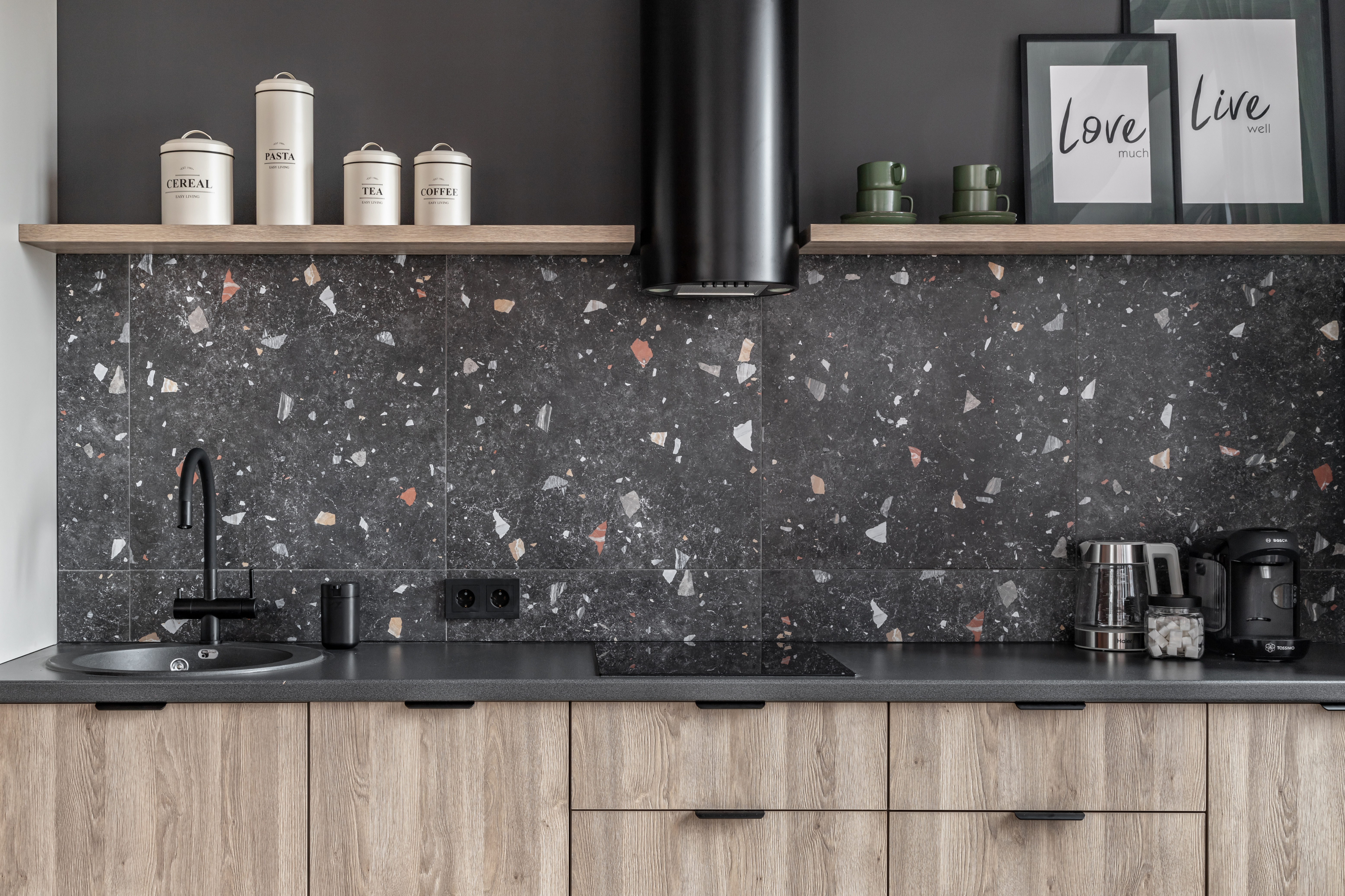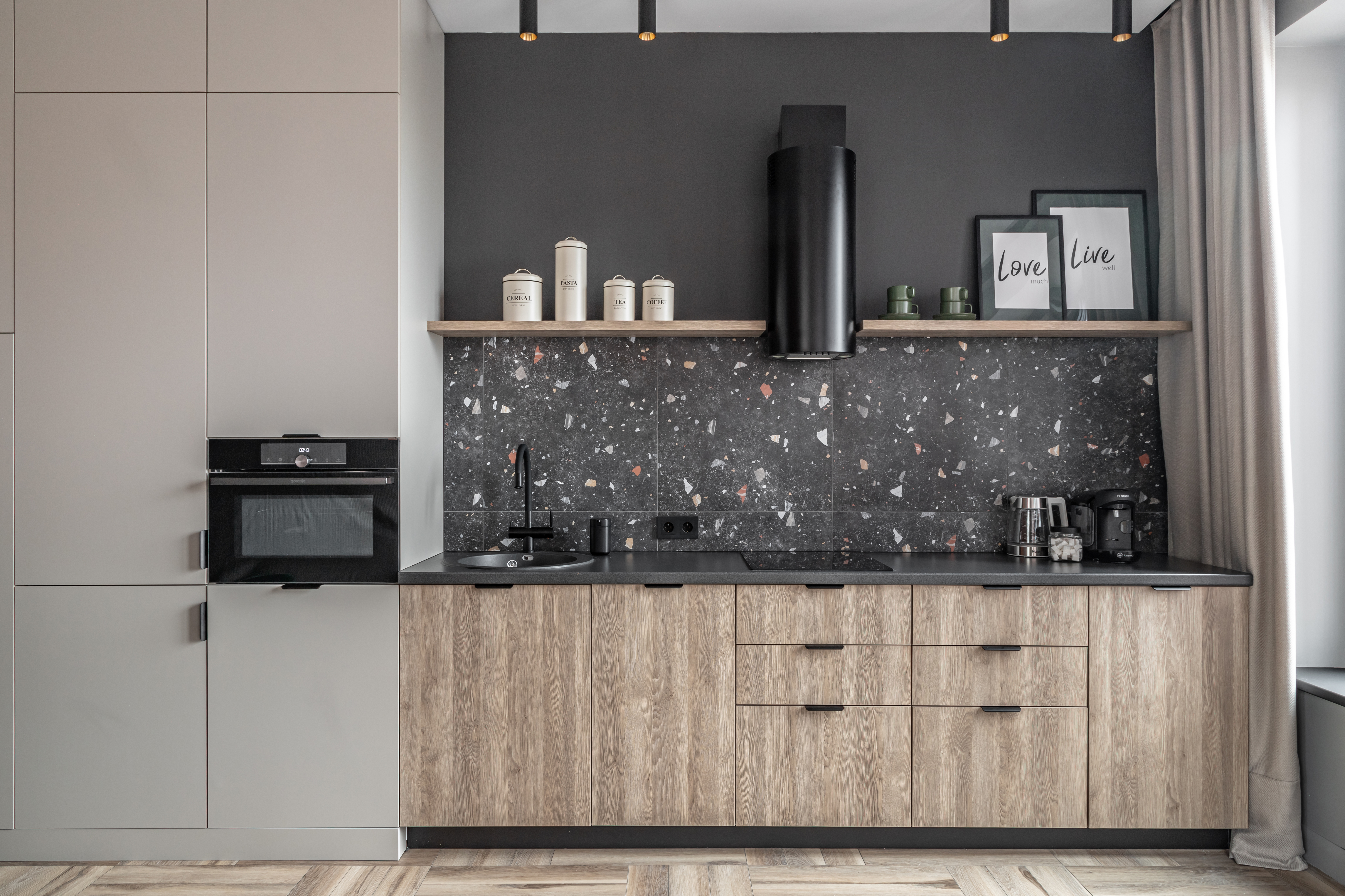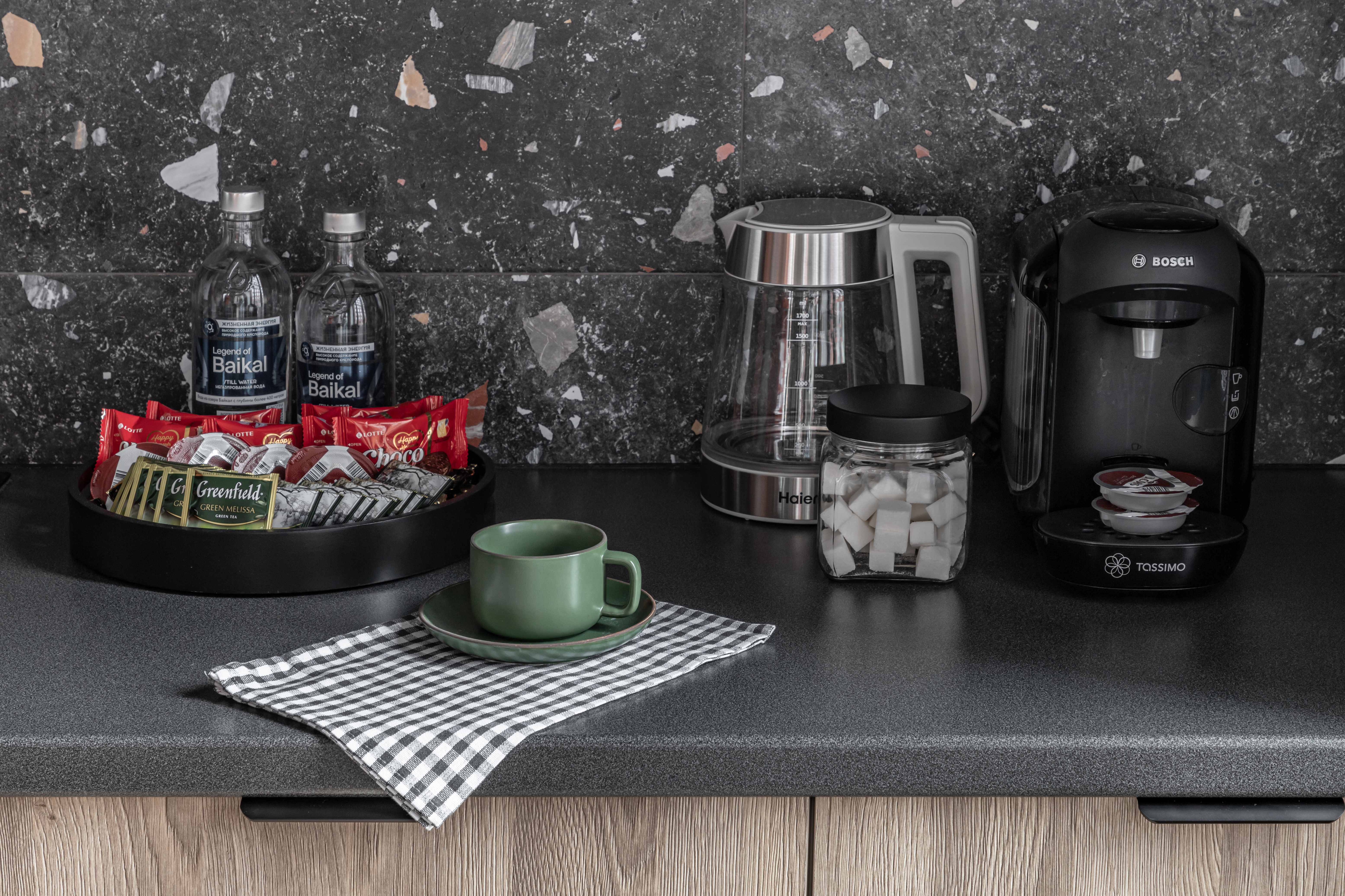 - вся необходимая бытовая техника: 4-х комфорочная варочная панель, духовка, большой холодильник, микроволновка, посудомоечная машина, капсульная кофеварка,