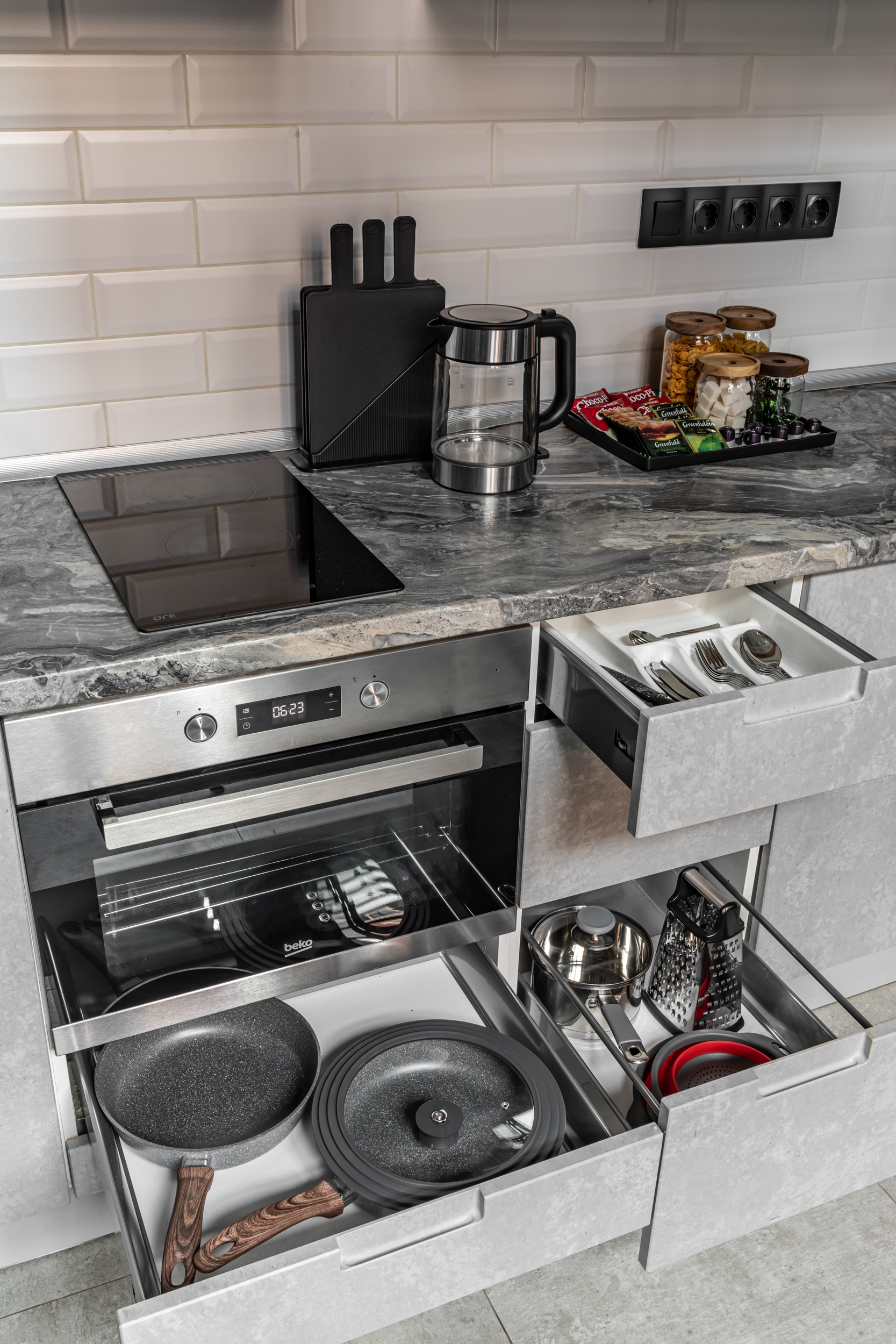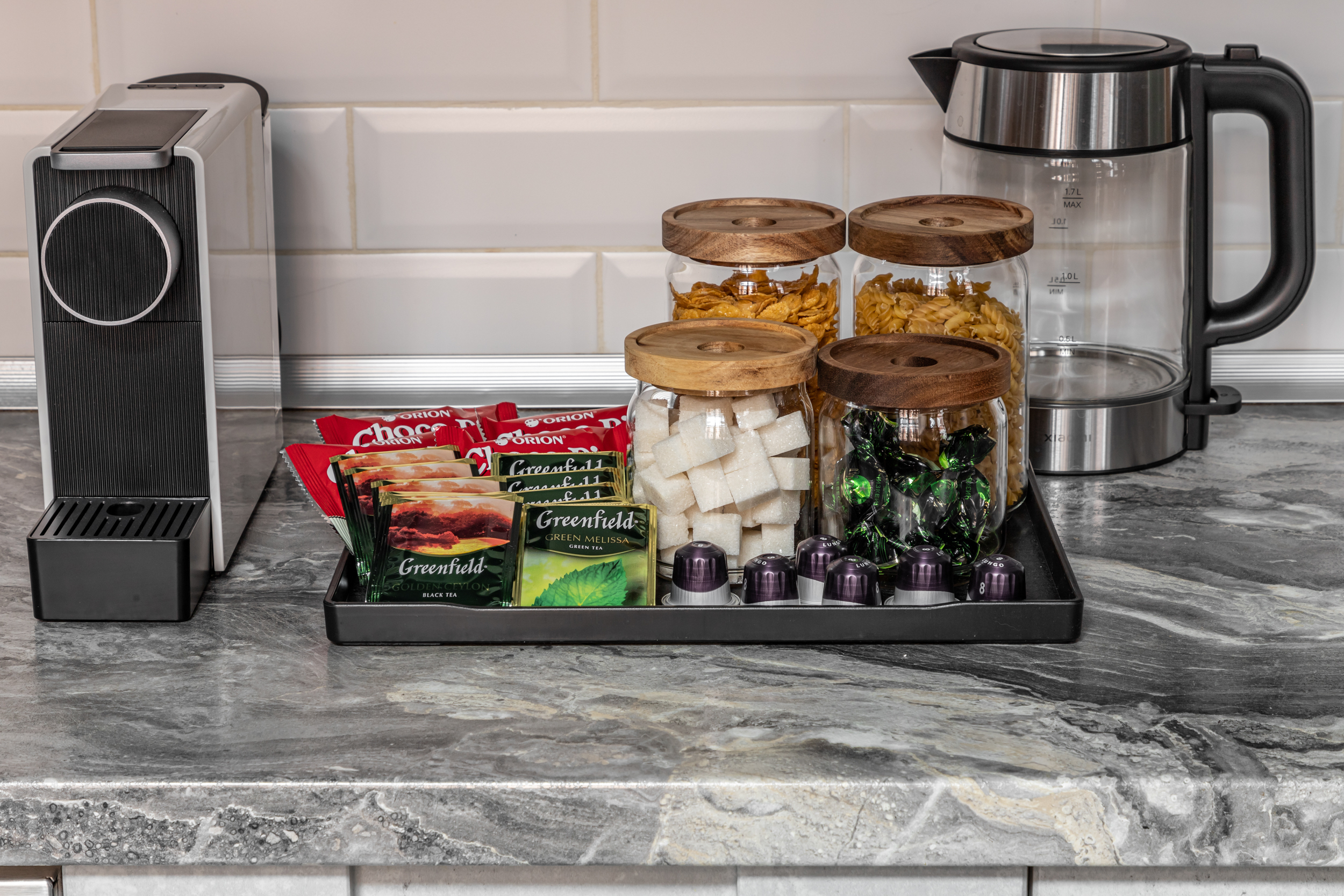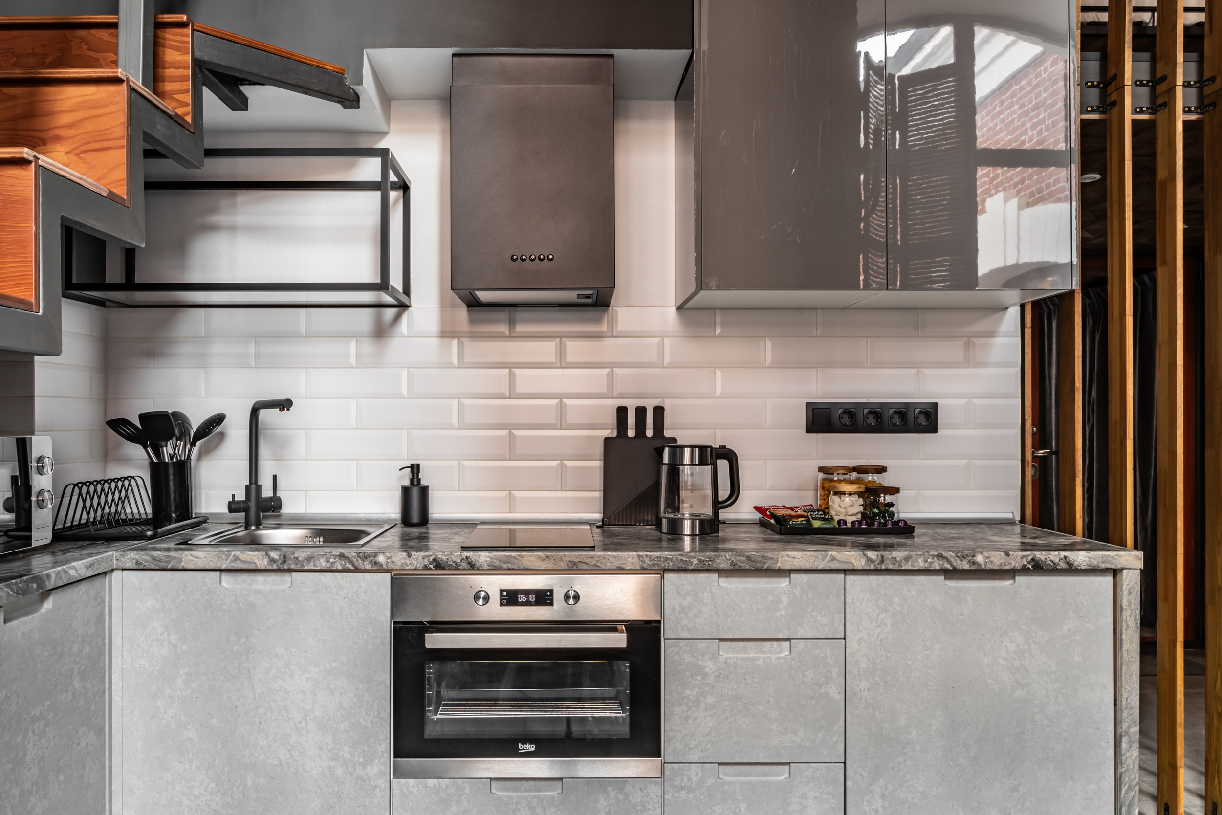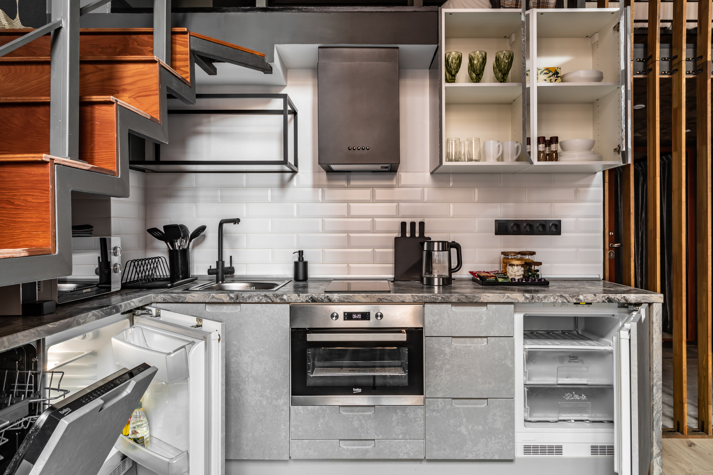 - вся необходимая бытовая техника: варочная панель, духовка, посудомоечная машина, холодильная камера, морозильная камера , капсульная кофемашина, чайник, бризер, фильтр для воды.