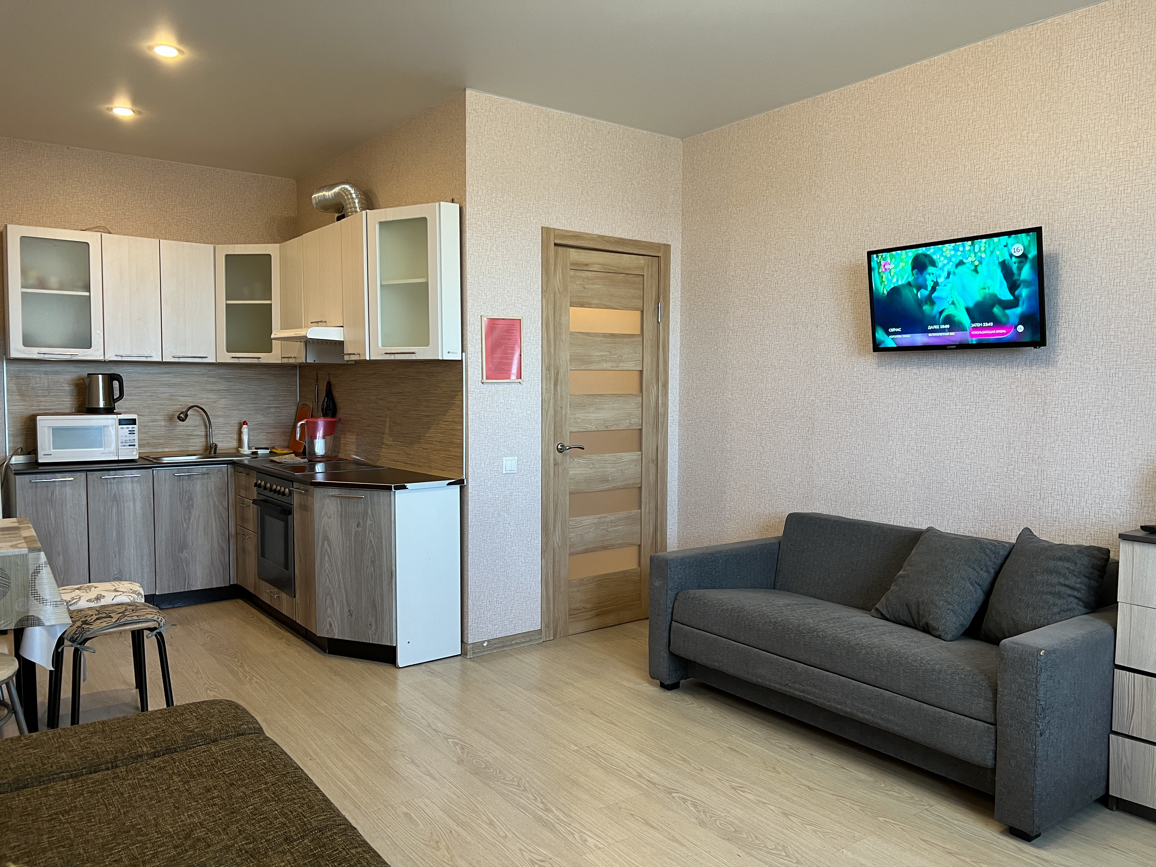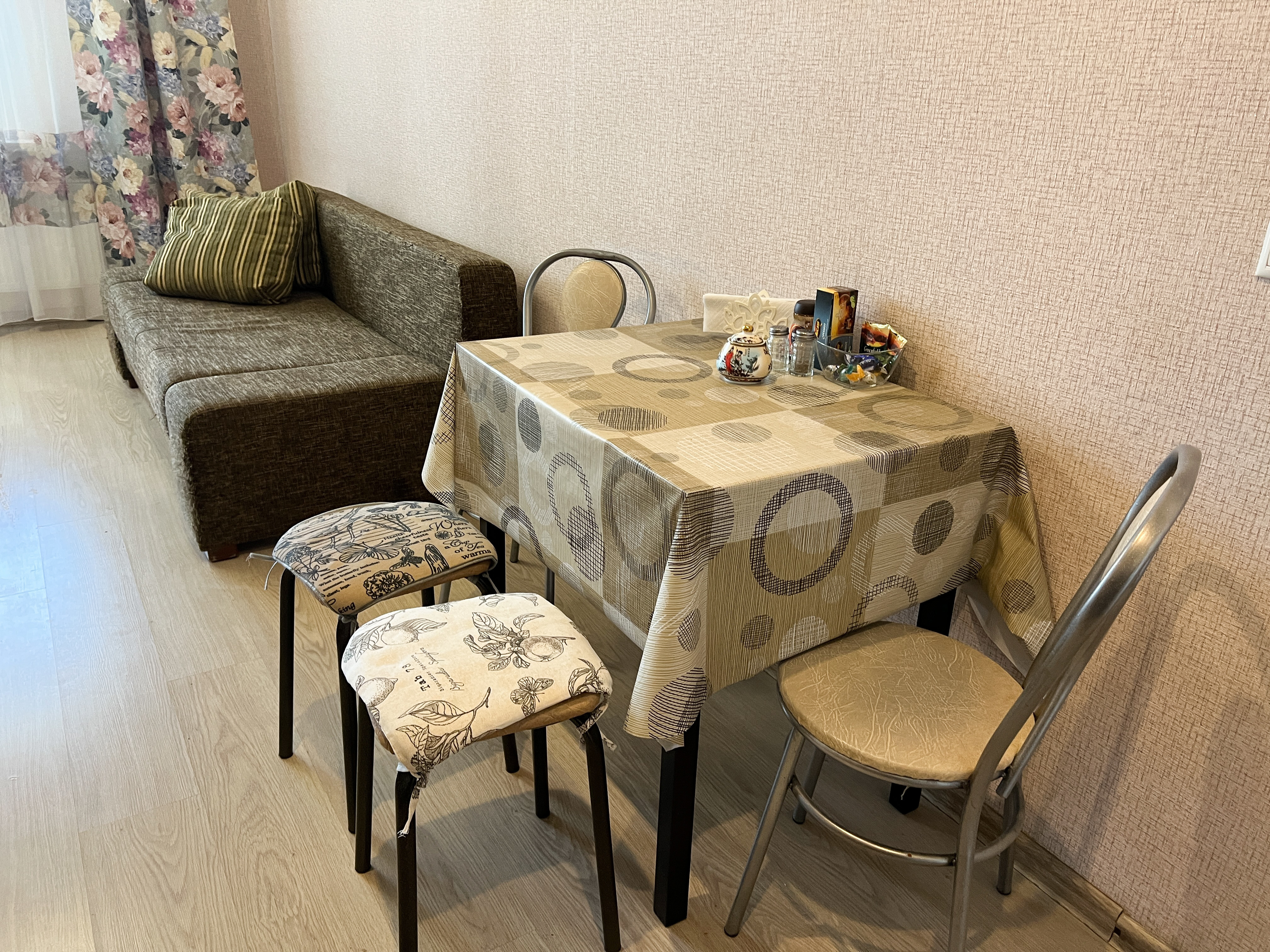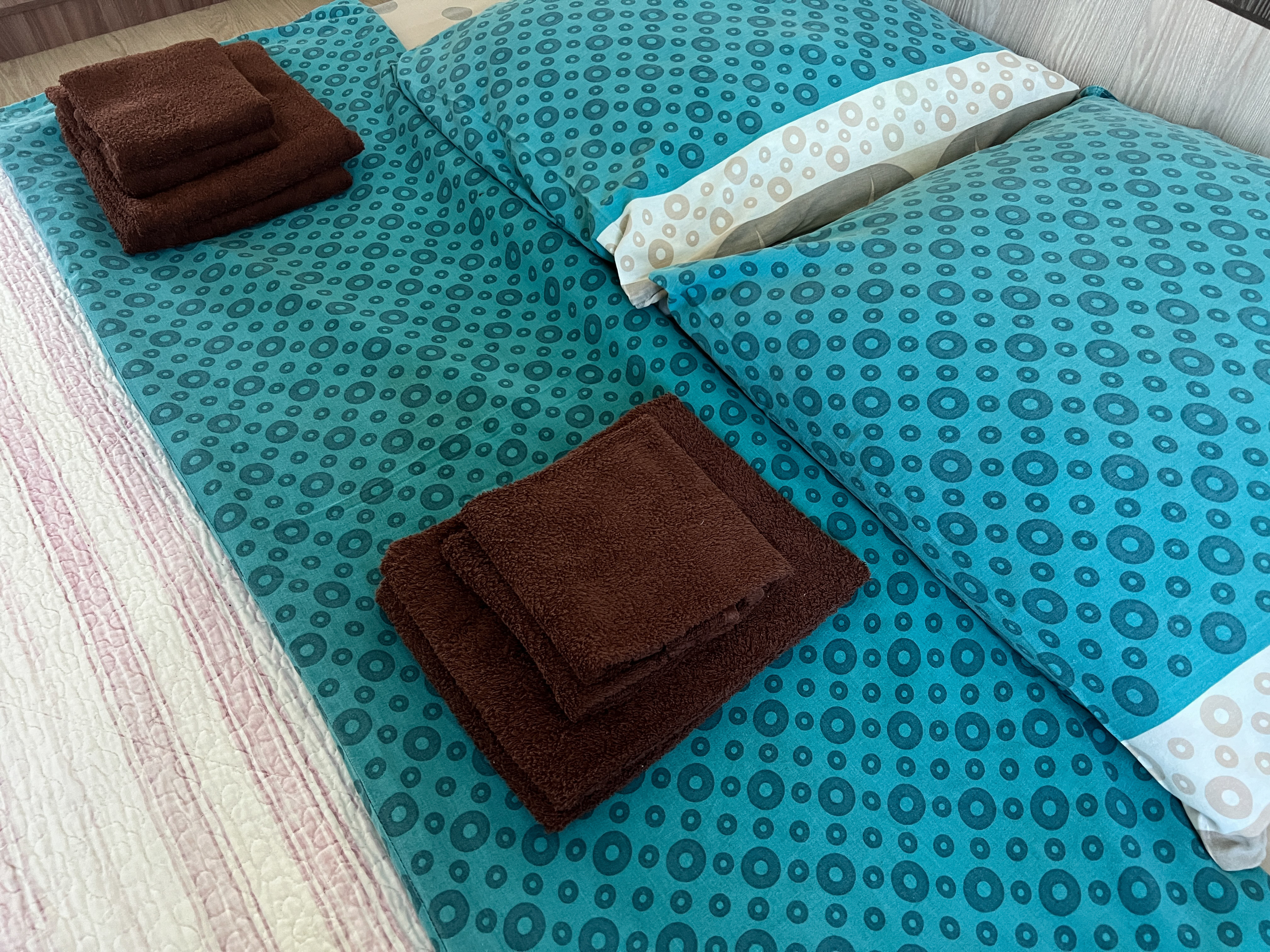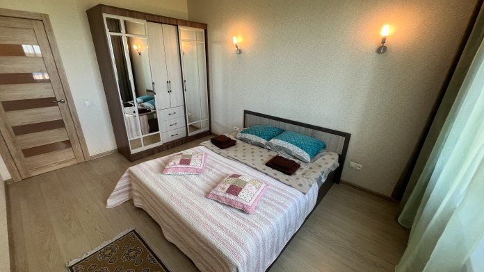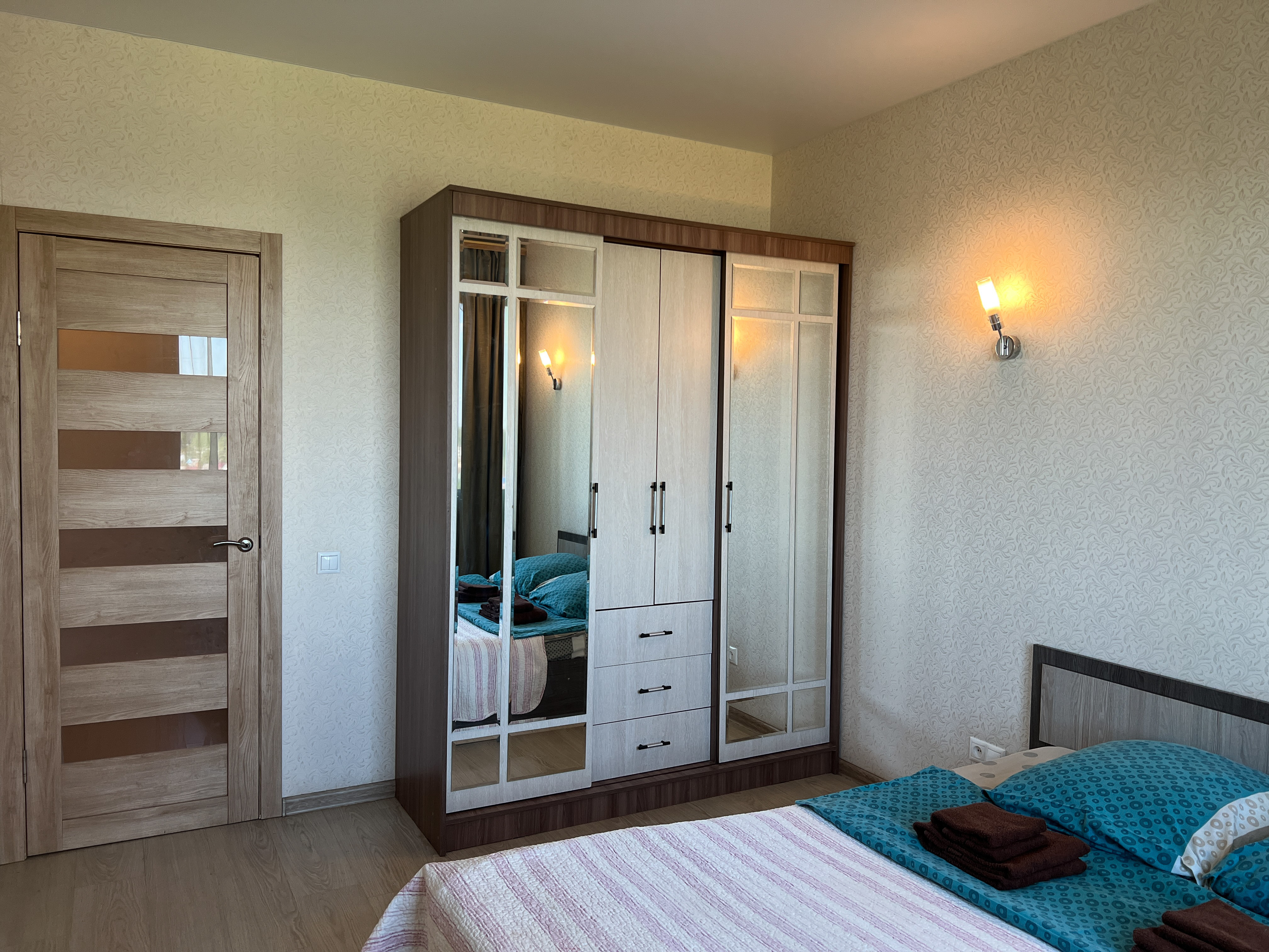 К услугам гостей спальня и гостиная совмещенная с кухней. В квартире 3 раздельных спальных места (двуспальная кровать и 2 дивана-кровати). Кухня полностью укомплектована для длительного проживания 6ти человек. Санузел совмещенный, имеются все принадлежности для стирки и глажки. Wi-Fi и и кабельное телевидение. С балкона открывается отличный вид.