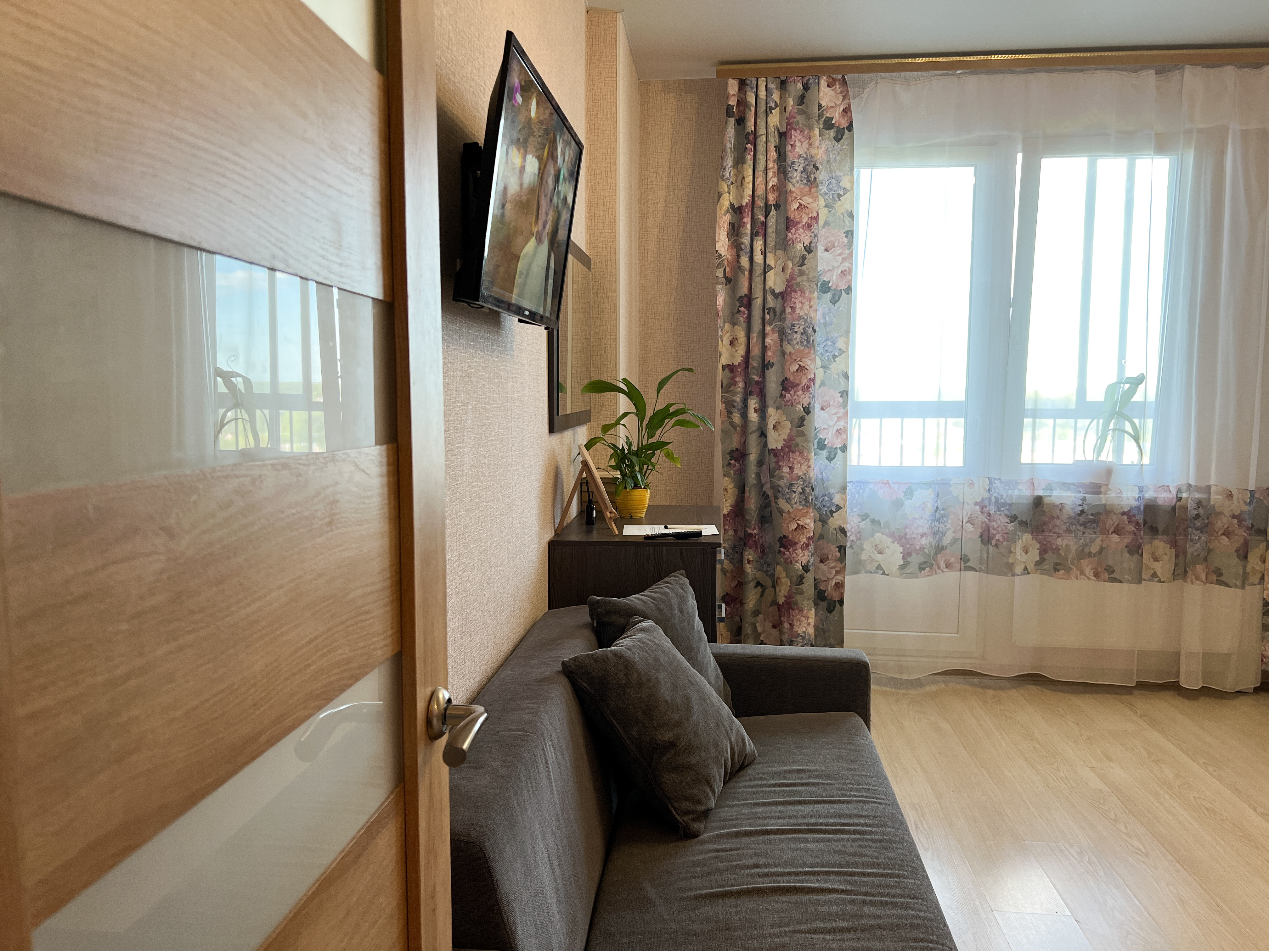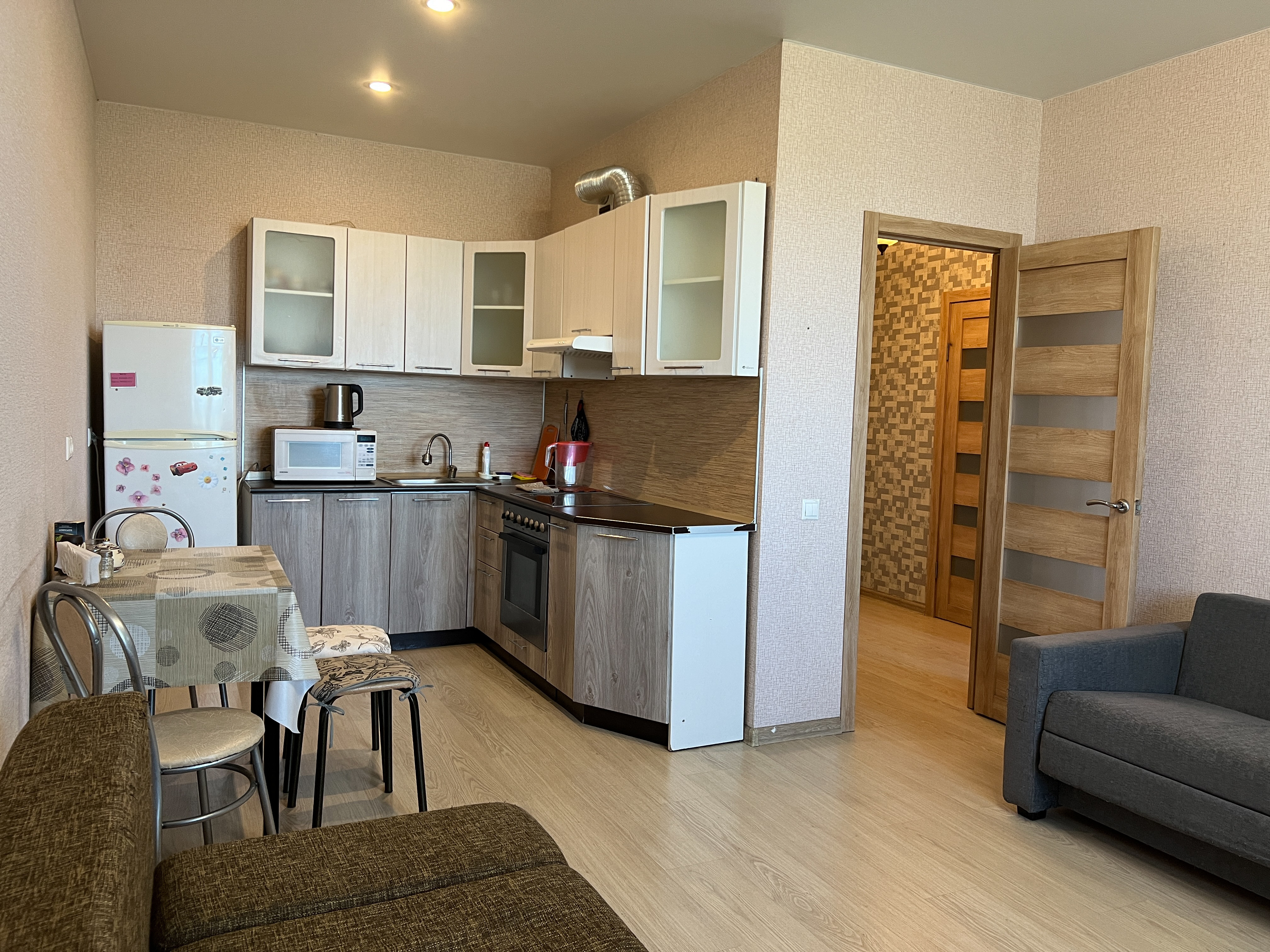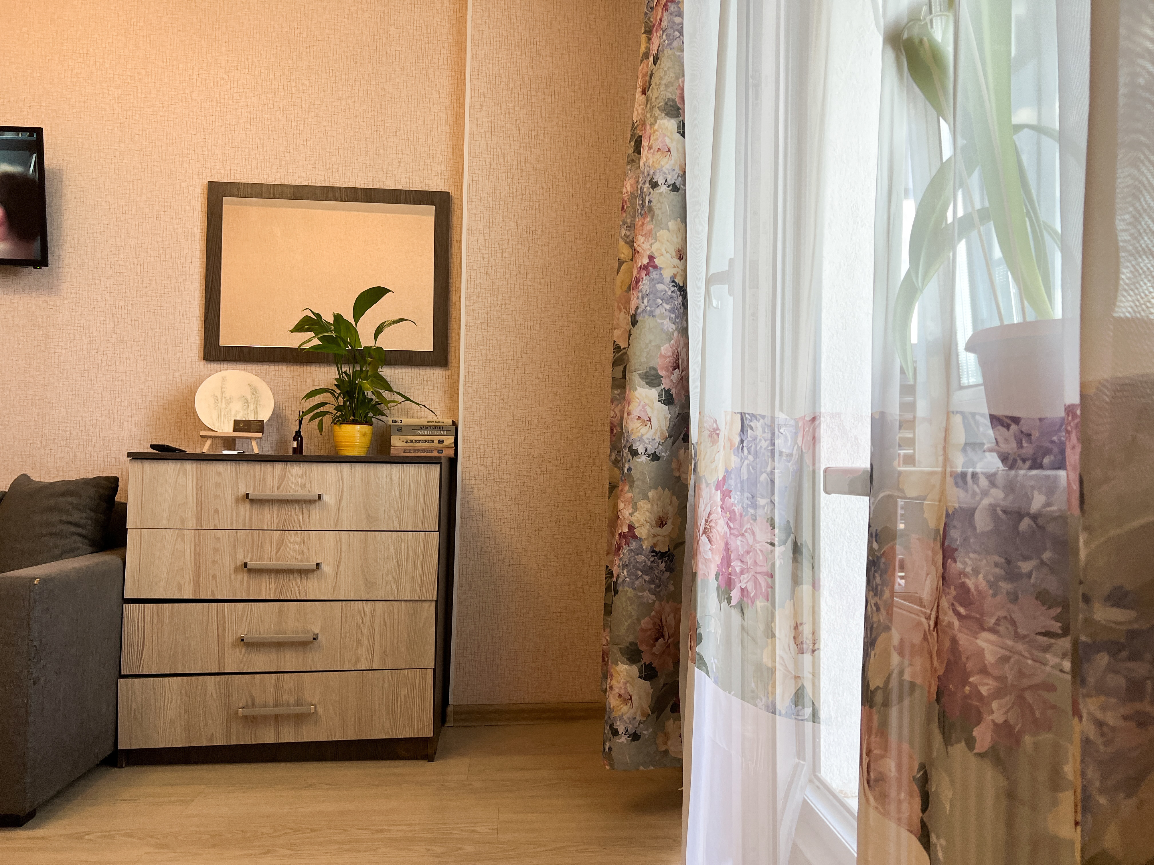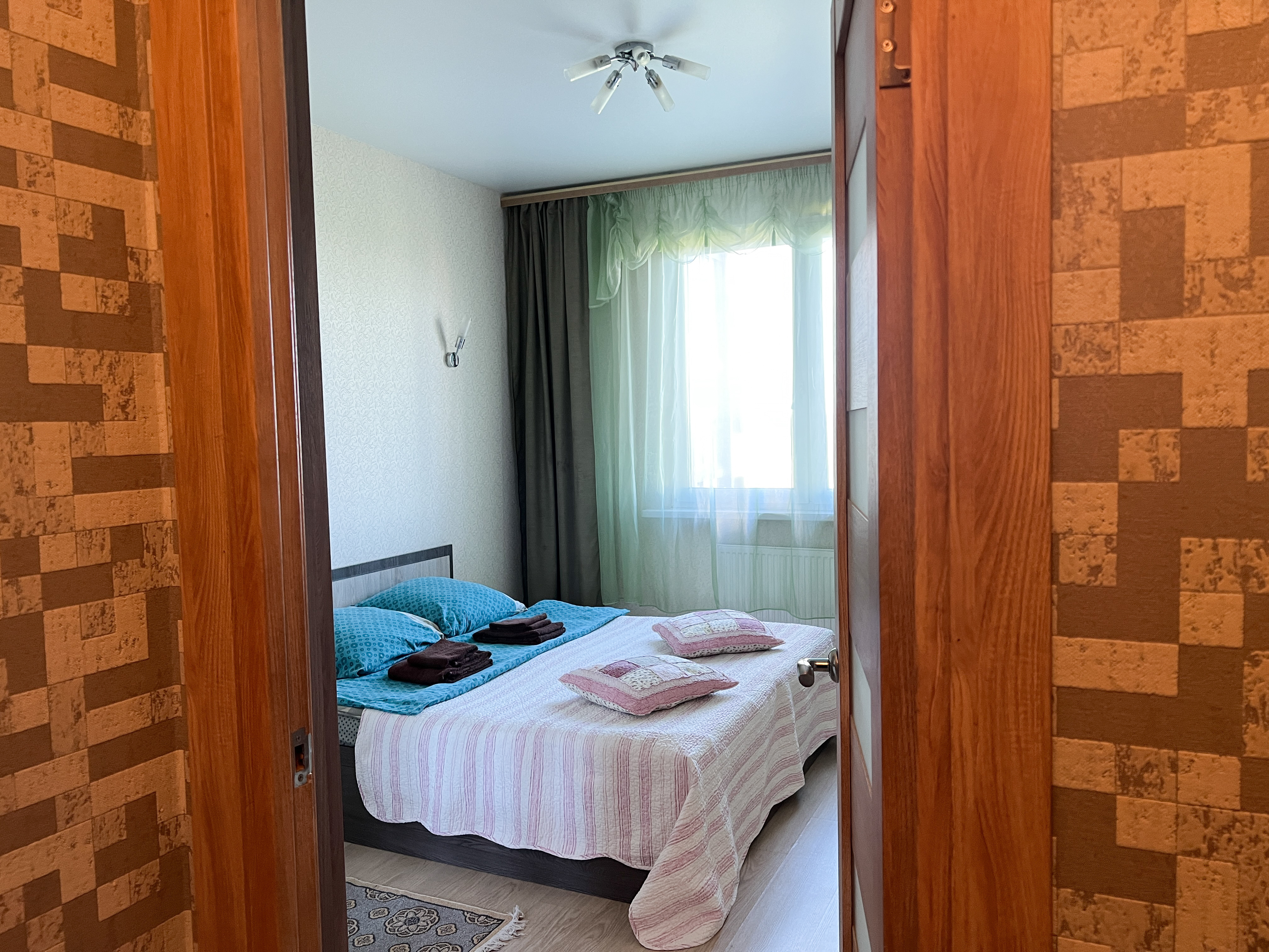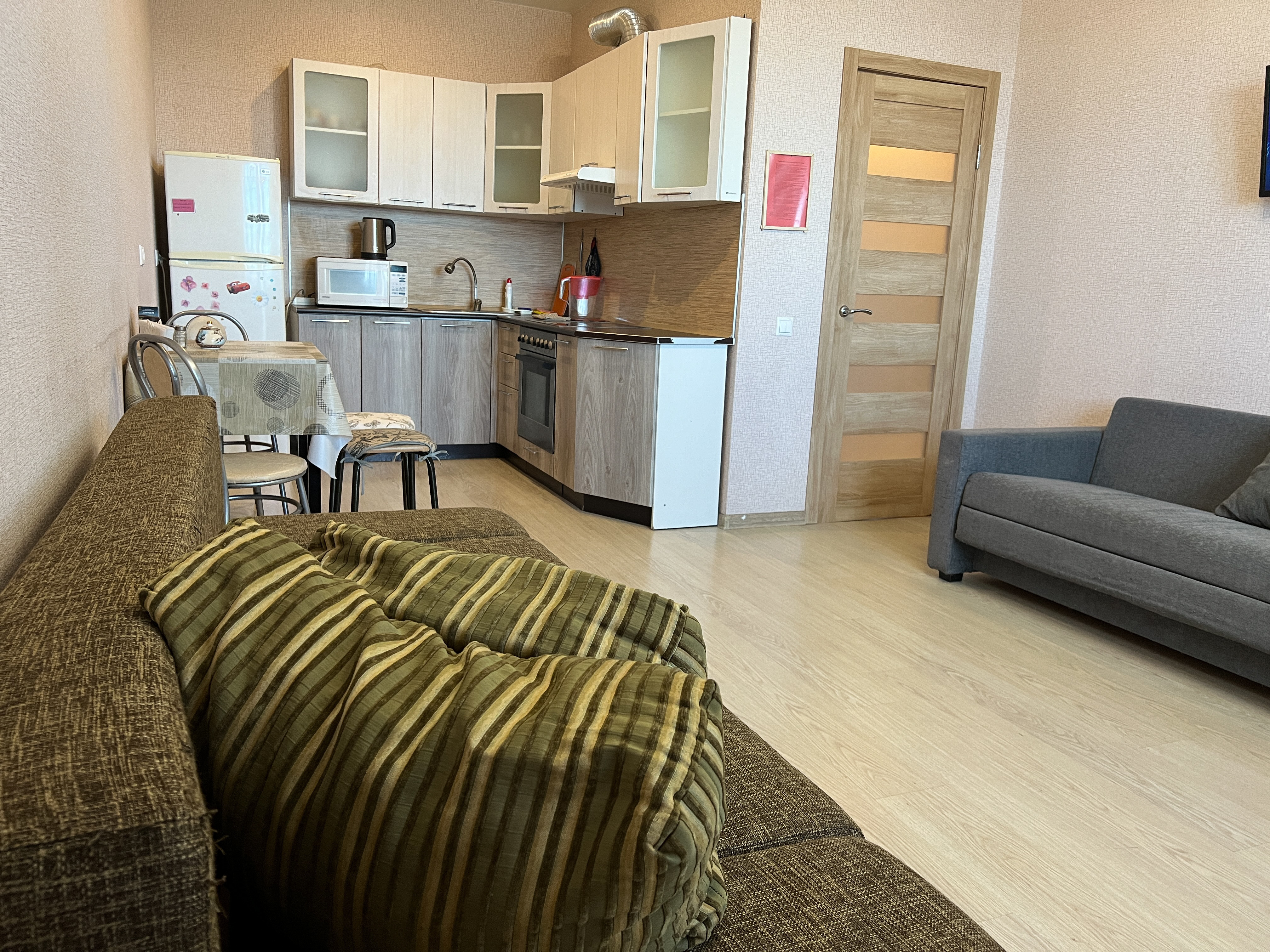 К услугам гостей спальня и гостиная совмещенная с кухней. В квартире 3 раздельных спальных места (двуспальная кровать и 2 дивана-кровати). Кухня полностью укомплектована для длительного проживания 6ти человек. Санузел совмещенный, имеются все принадлежности для стирки и глажки. Wi-Fi и и кабельное телевидение. С балкона открывается отличный вид.