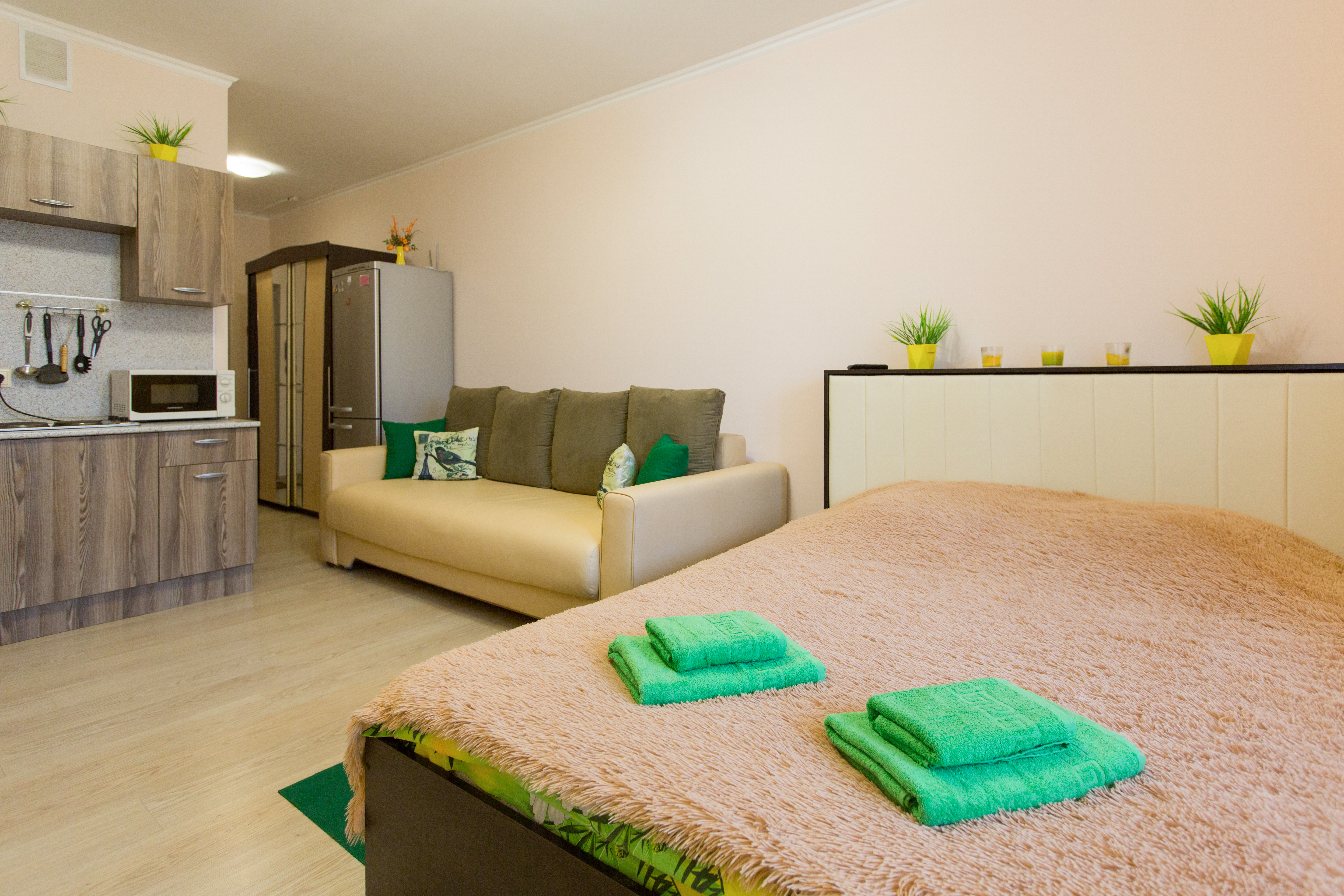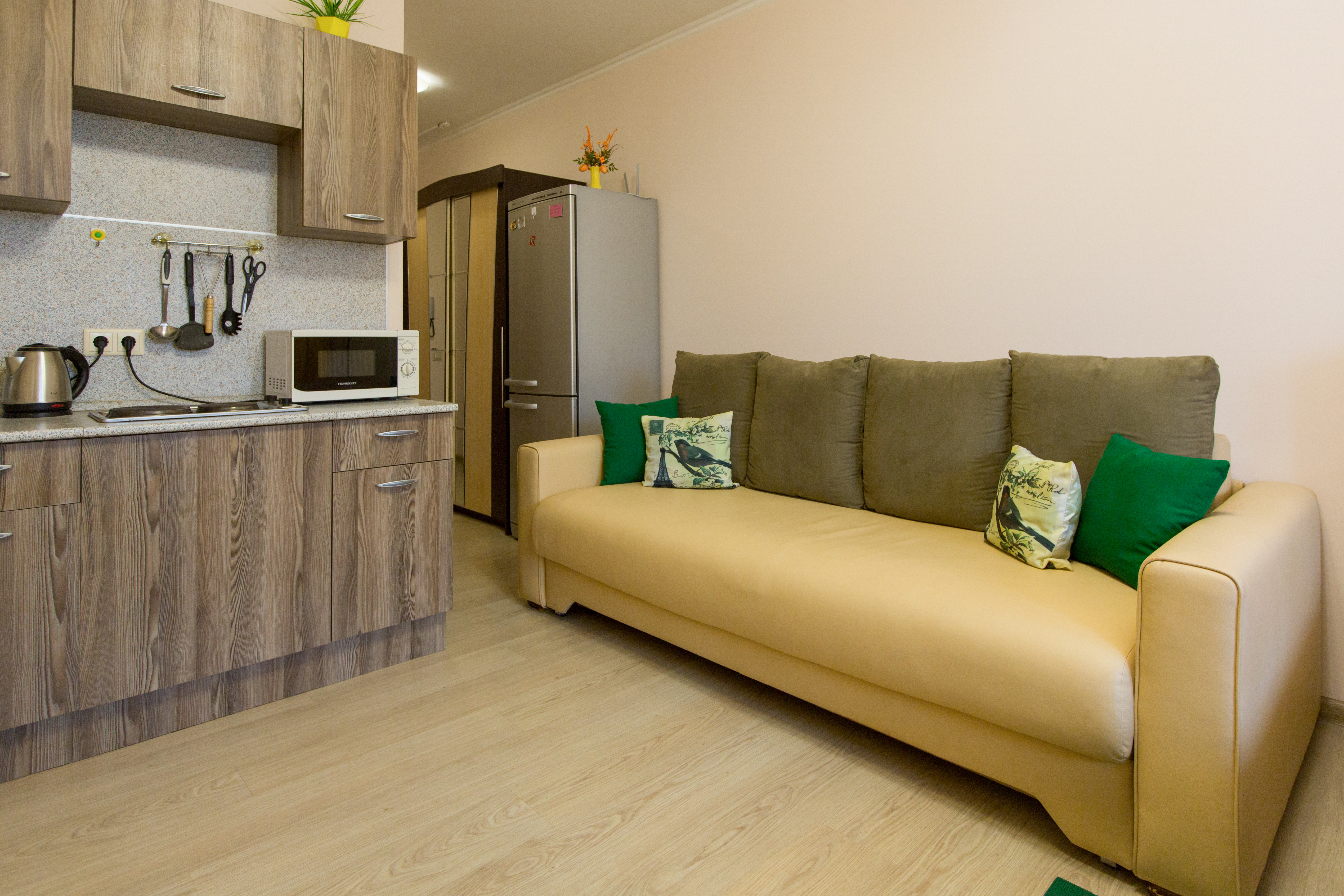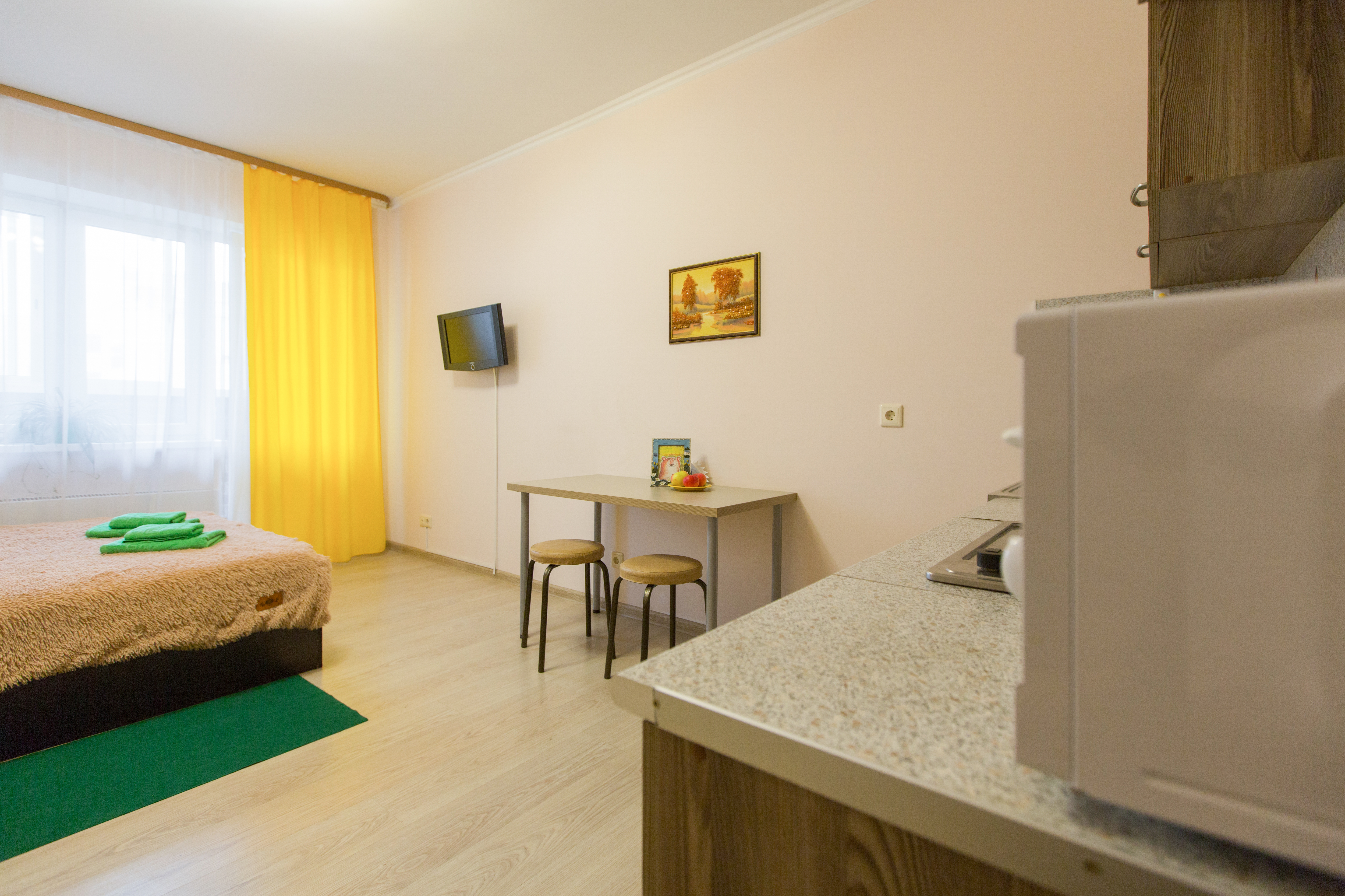 Квартира полностью укомплектована для проживания 4-х человек. Для гостей имеется двуспальная кровать и двухместный раскладной диван, а так же кухонная зона, включающая всё необходимое для приготовления пищи. Санузел совмещенный. В квартире есть всё для стирки и глажки белья, а так же фен, постельное бель, полотенца и тапочки. Работает Wi-Fi и кабельное телевидение.