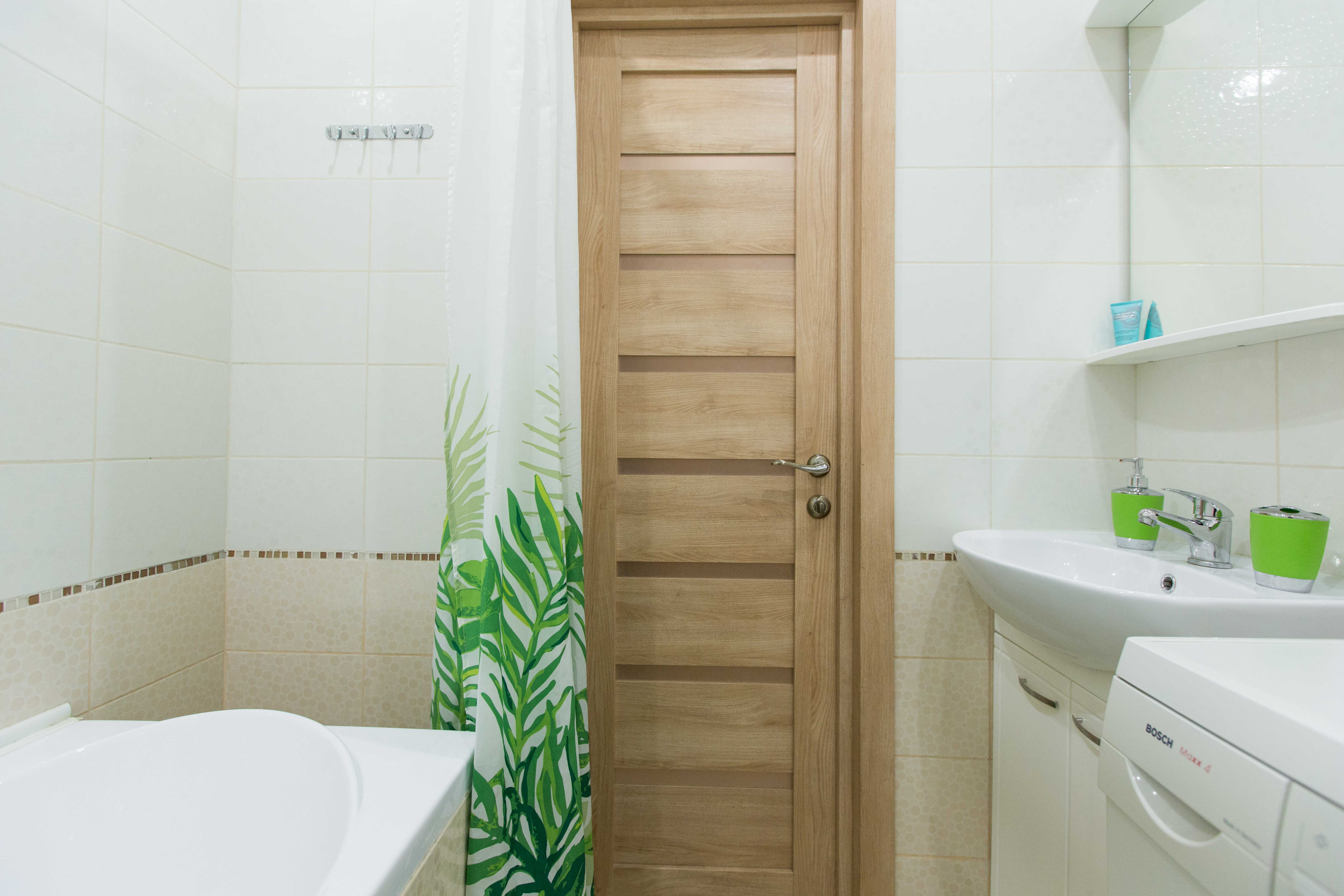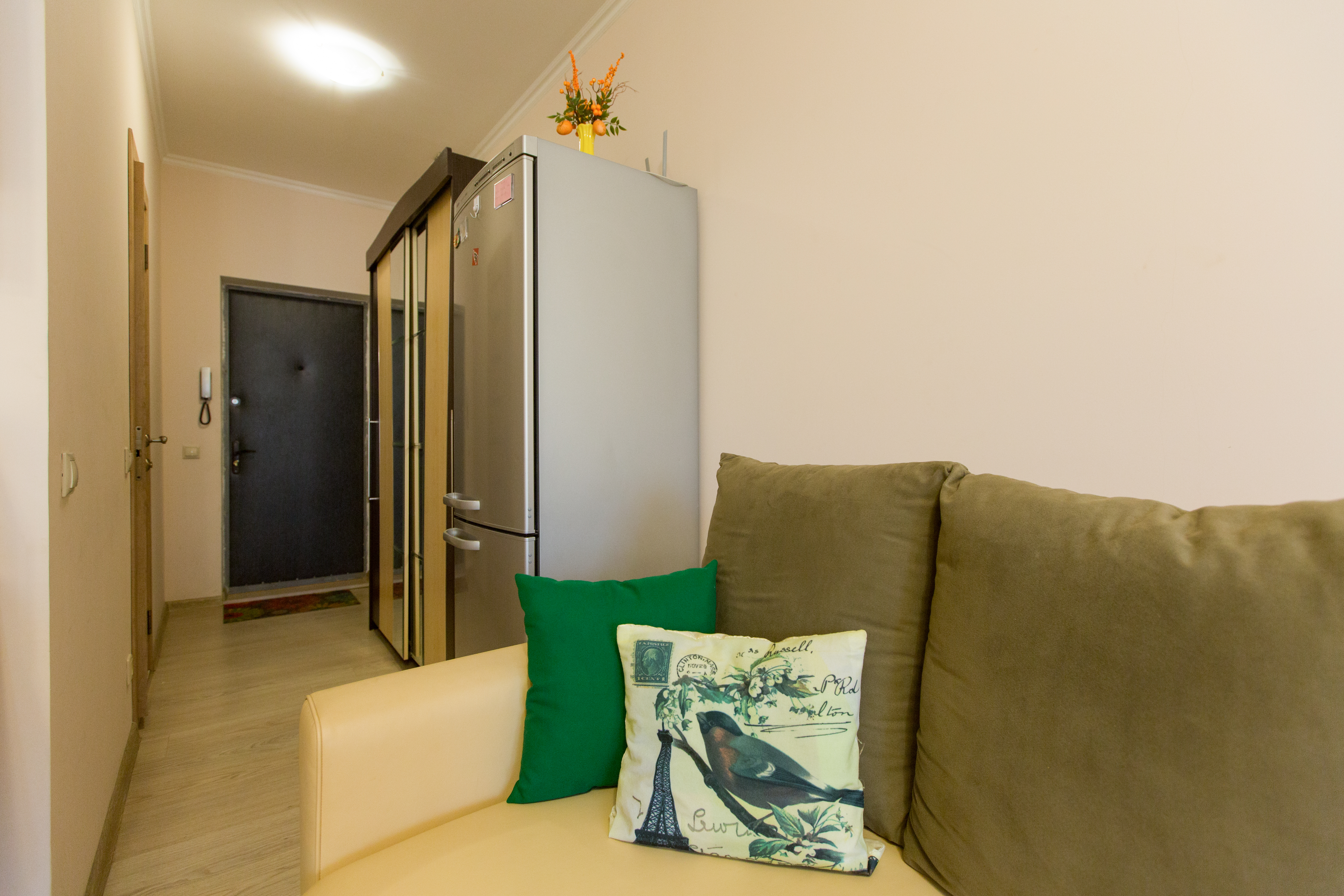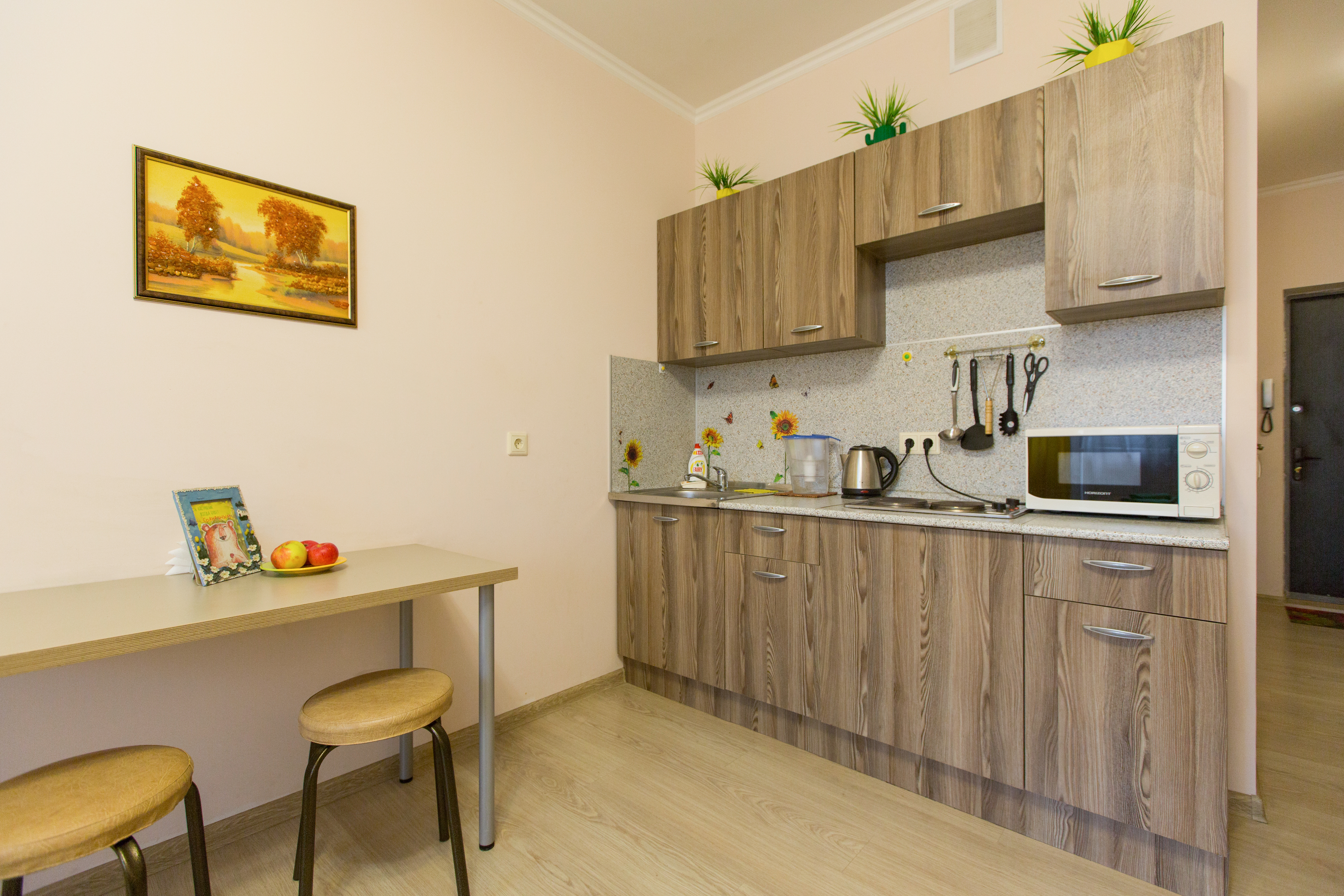 Квартира полностью укомплектована для проживания 4-х человек. Для гостей имеется двуспальная кровать и двухместный раскладной диван, а так же кухонная зона, включающая всё необходимое для приготовления пищи. Санузел совмещенный. В квартире есть всё для стирки и глажки белья, а так же фен, постельное бель, полотенца и тапочки. Работает Wi-Fi и кабельное телевидение.