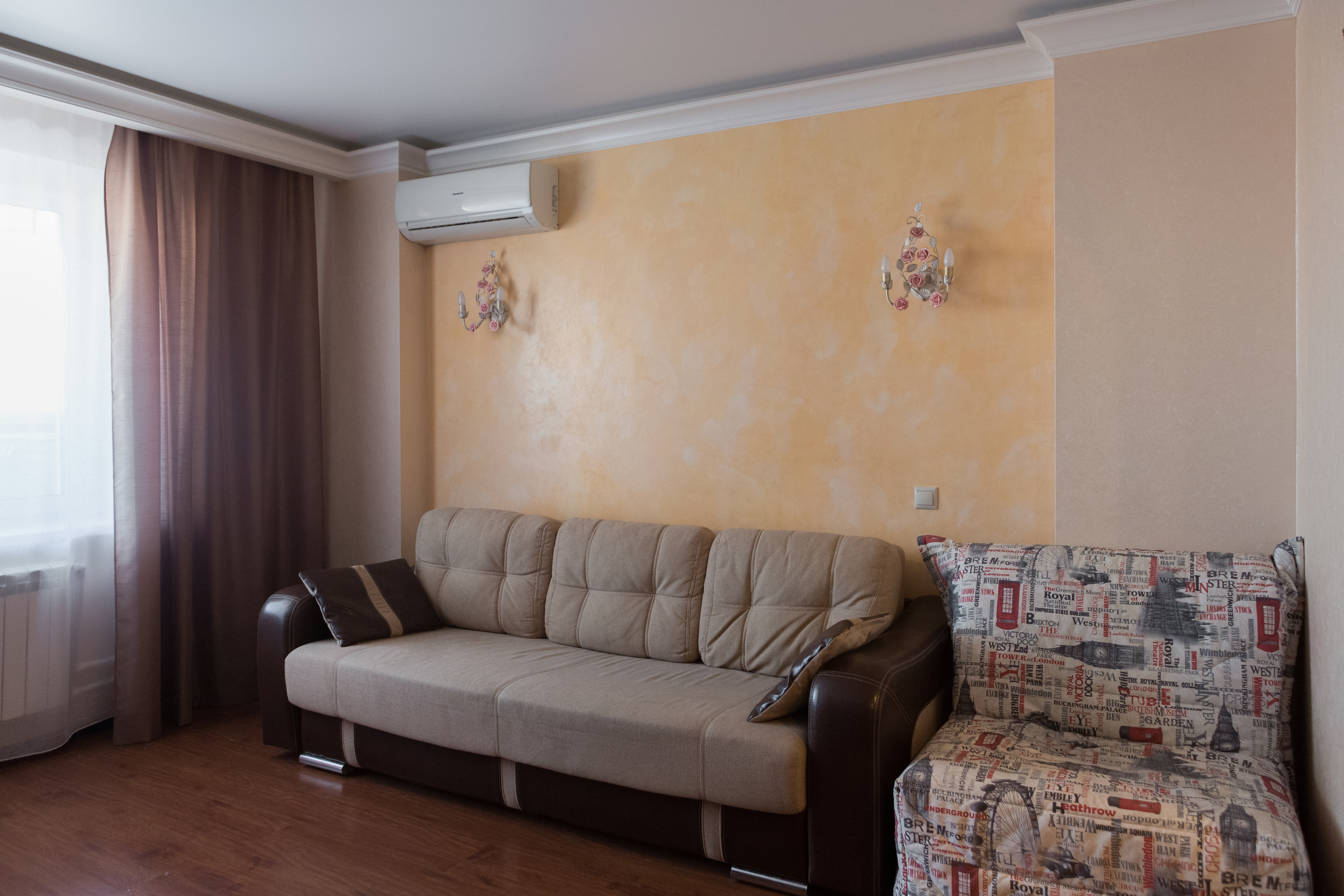 Квартира полностью укомплектована для проживания 6 человек. Новый ремонт. В доме работает лифт. В квартире имеется двуспальный диван, двуспальная кровать и два односпальных кресла-кровати. Кухня оборудована всем необходимым для приготовления вкусных обедов. Санузел совмещенный, для гостей предоставляется фен, полотенца, одноразовые тапочки и средства для душа. На период ежегодного отключения горячей воды работает водонагреватель. Приятным бонусом будет наличие кондиционера.
