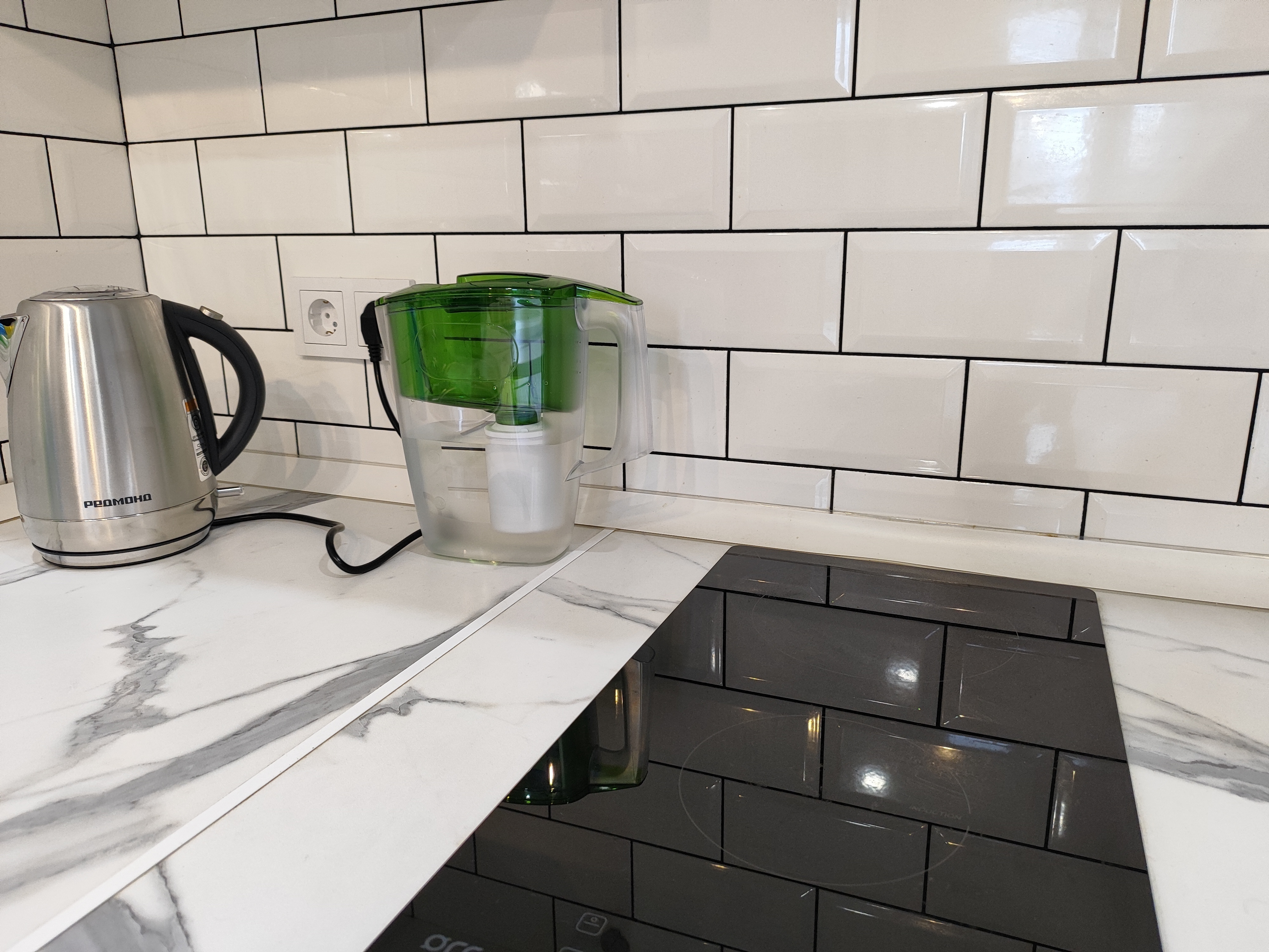 На кухне электрочайник, микроволновка, холодильник, духовой шкаф, электроплита. Приятное освещение. Есть телевизор. Раскладной диван.