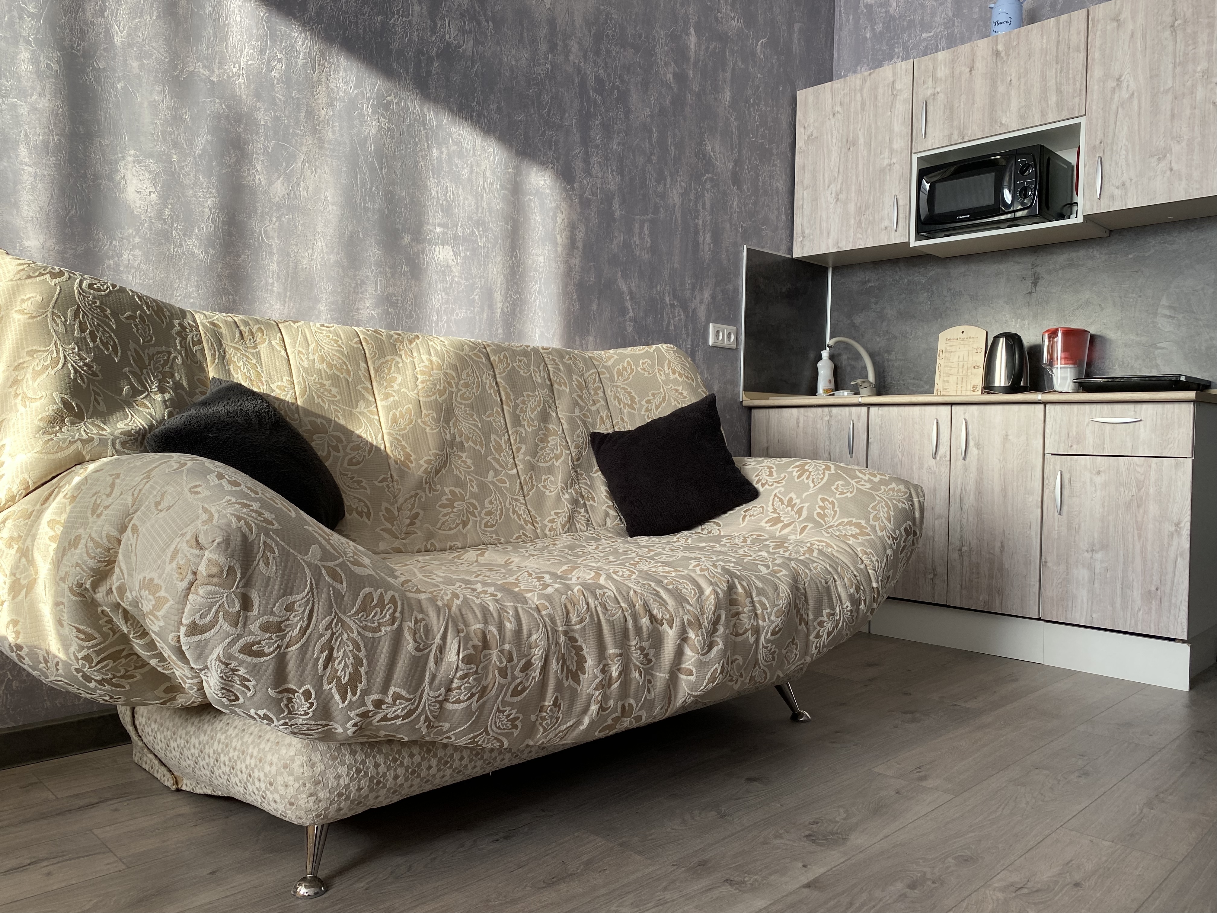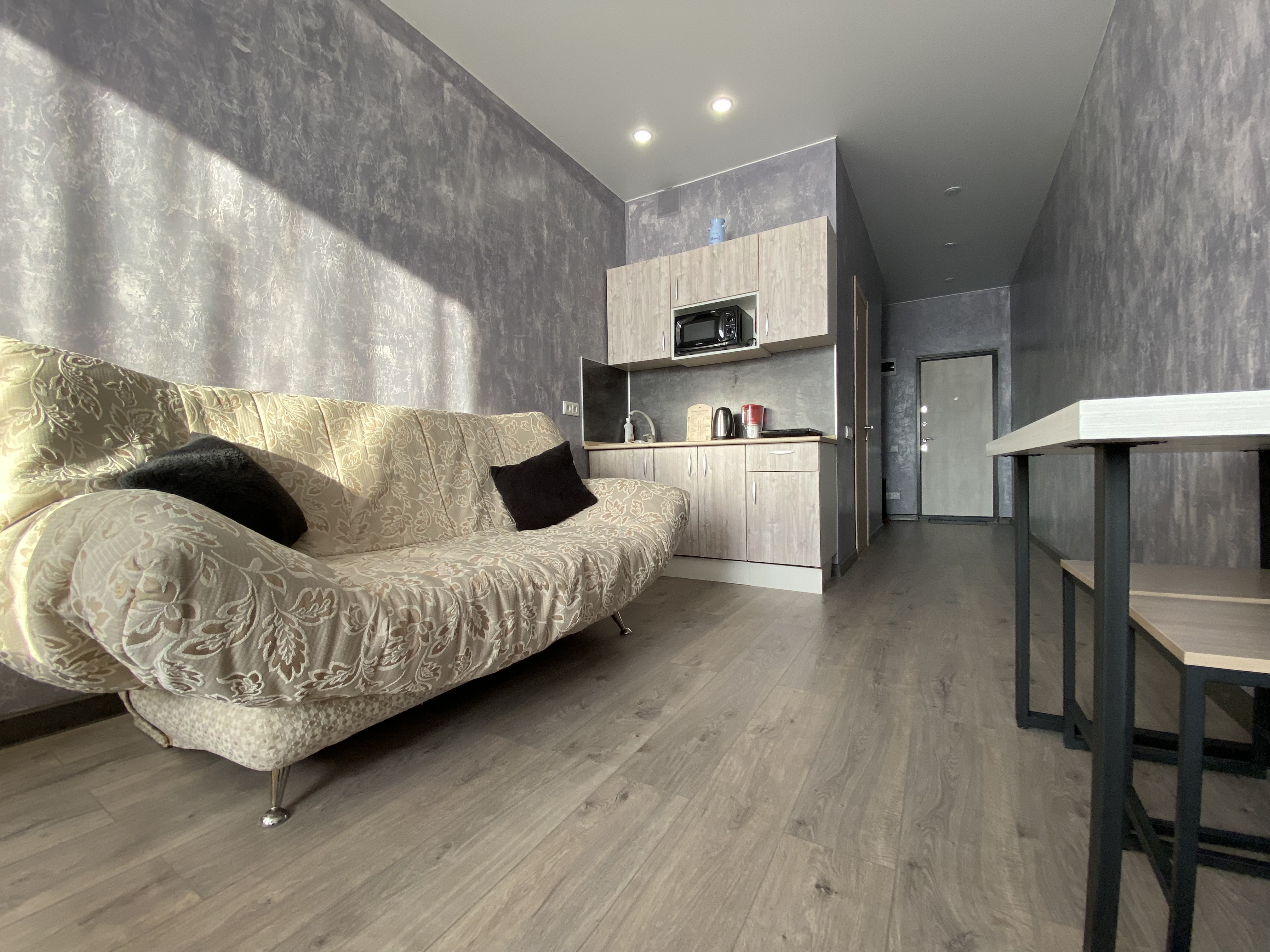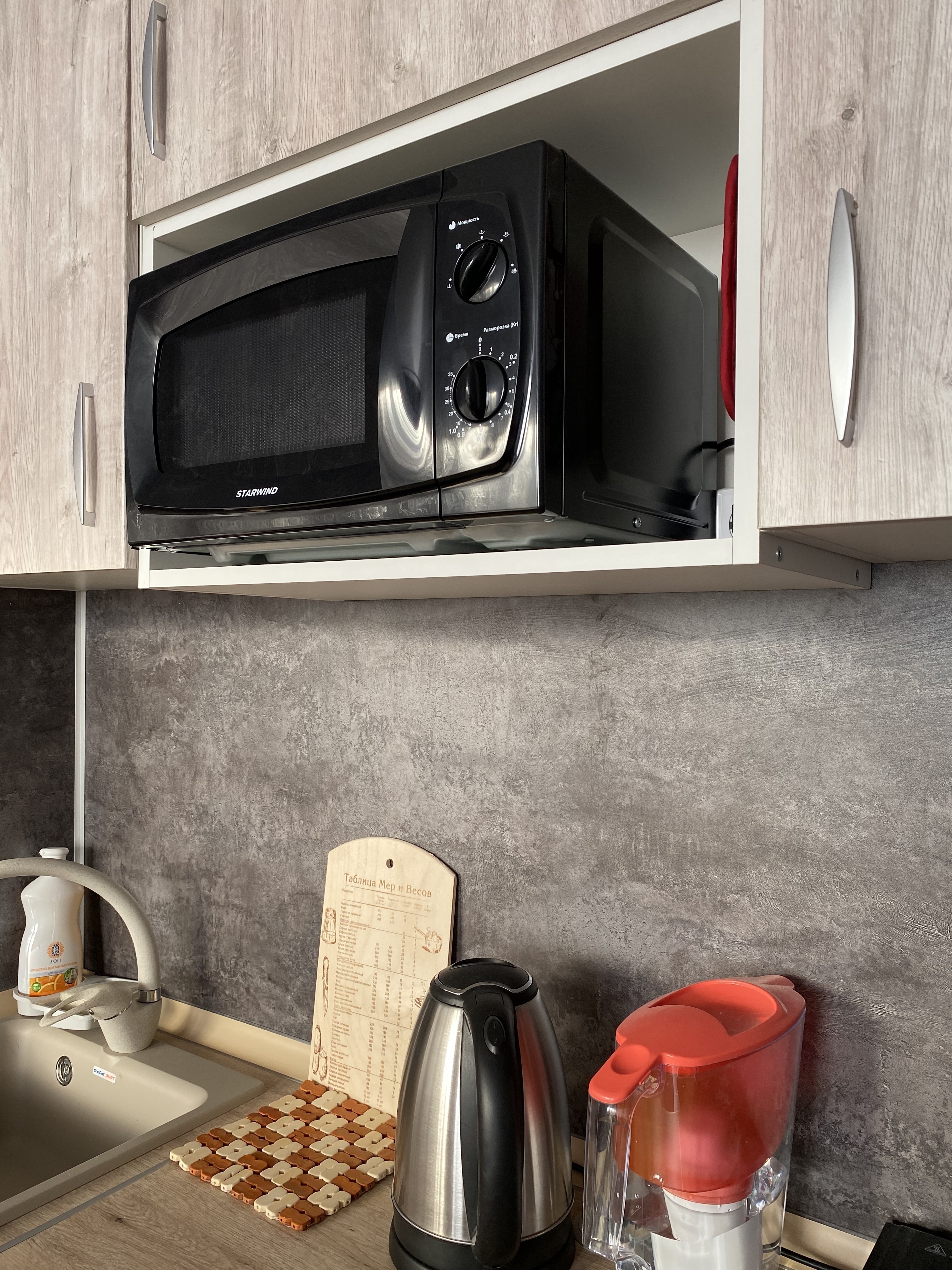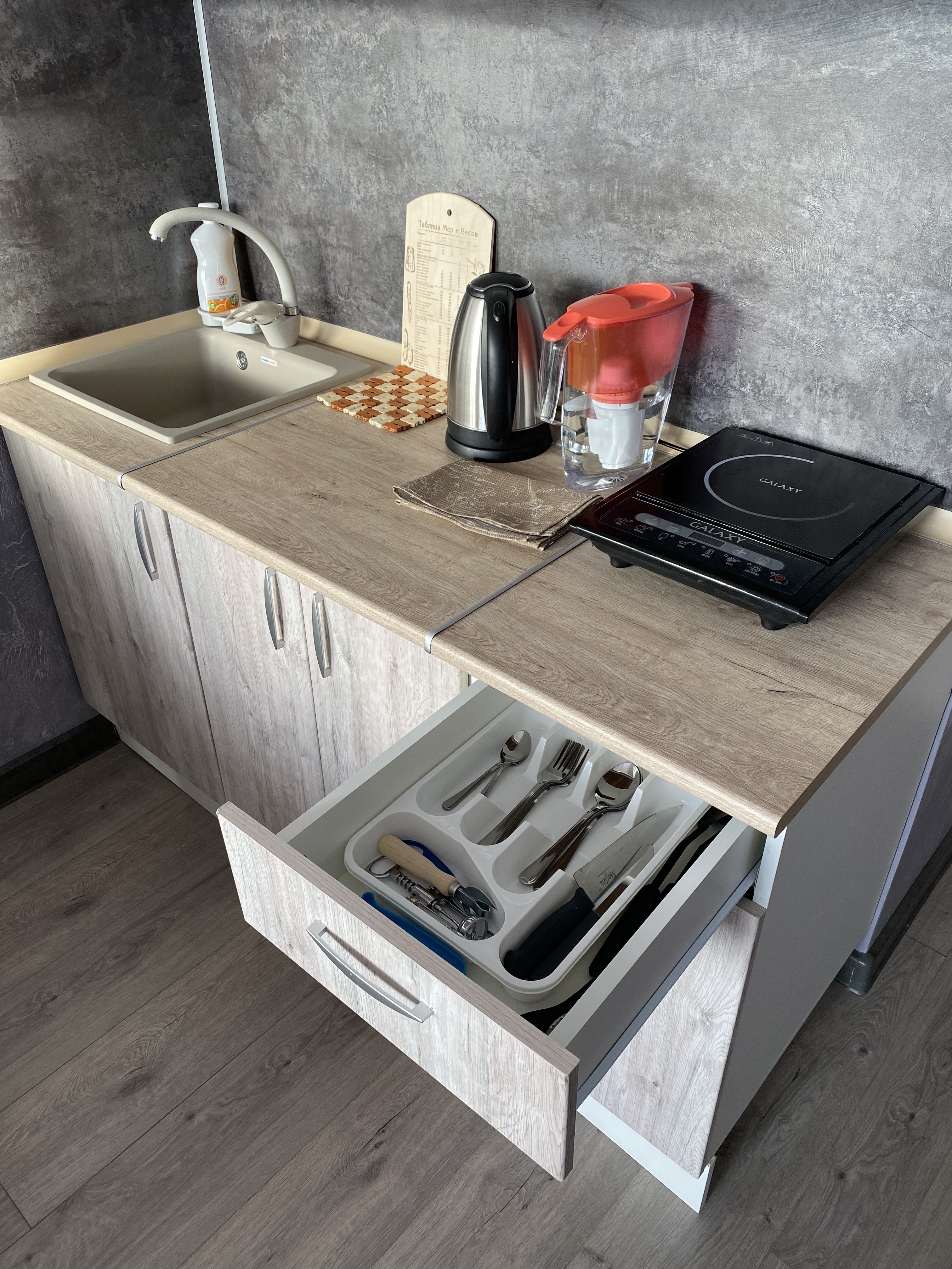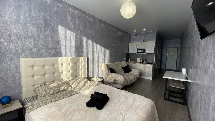 - Это полноценные квартиры-студии, которые укомплектованы кухонной зоной, на которой есть всё необходимое для приготовления пищи, собственной ванной комнатой со стиральной машинкой, феном и гладильными принадлежностями.