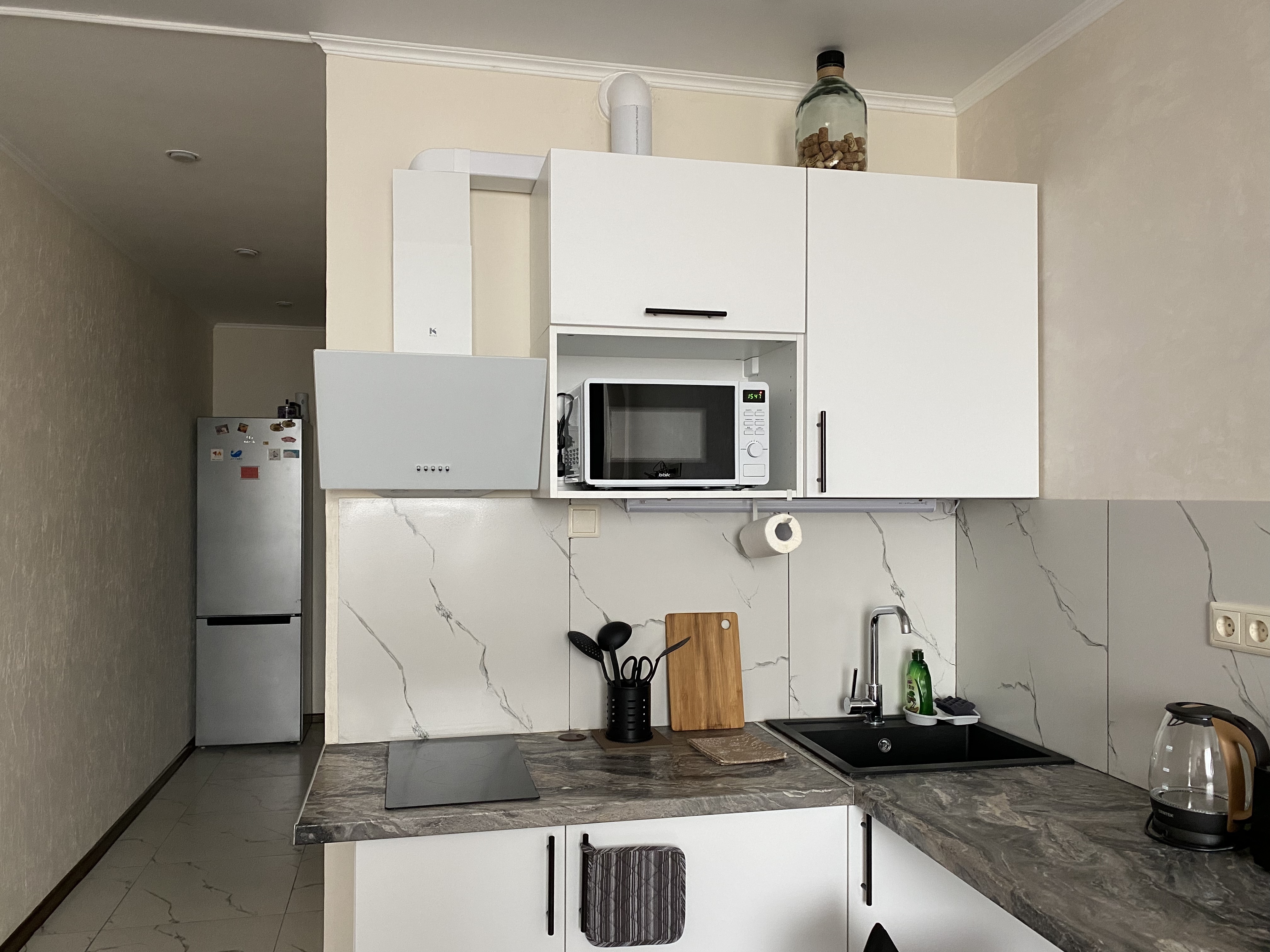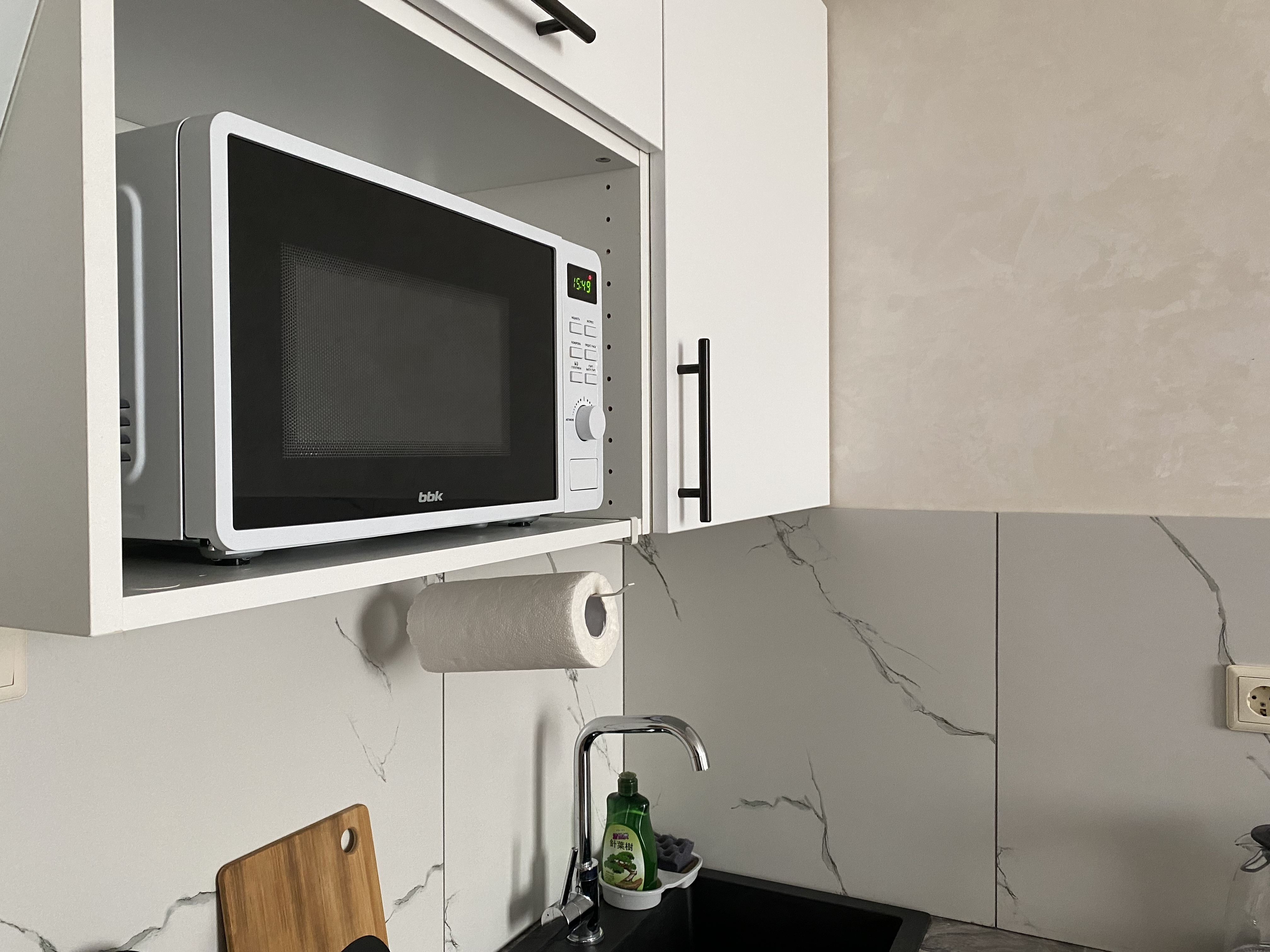 - Это полноценные квартиры-студии, которые укомплектованы кухонной зоной, на которой есть всё необходимое для приготовления пищи, собственной ванной комнатой со стиральной машинкой, феном и гладильными принадлежностями.