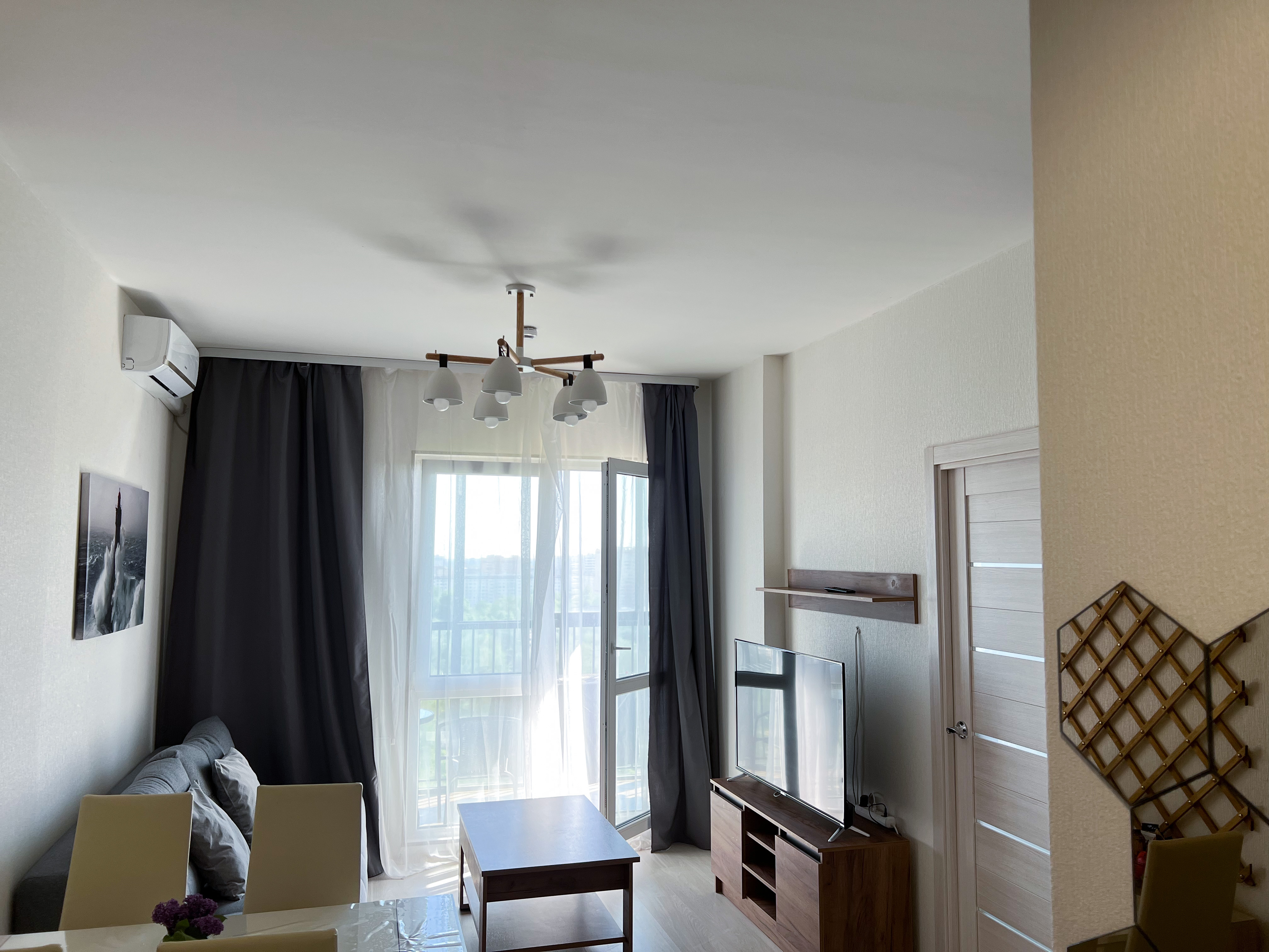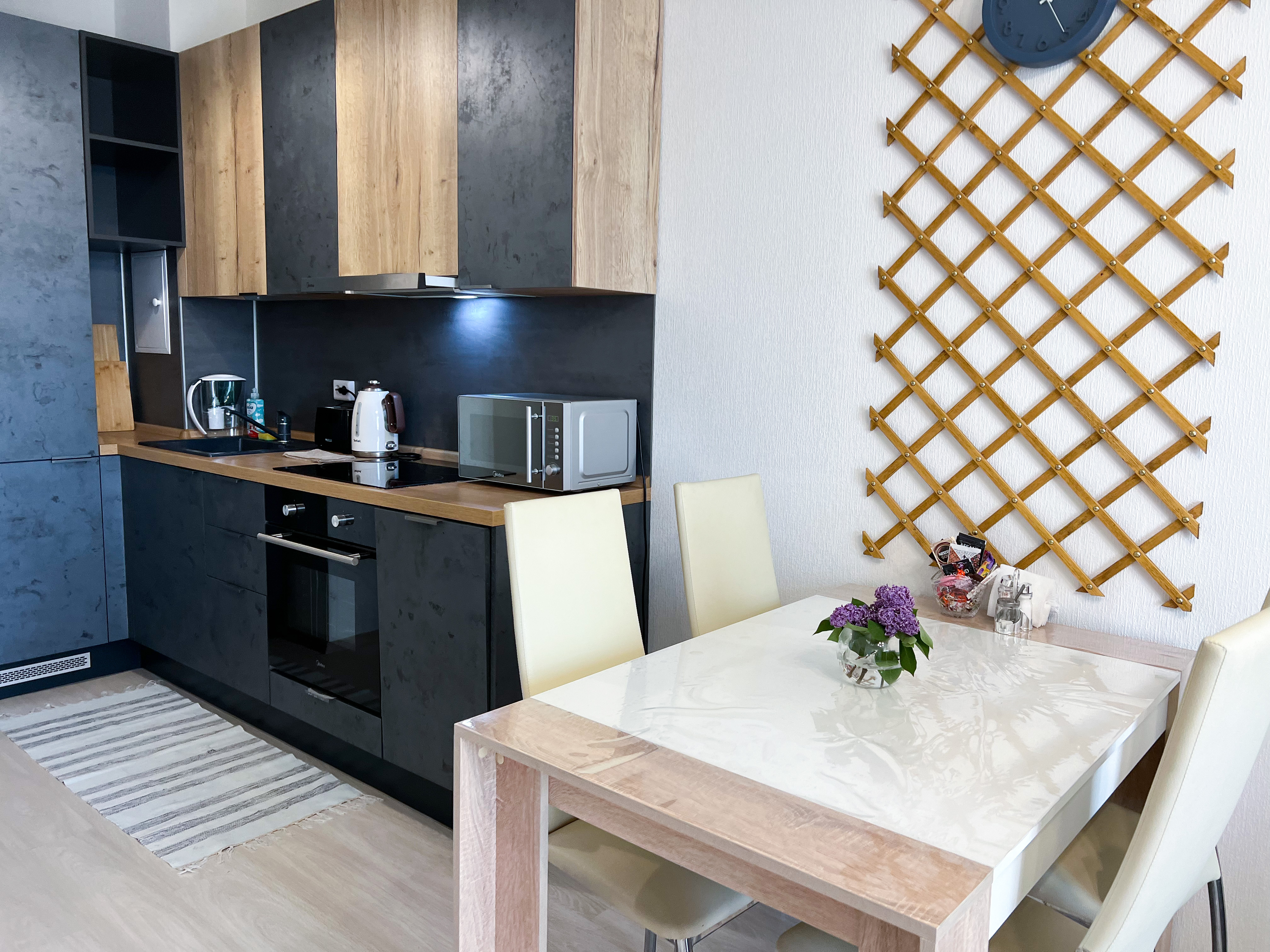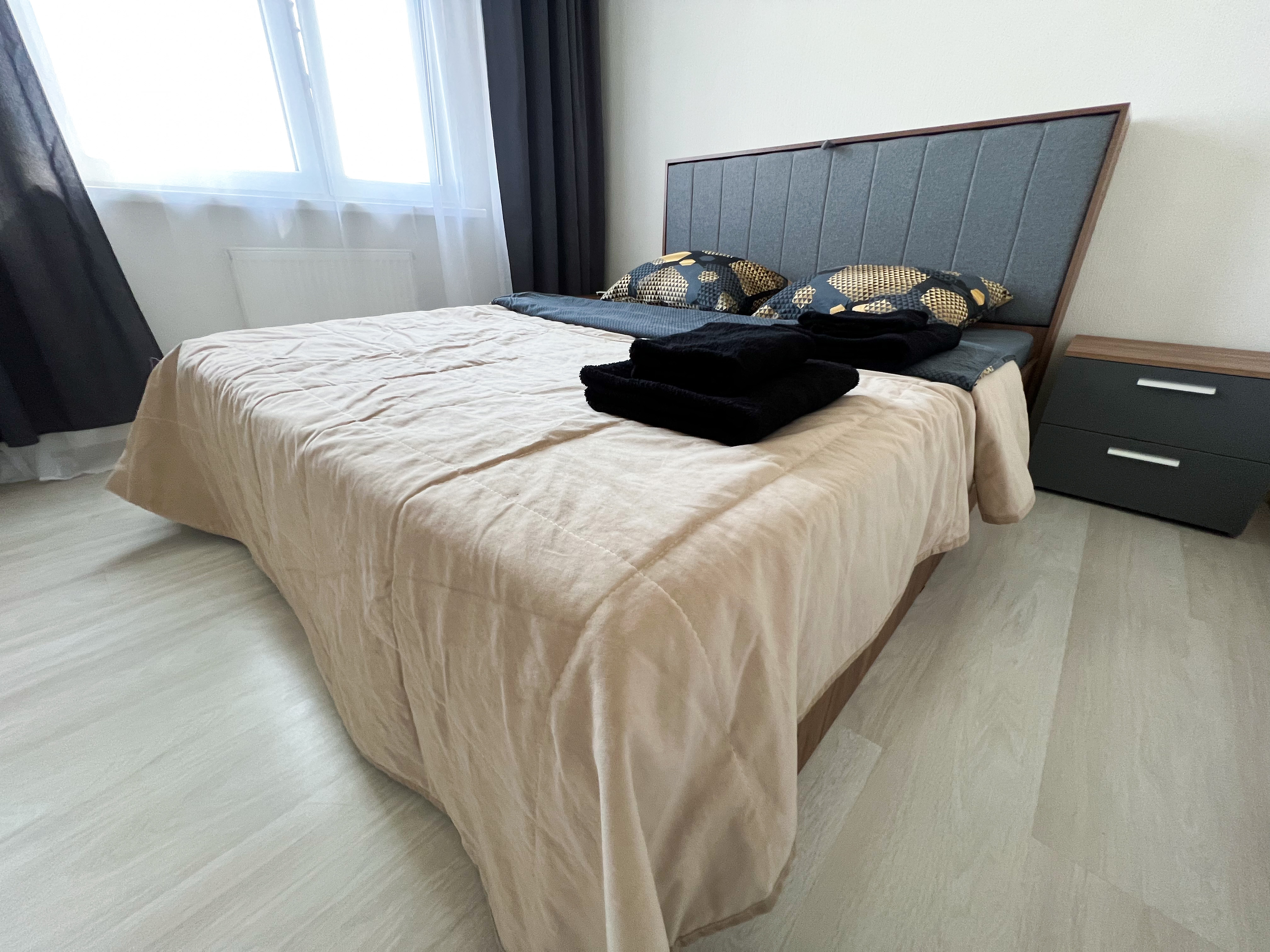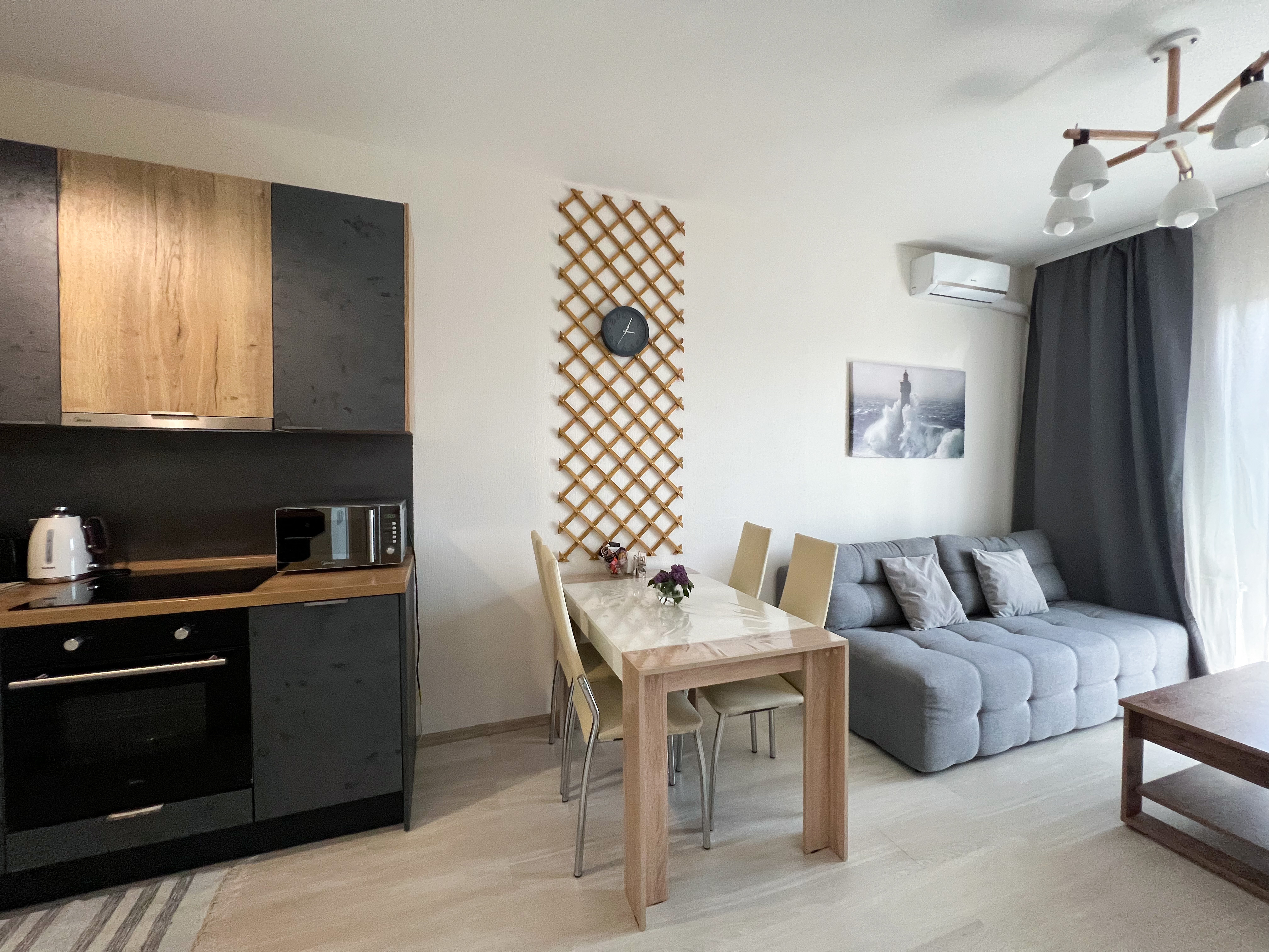 Квартира полностью укомплектована для проживания 4 человек. Современный новый ремонт в стиле лофт. В квартире имеется двуспальный диван и двуспальная кровать. Кухонная зона оборудована холодильником, TV, СВЧ. Приятным бонусом для гостей будет наличие кондиционера и посудомоечной машины. Ванная комната с душевой кабиной укомплектована стиральной машинкой, утюгом, феном. Есть WI-FI. В доме работает лифт. На балконе оборудована зона отдыха с прекрасным видом на город. Каждому клиенту предоставляется комплект постельного белья, полотенца, одноразовые тапочки, коврик в ванную.