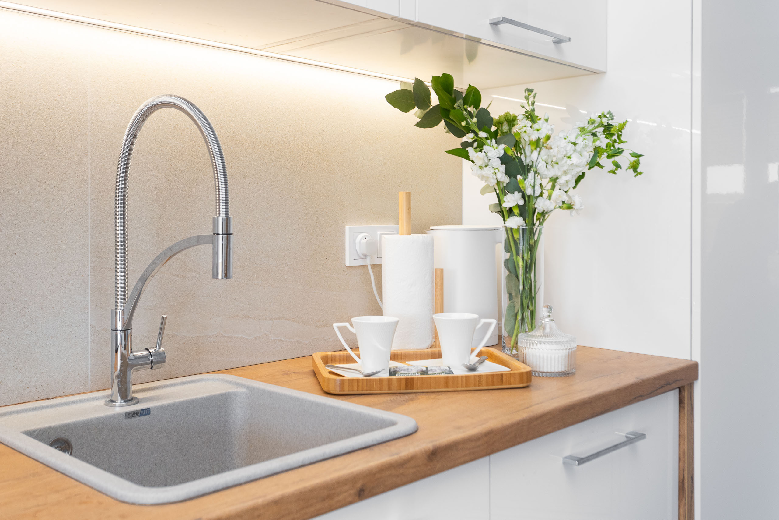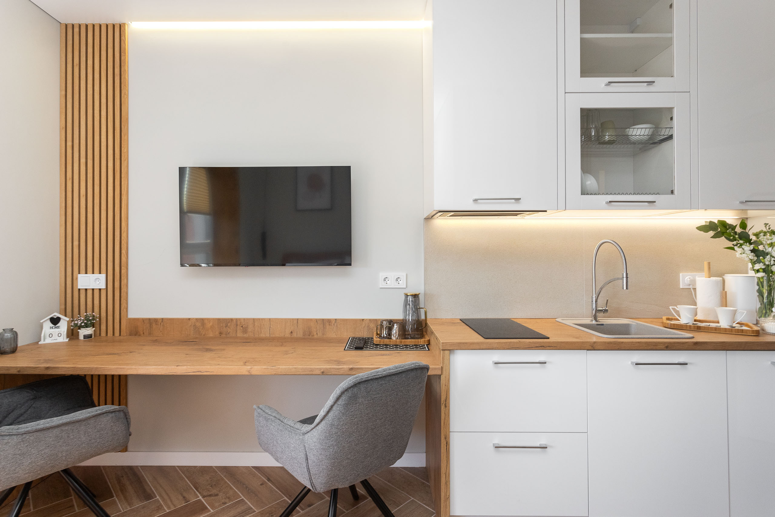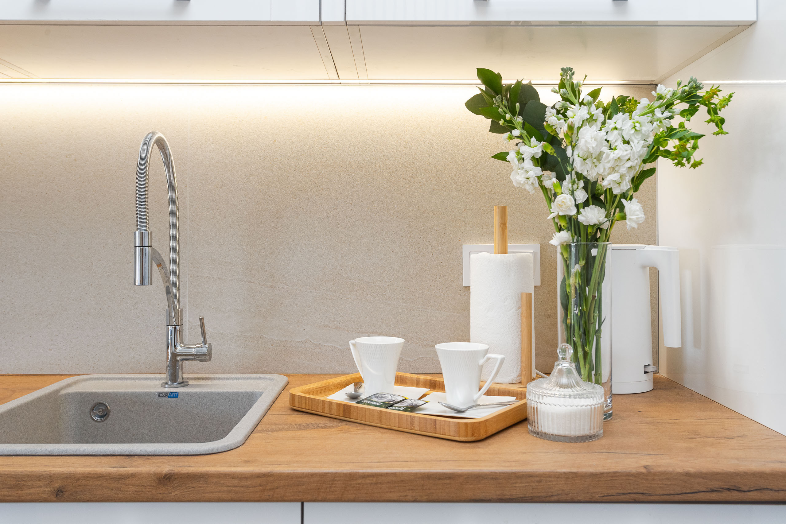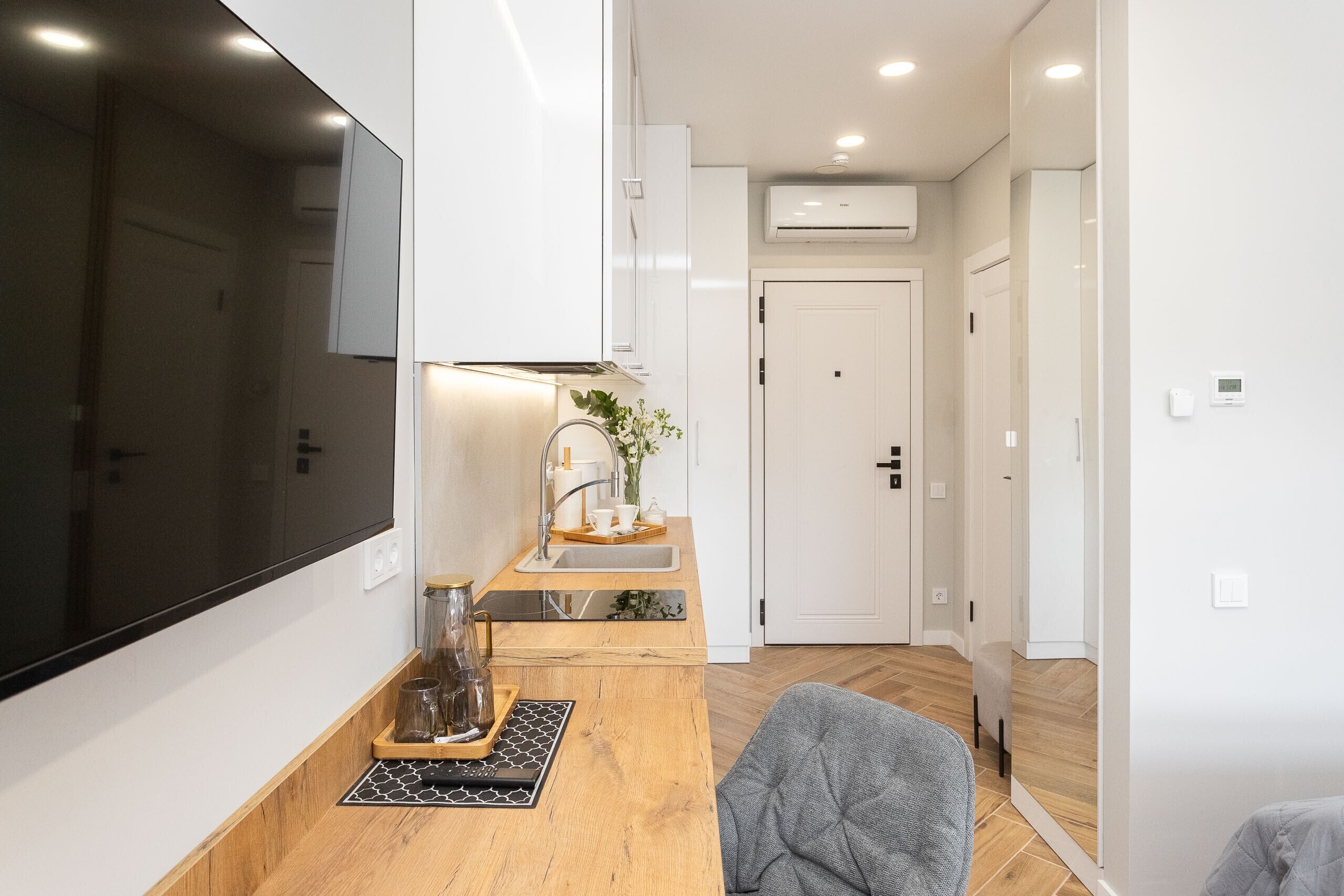 - Аккуратная кухонная зона со всем необходимым для лёгких завтраков и романтических ужинов