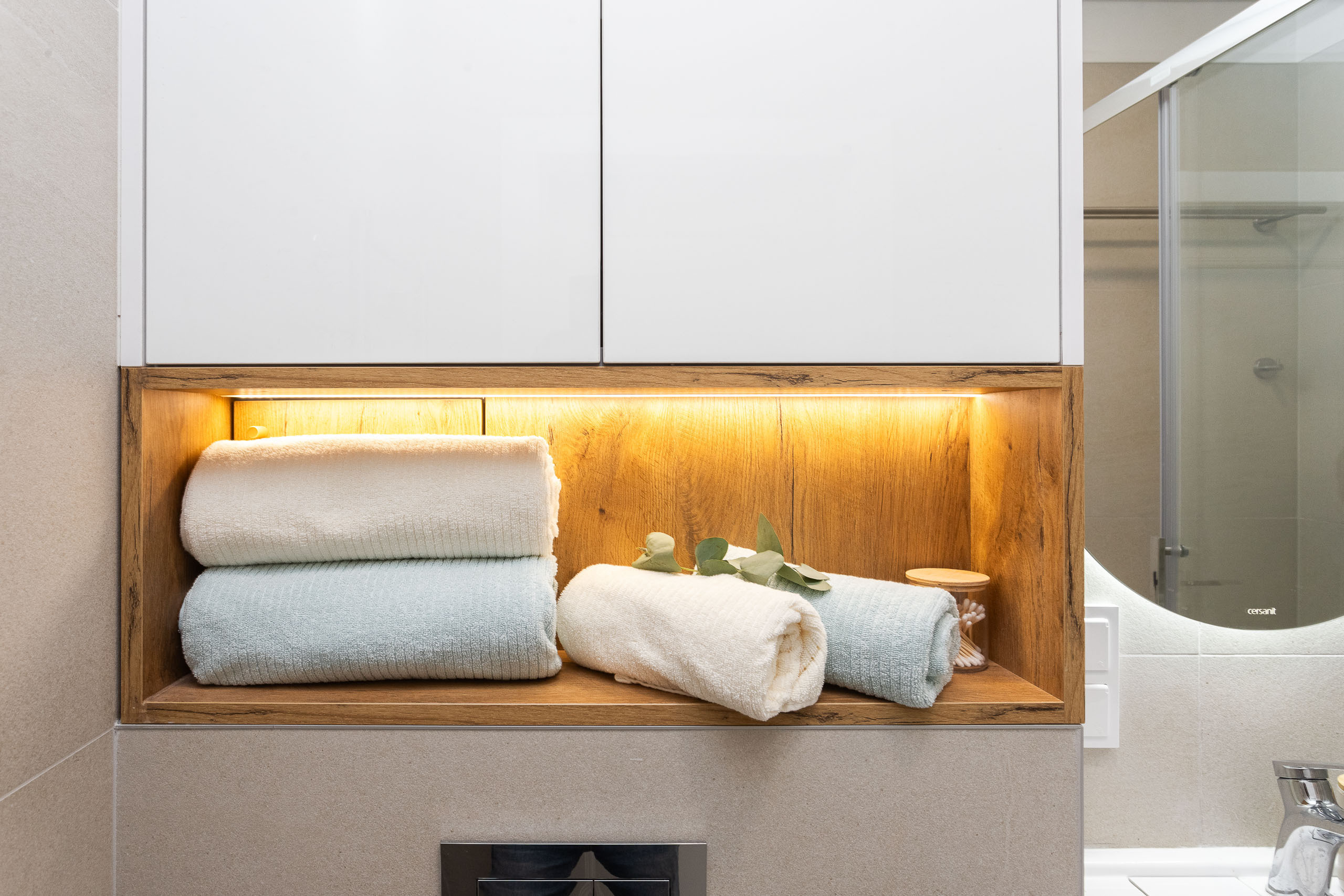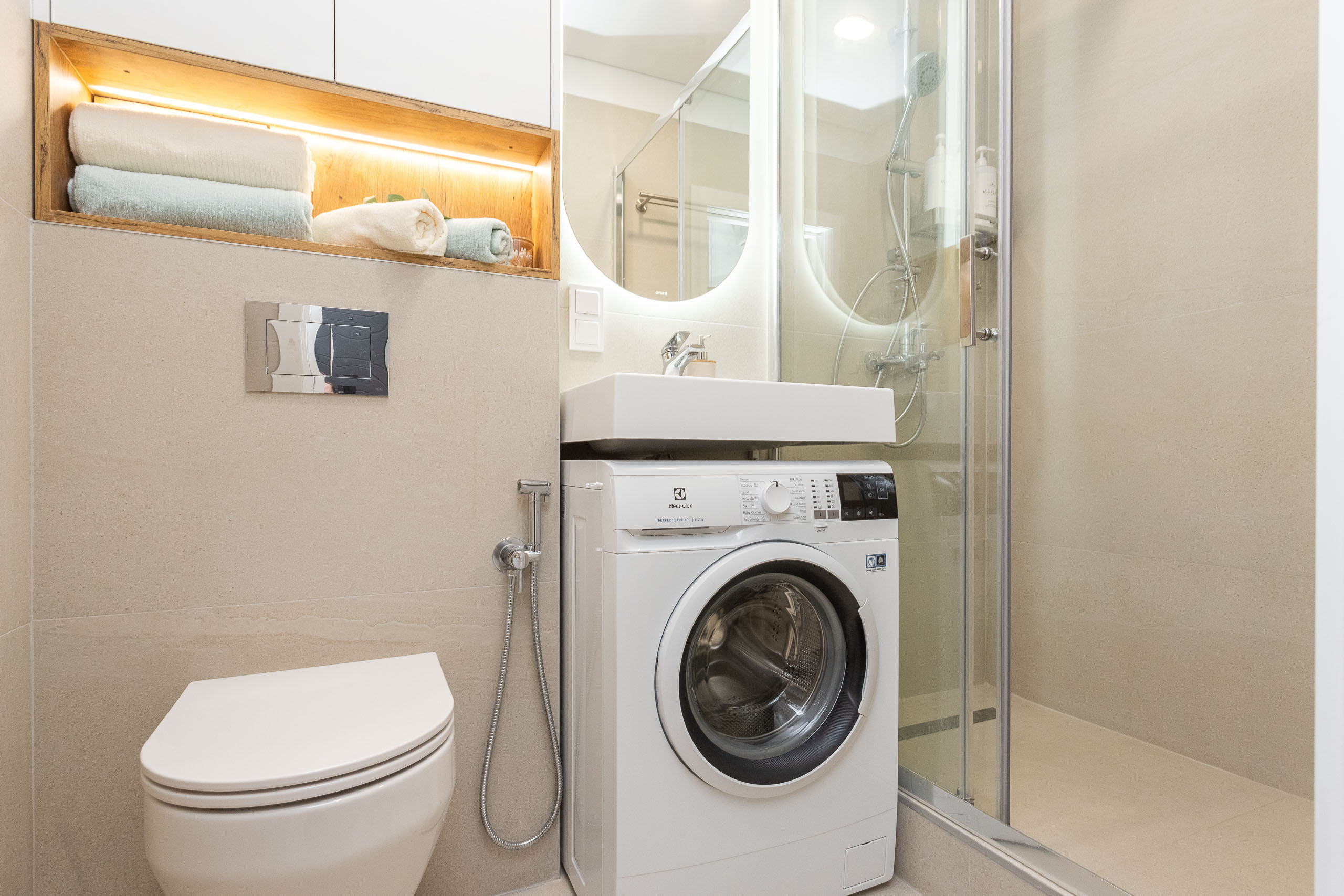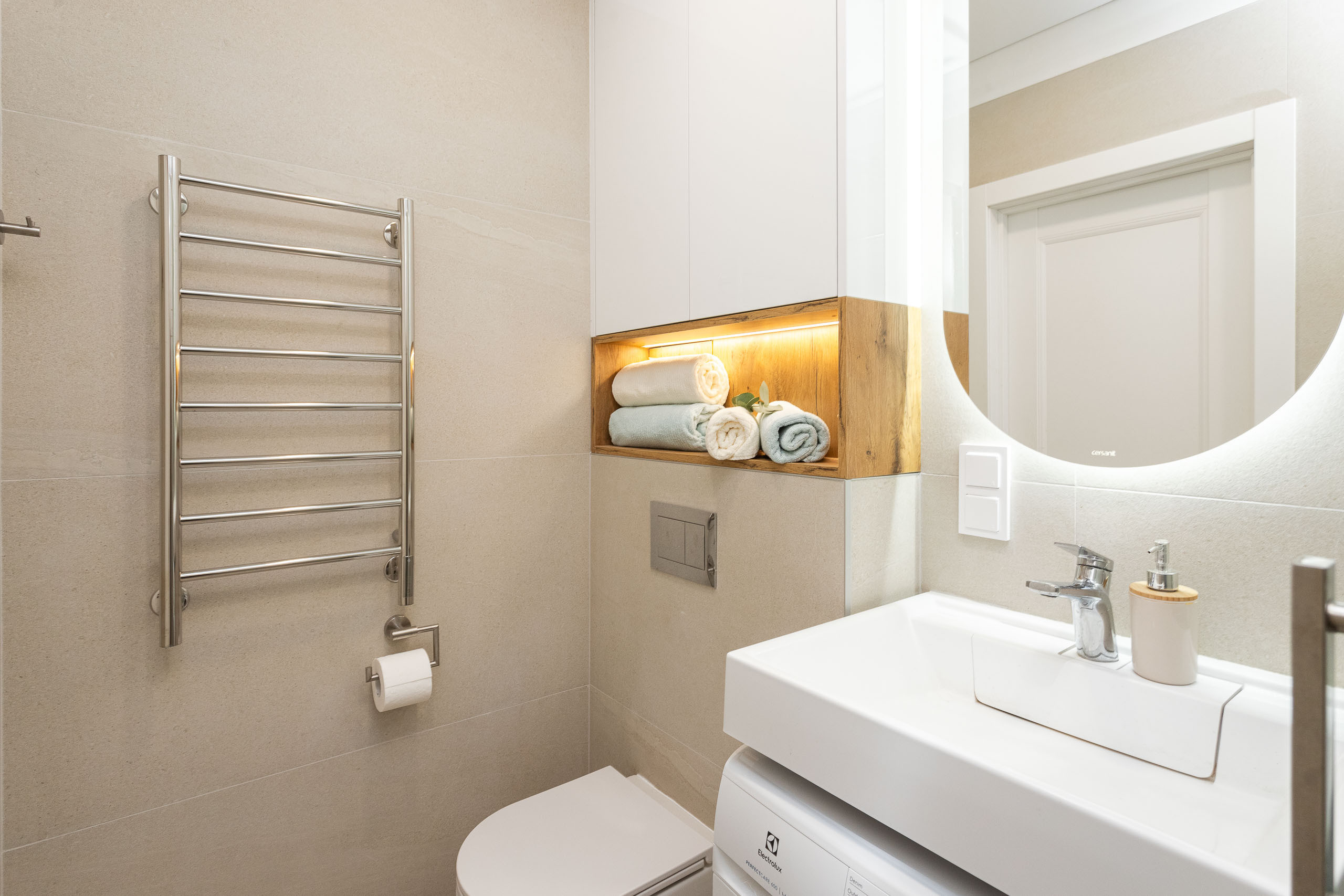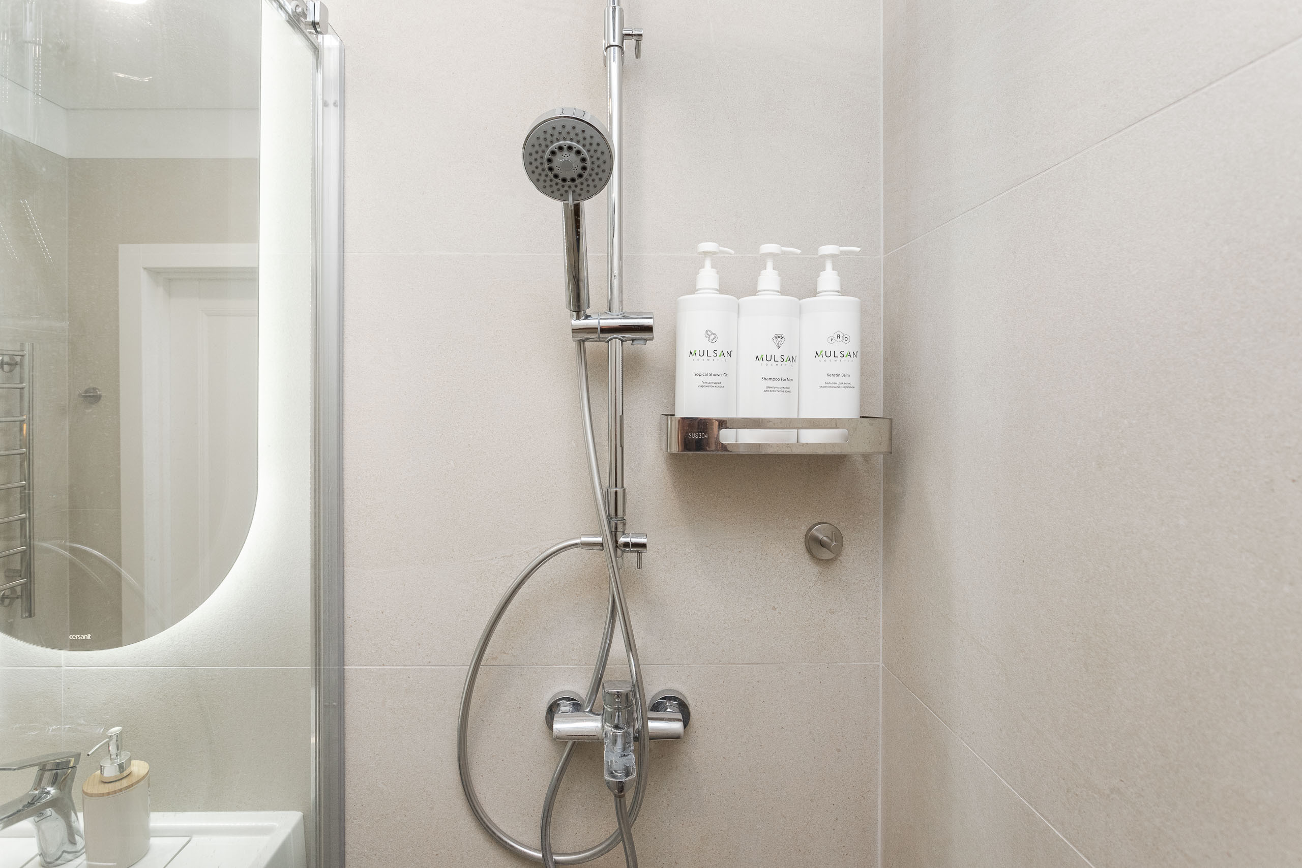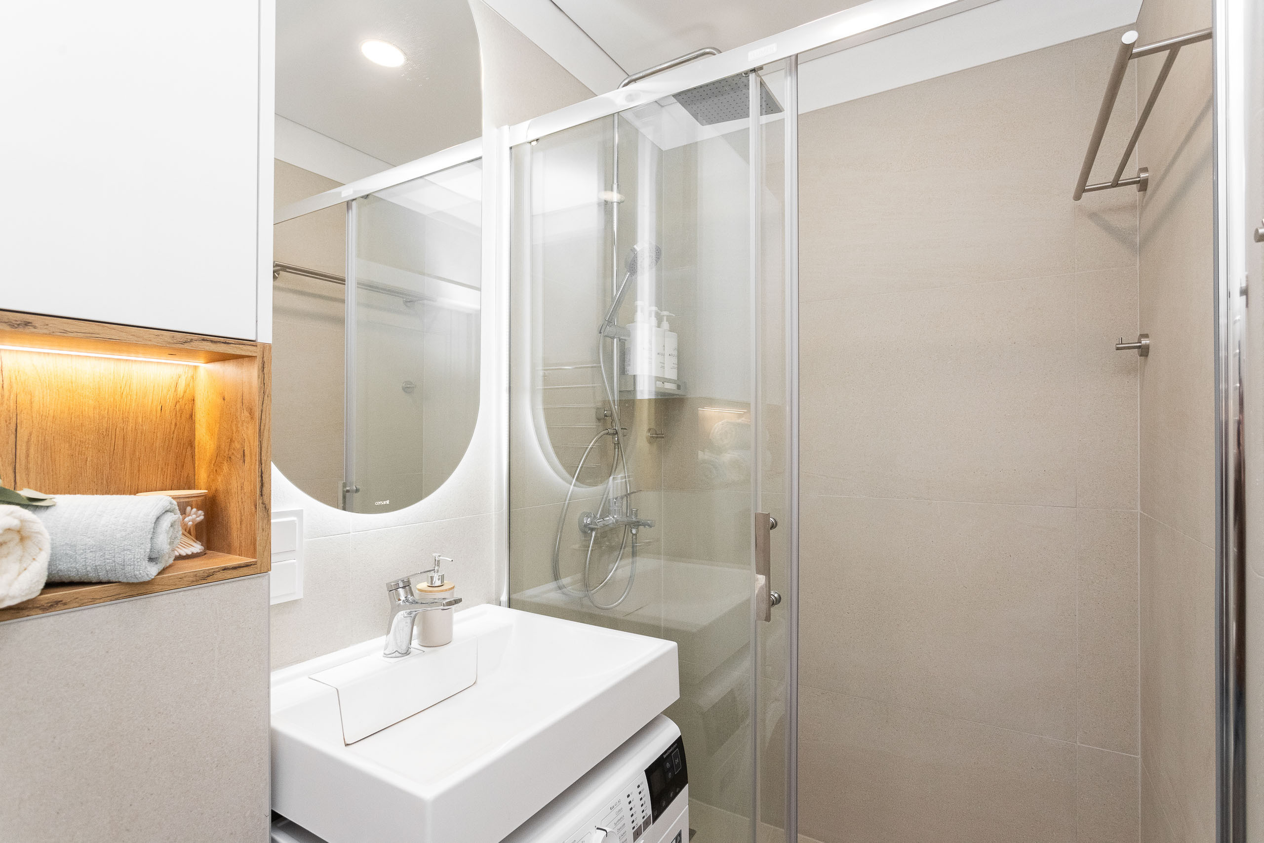 - Стильный санузел с душевой кабиной в свежей, лаконичной отделке