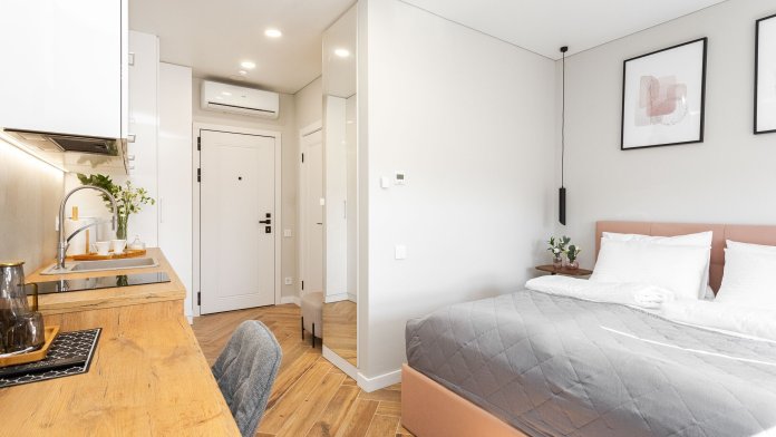 Просторная студия с дизайнерским ремонтом в нежных, природных тонах
