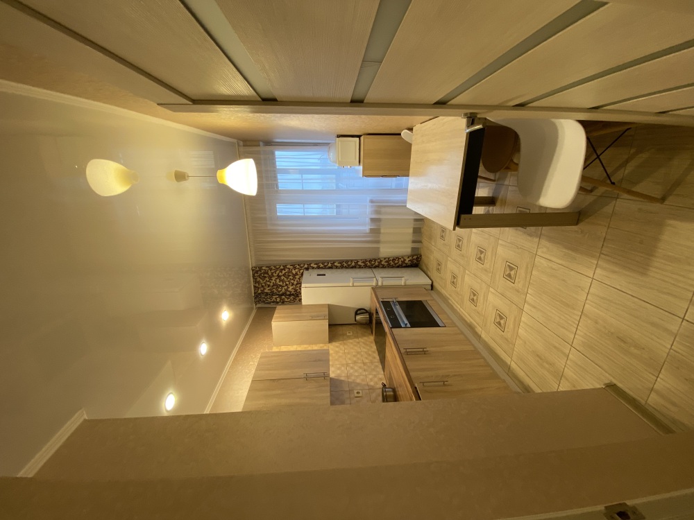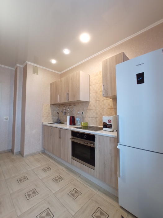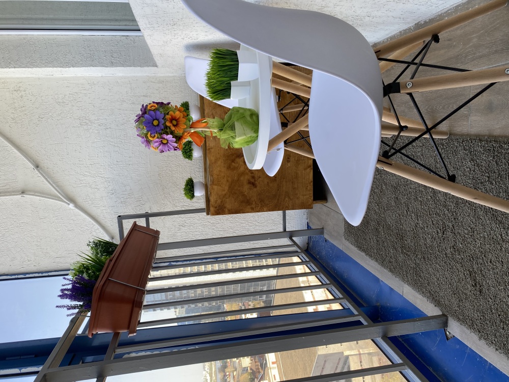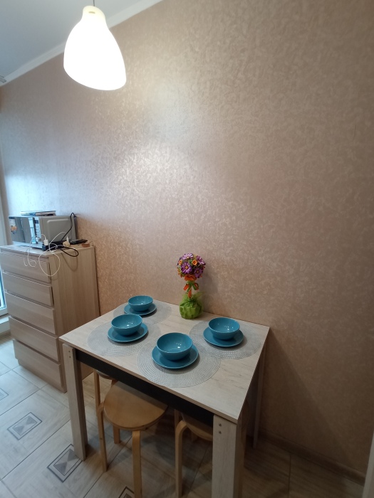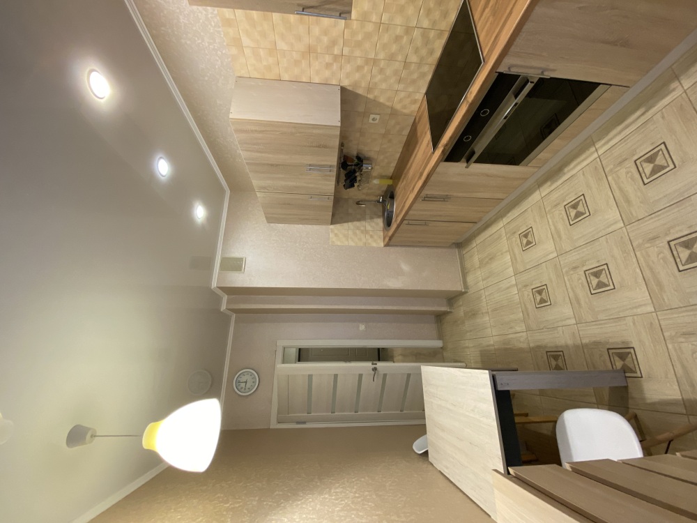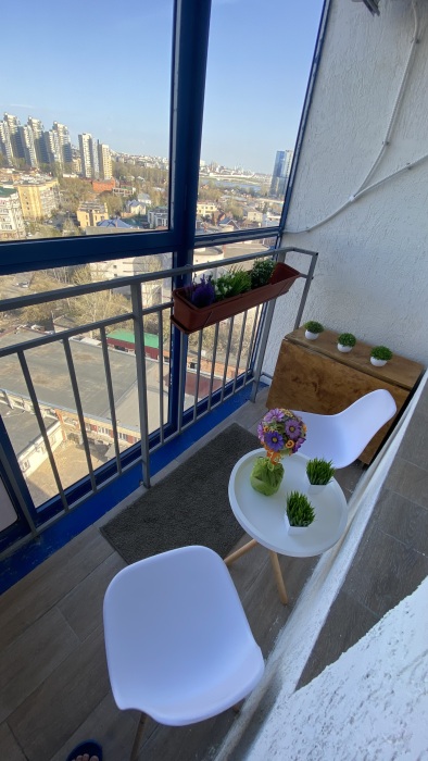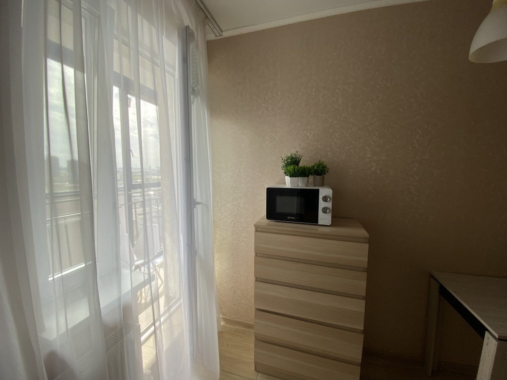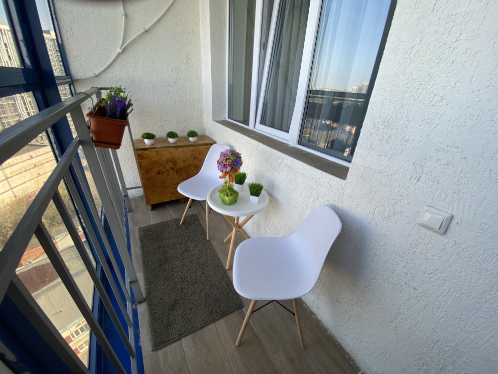 В квартире отдельная кухня с выходом на балкон, где предусмотрен стол и стулья, чтобы сидеть, пить чай и наслаждаться видом на город. Также отдельная комната: спальня-зал.