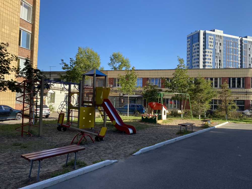 Во дворе детские и спортивные площадки.