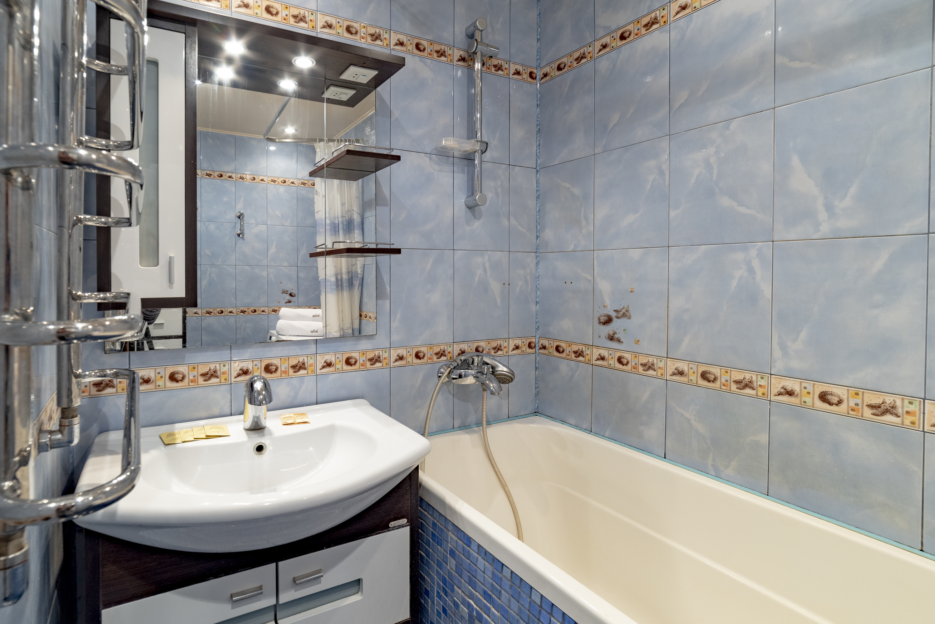 – Гигиенические принадлежности (шампунь, гель для душа, мыло и одноразовые тапочки).