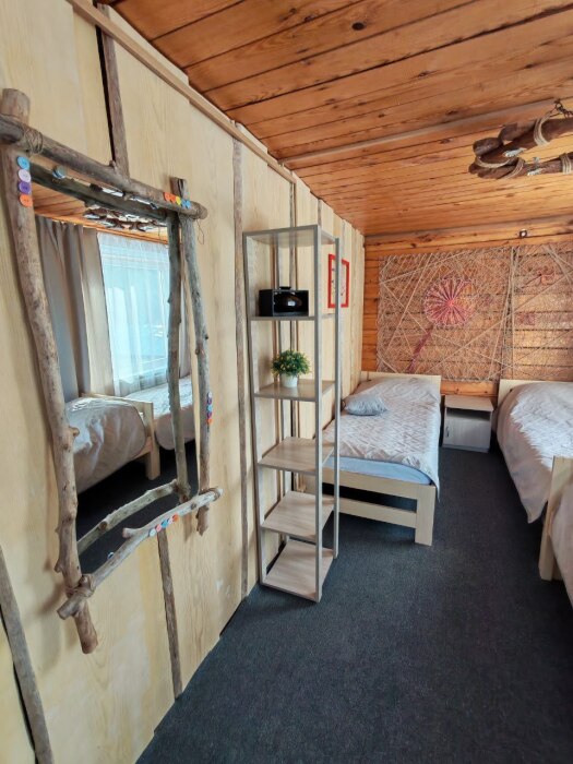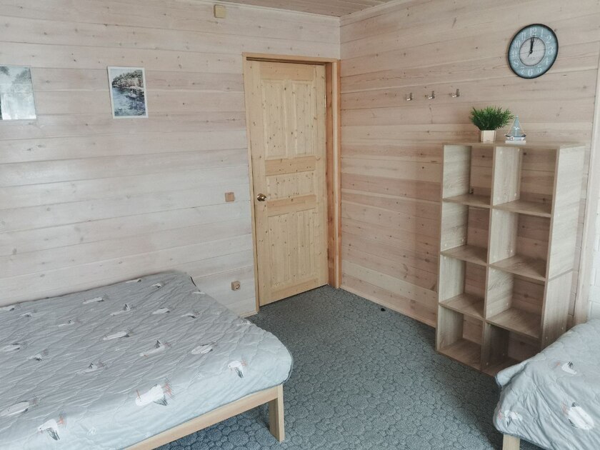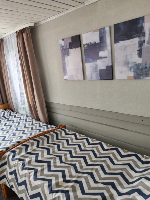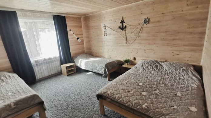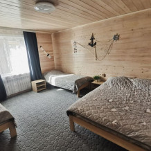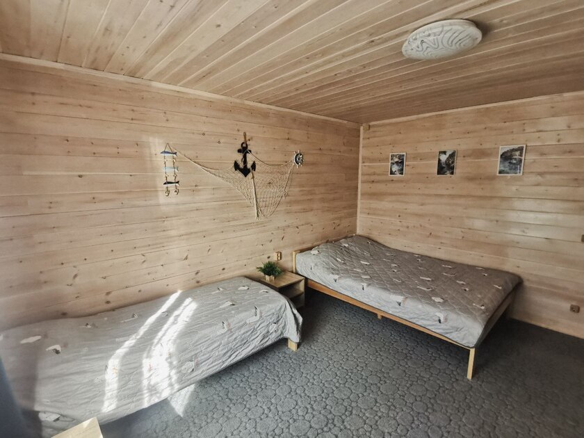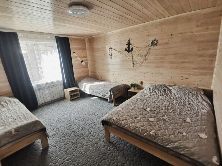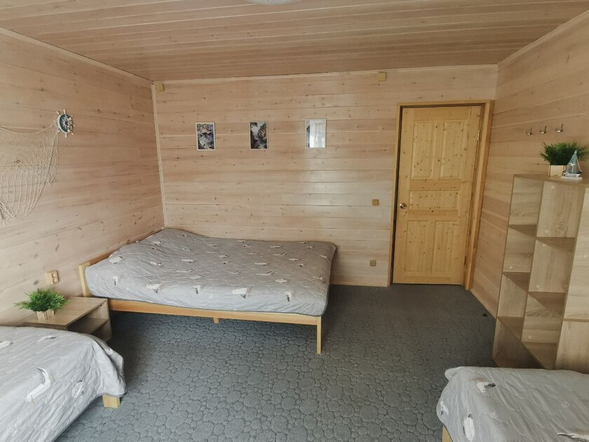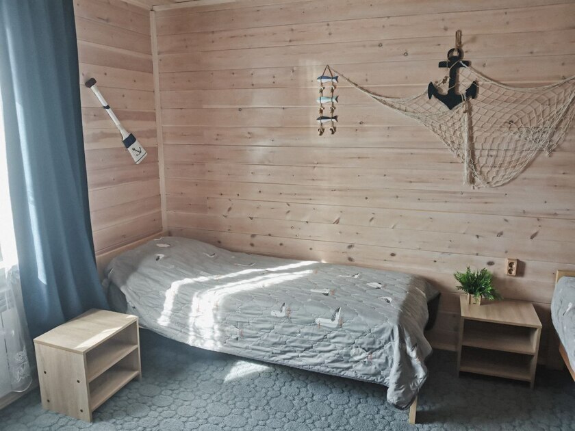 Добро пожаловать в наш просторный номер на первом этаже, где морская тематика встречается с домашним уютом. Большая кровать для родителей и две односпальные кровати для ваших маленьких матросов.