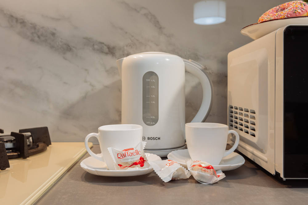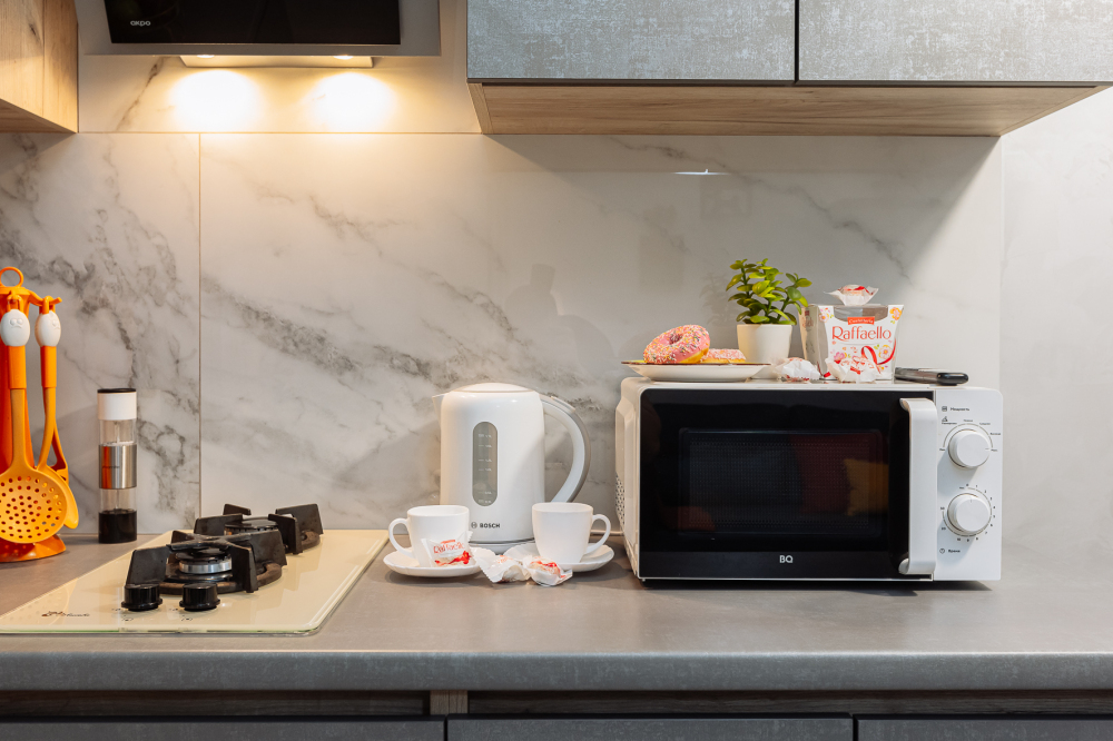 -️ На кухне Вы найдете все необходимое для приготовления еды: посуда, столовые приборы, кастрюли и сковородки, микроволновка, холодильник, чайник, духовка и газовая плита.