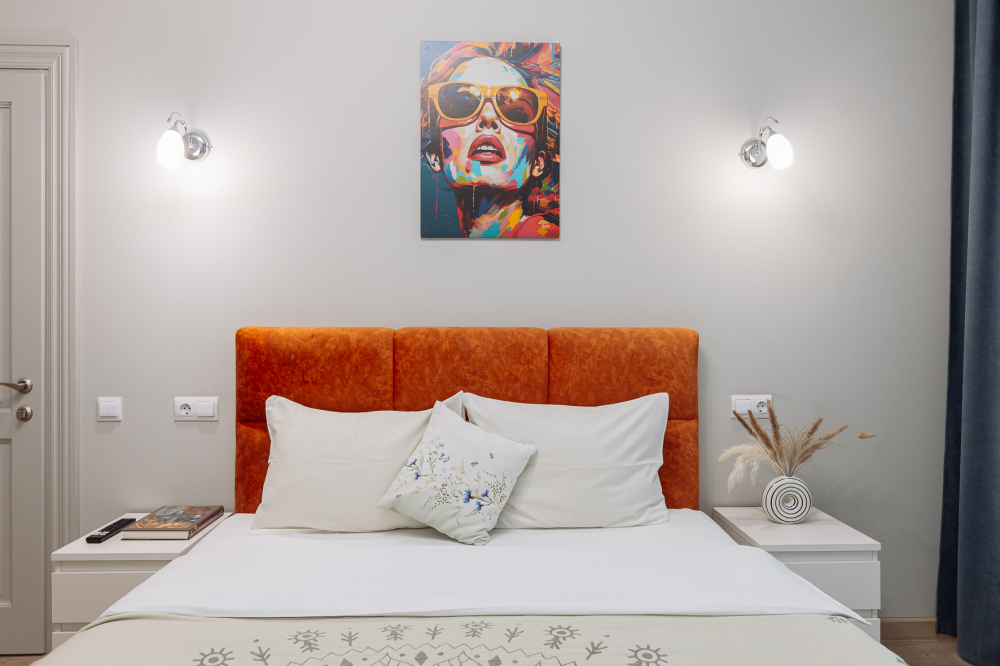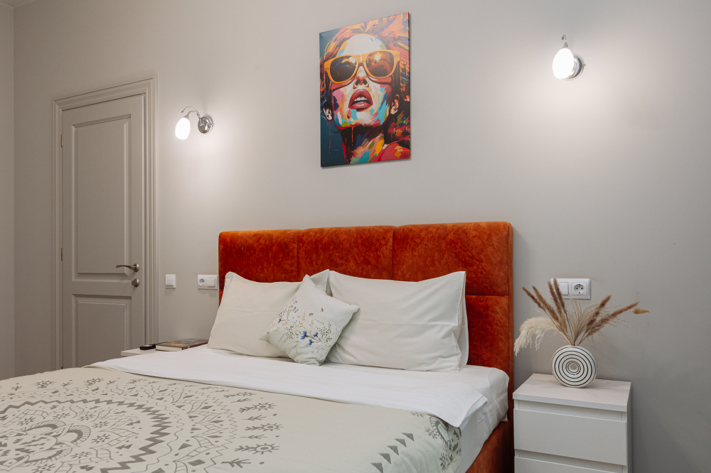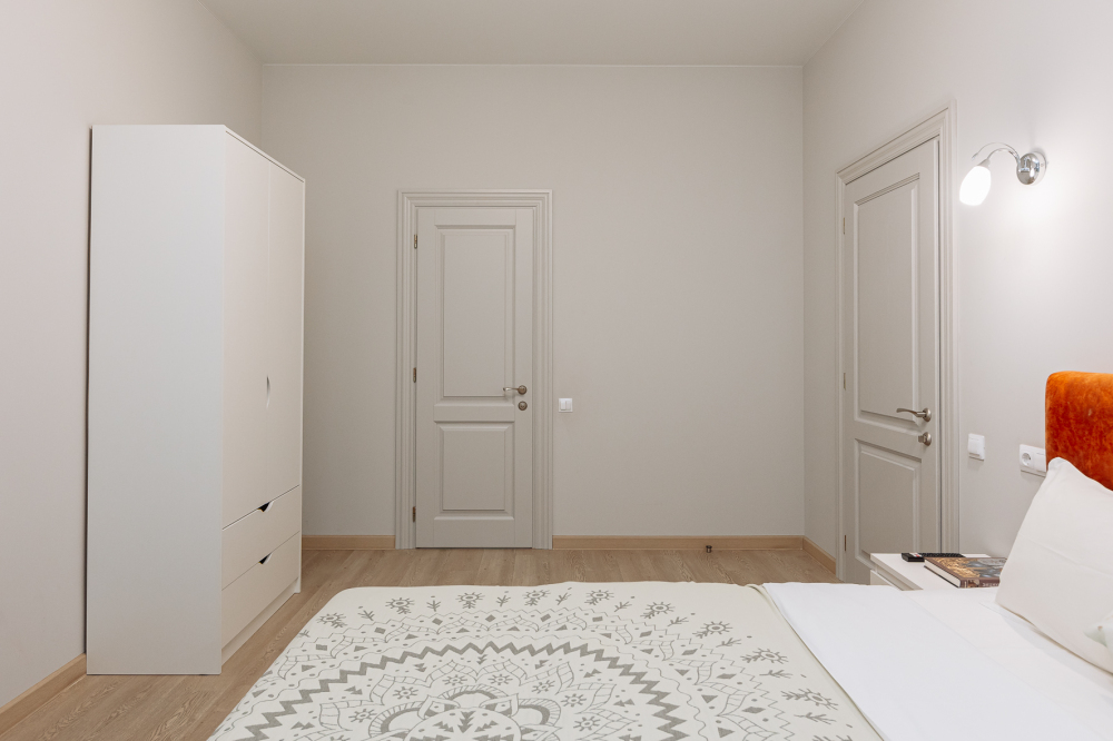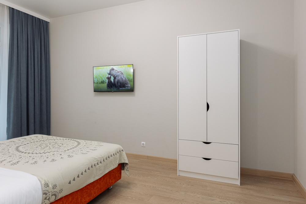 - Двуспальная кровать 160х200. Заправлена белоснежным постельным бельем.