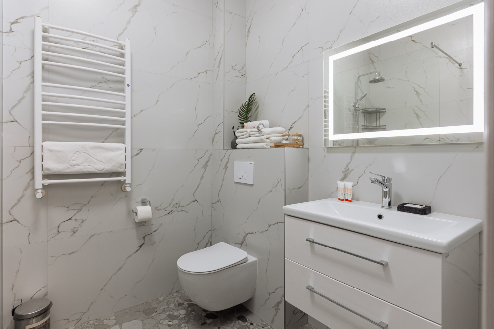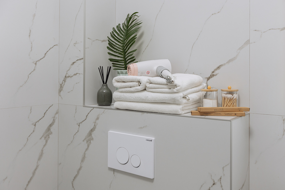 - Для каждого гостя подготовлено по 2 полотенца (для душа и рук) + 1 полотенце для ног.