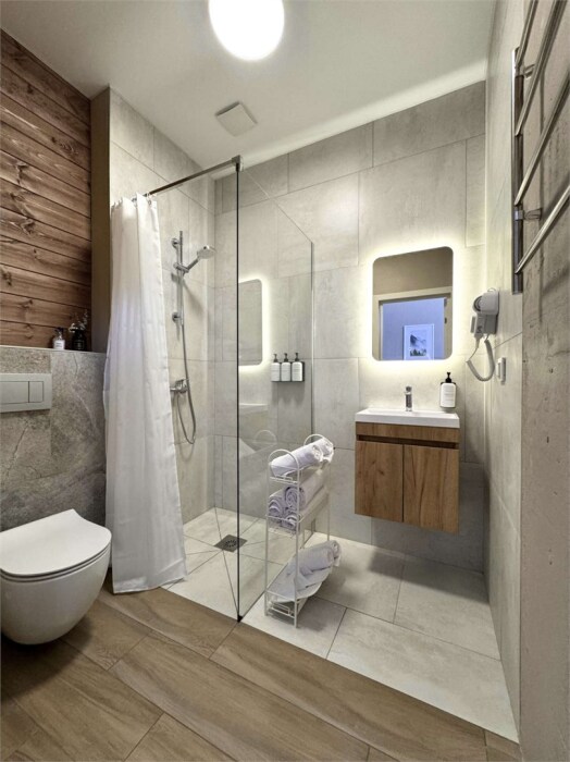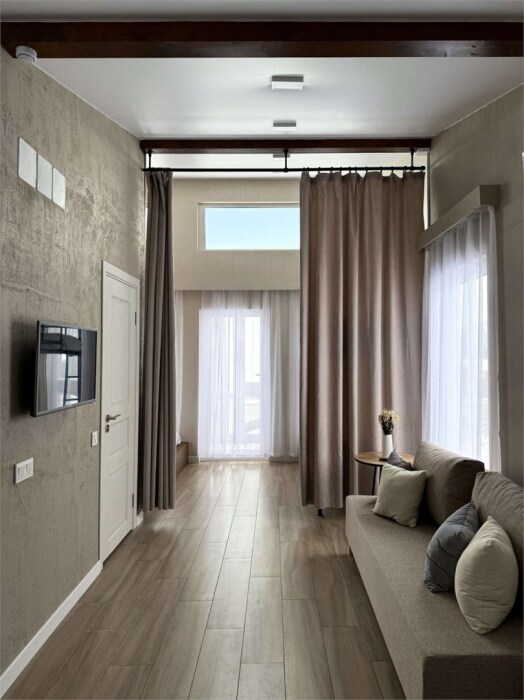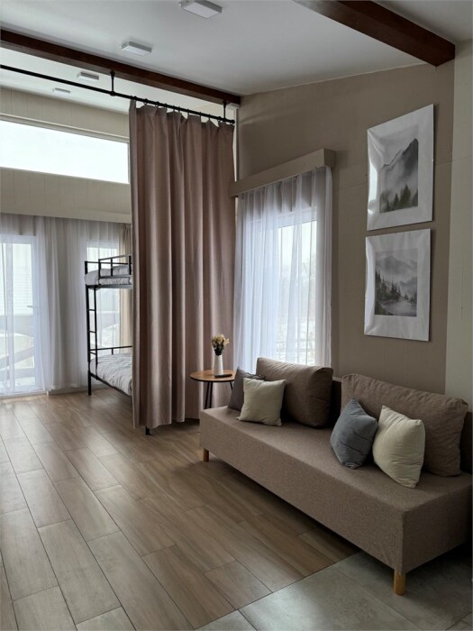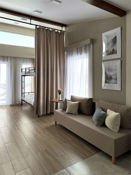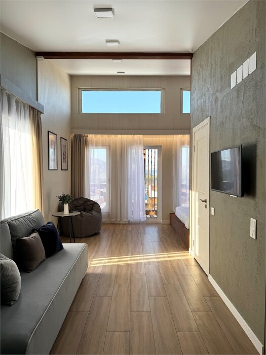 Классический апартамент студия с видом на горы (не во всех номерах). Включает в себя кухонную зону, гостиную, спальню, ванную комнату, балкон.