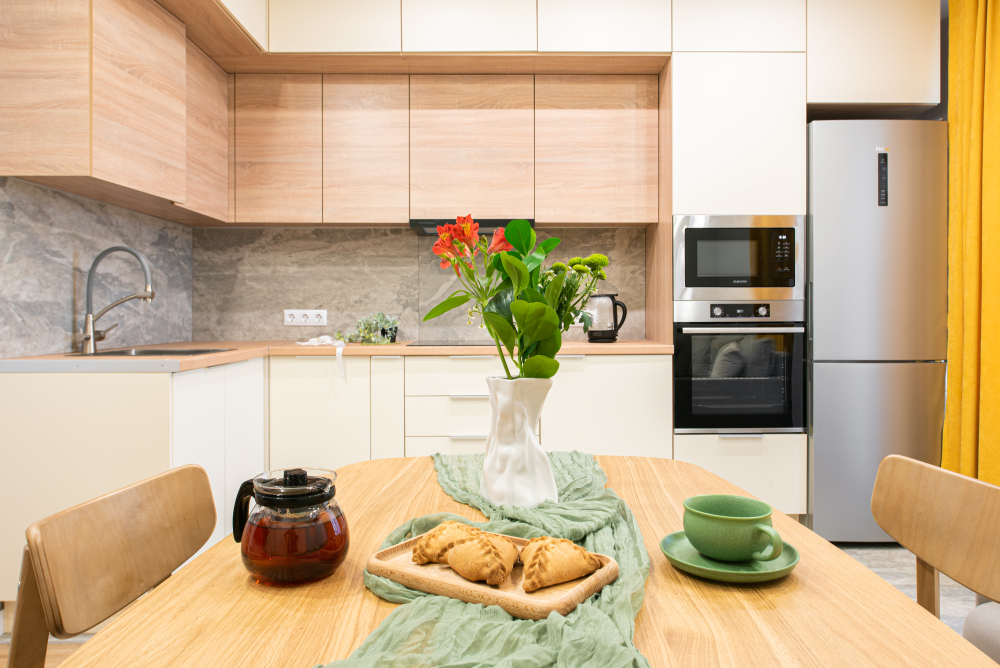 - Полностью оборудованную кухню: чайник, плита, духовой шкаф, холодильник , микроволновая печь и всё необходимое для готовки.