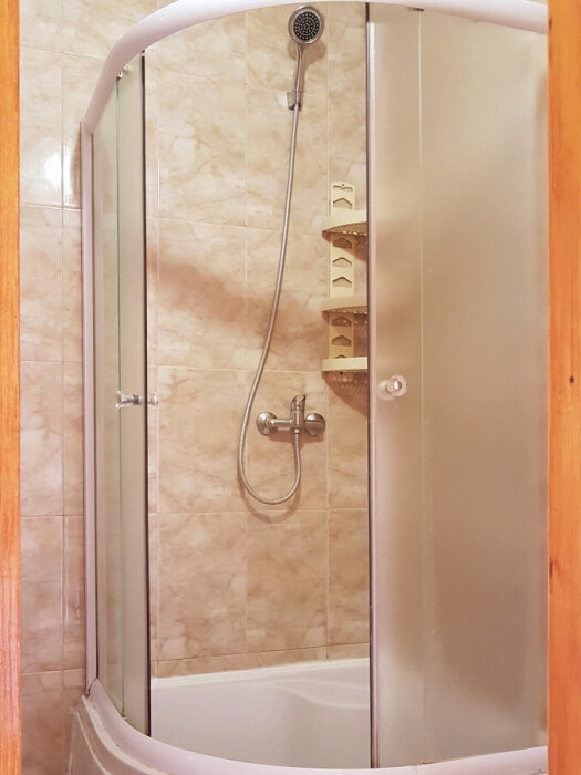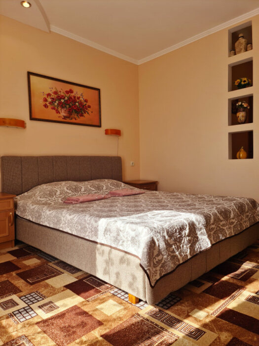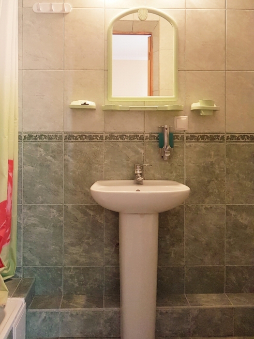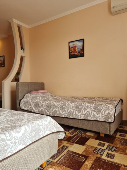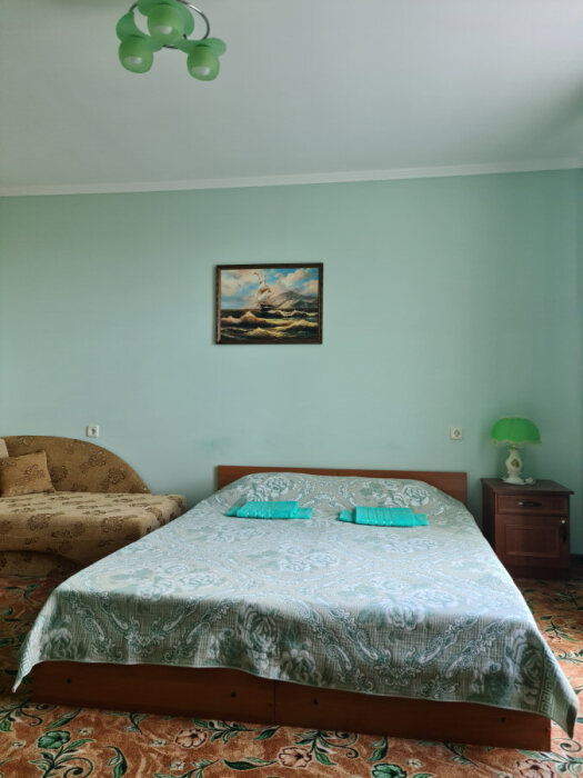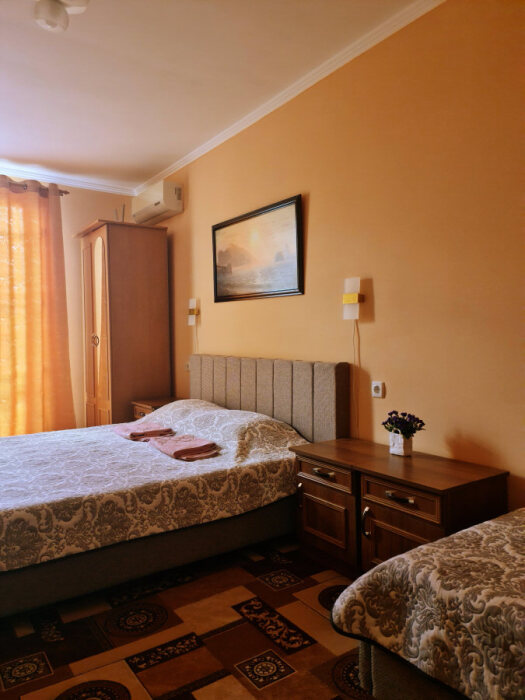 Просторный уютный номер с одной двуспальной и двумя односпальными кроватями, постельным бельём и полотенцами, оборудованный всем необходимым для комфортного пребывания 3-4 человек, включая холодильник, кондиционер, кабельное телевидение, бесплатный WiFi и собственный санузел с душевой кабиной. В номерах 2-го и 3-го этажей имеются балконы с видом на море и окружающие горы.