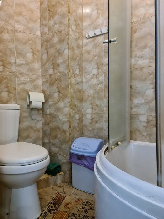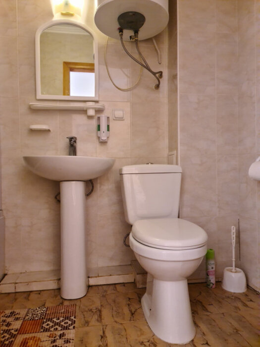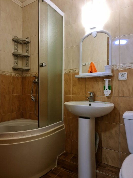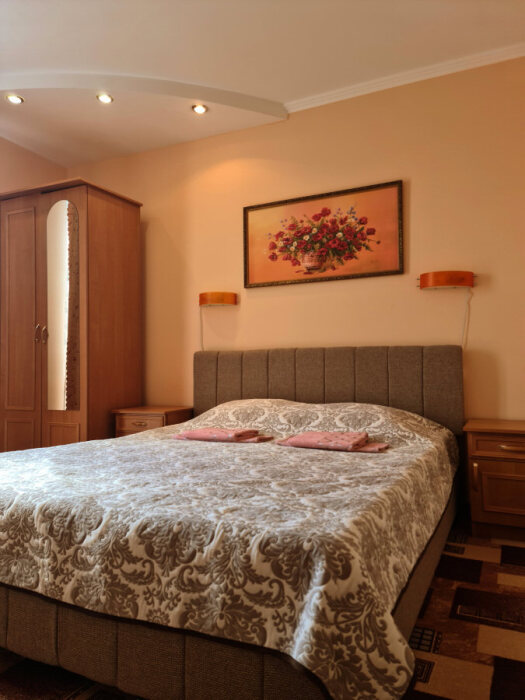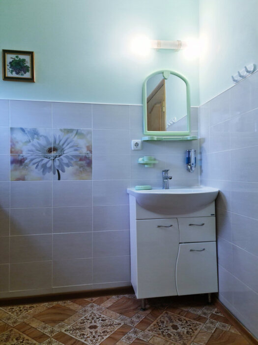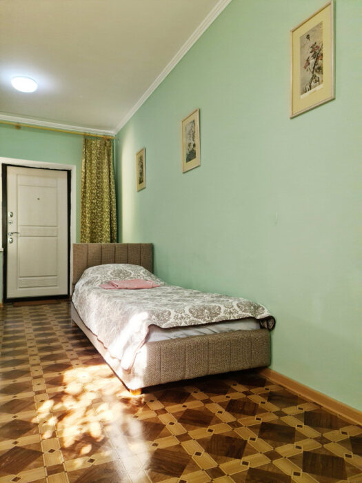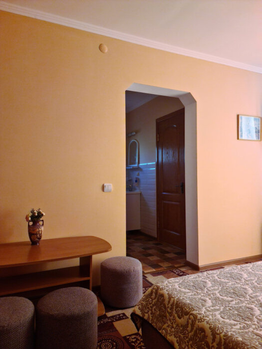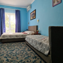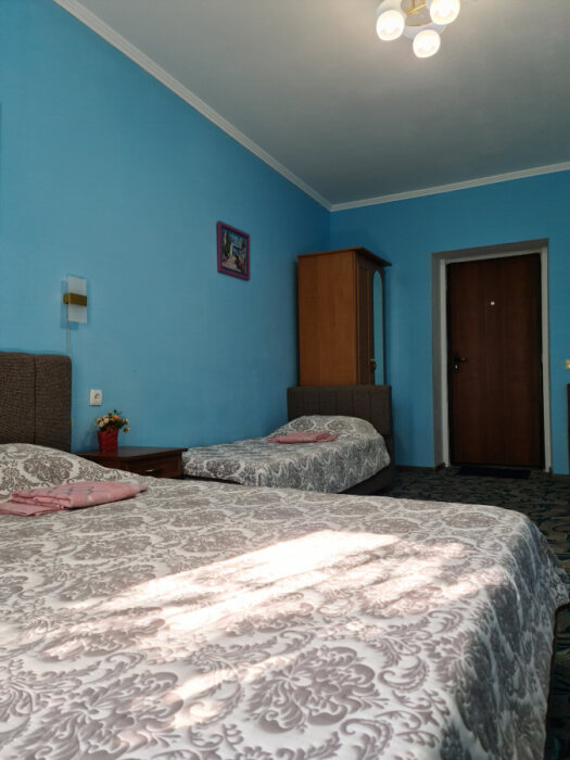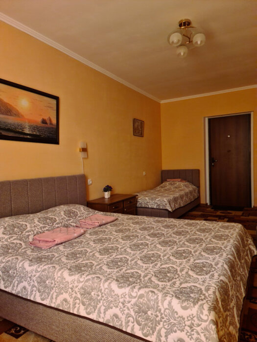 Просторный уютный номер с одной двуспальной и одной односпальной кроватью, постельным бельём и полотенцами, оборудованный всем необходимым для комфортного пребывания 3 человек, включая холодильник, кондиционер, кабельное телевидение, бесплатный WiFi и собственный санузел с душевой кабиной. Находится на 1-ом этаже и балкона не имеет.