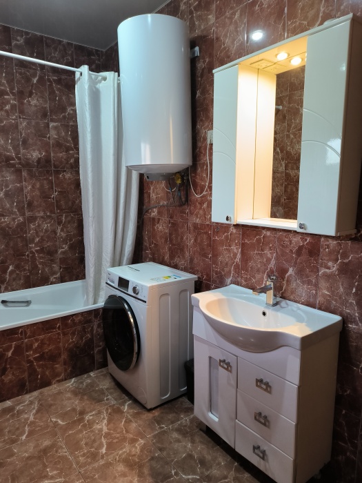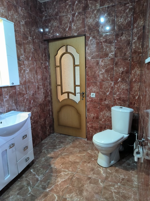 Санузел оборудован ванной, туалетом, раковиной, набором полотенец, средствами личной гигиены, гладильные принадлежности, фен.