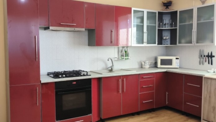На кухне есть СВЧ-печь, чайник, посуда, холодильник, газовая плита и духовка.