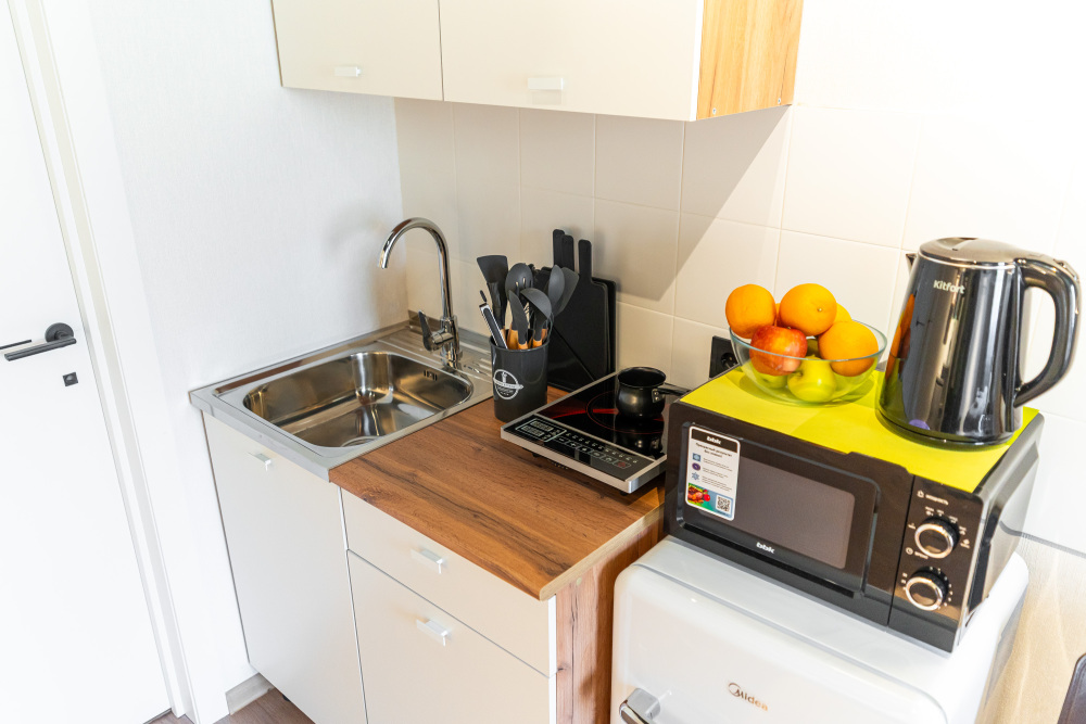 - Удобства: полностью оборудованная кухня с посудой, кофе, чай, фен, полотенца и постельное бельё.