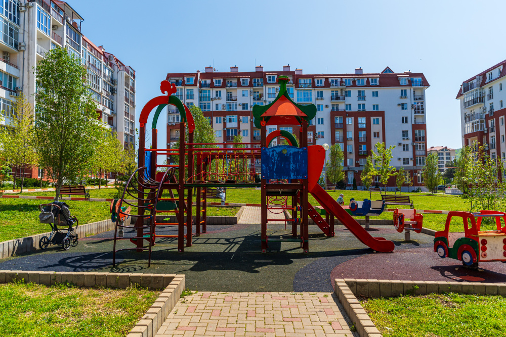 Закрытая территория: сад, детские и спортивные площадки, парк со скамейками. Супермаркеты, кафе, в шаговой доступности.