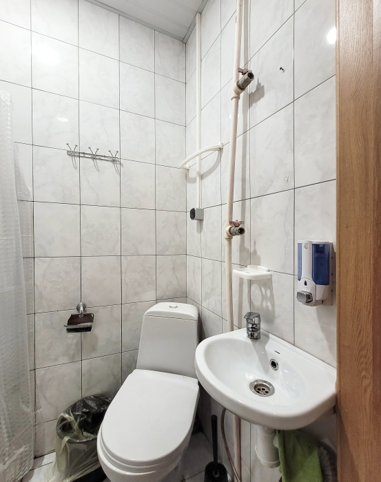 В коридоре два санузла с душем на 6 комнат.