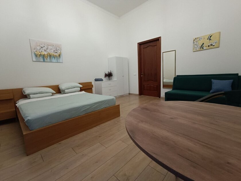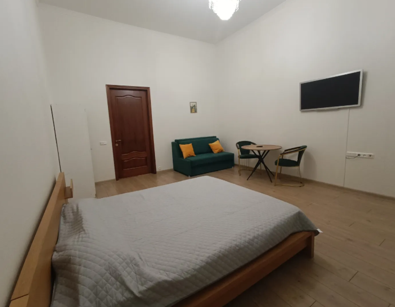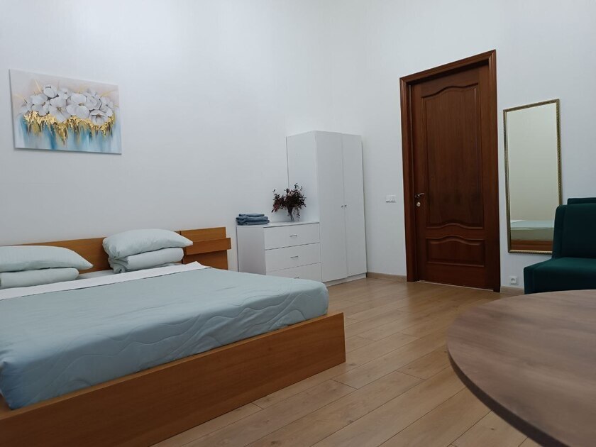 Комната выполнены в классических тонах. Кровать с ортопедическими матрацами и качественным бельем окутают вас уютом. Полотенца, по 2 шт. на каждого гостя. Потолки 3,7 метра, невероятный простор и воздух.