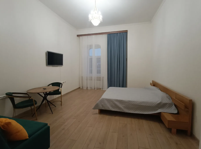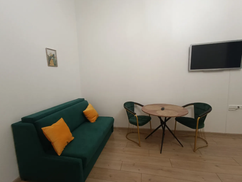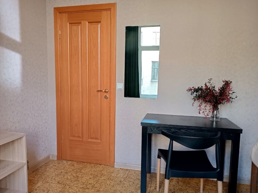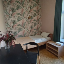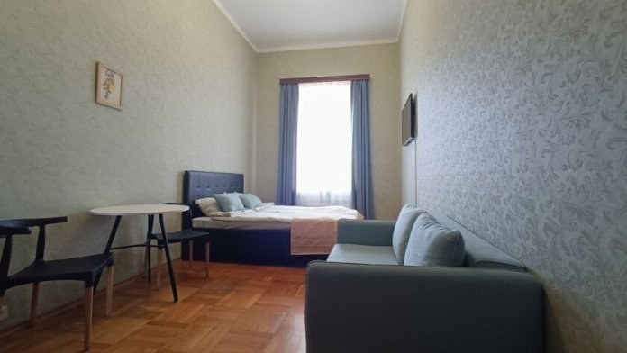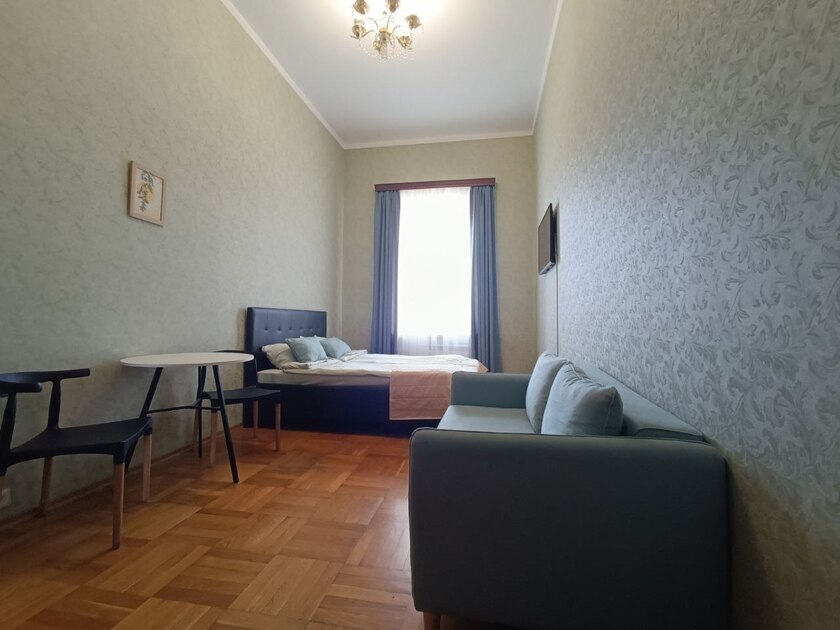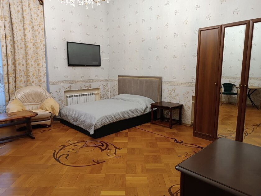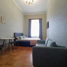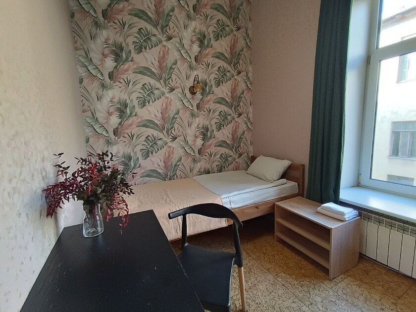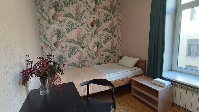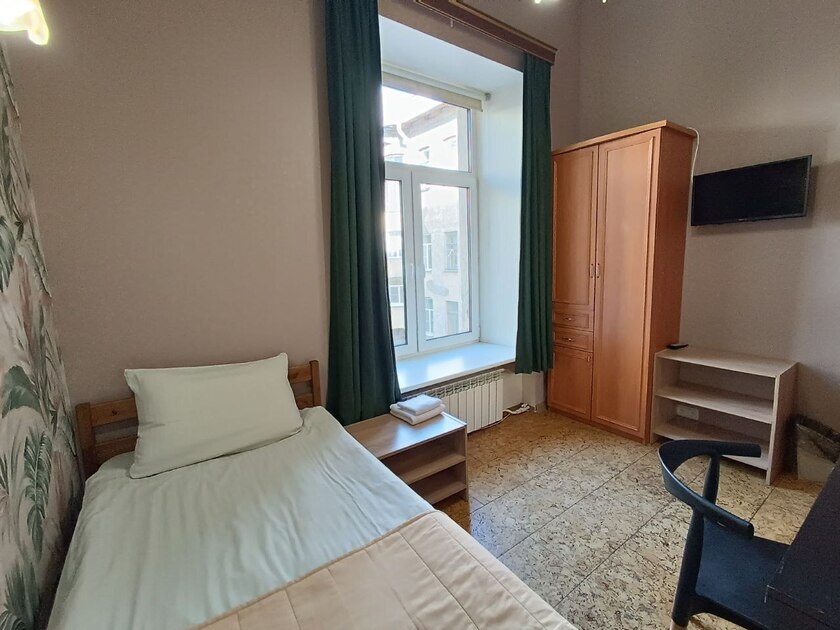 Комната выполнена в классических тонах. 1 односпальная кровать с ортопедическим матрацем 80*200 и качественным бельем окутают Вас уютом. Полотенца, по 2 шт. на каждого гостя. Шкаф для одежды, телевизор со множеством каналов, тумбочки. Потолки 3,7 метра, невероятный простор и воздух.
