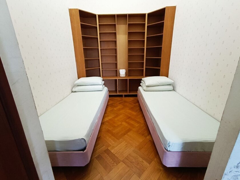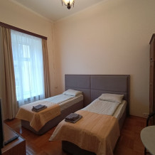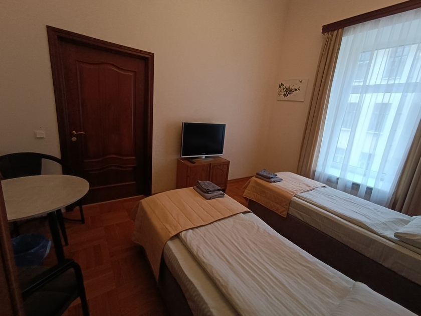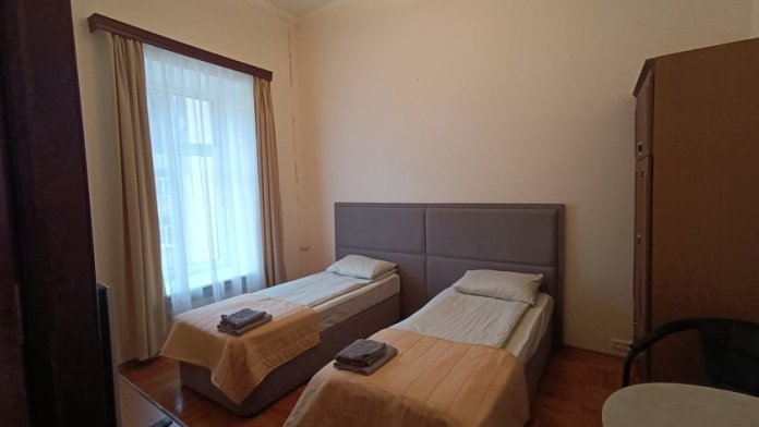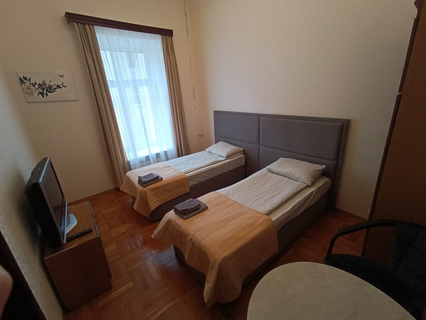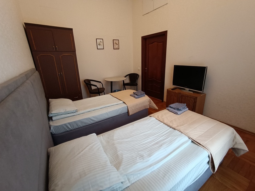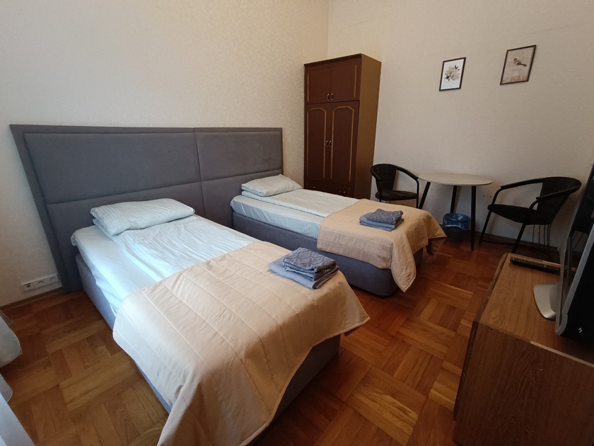 Комната выполнена в классических тонах. 2 кровати с ортопедическим матрацем 90*200 и качественным бельем окутают Вас уютом. Полотенца, по 2 шт. на каждого гостя. Шкаф для одежды, стол, стулья, телевизор со множеством каналов. Потолки 3,7 метра, невероятный простор и воздух.