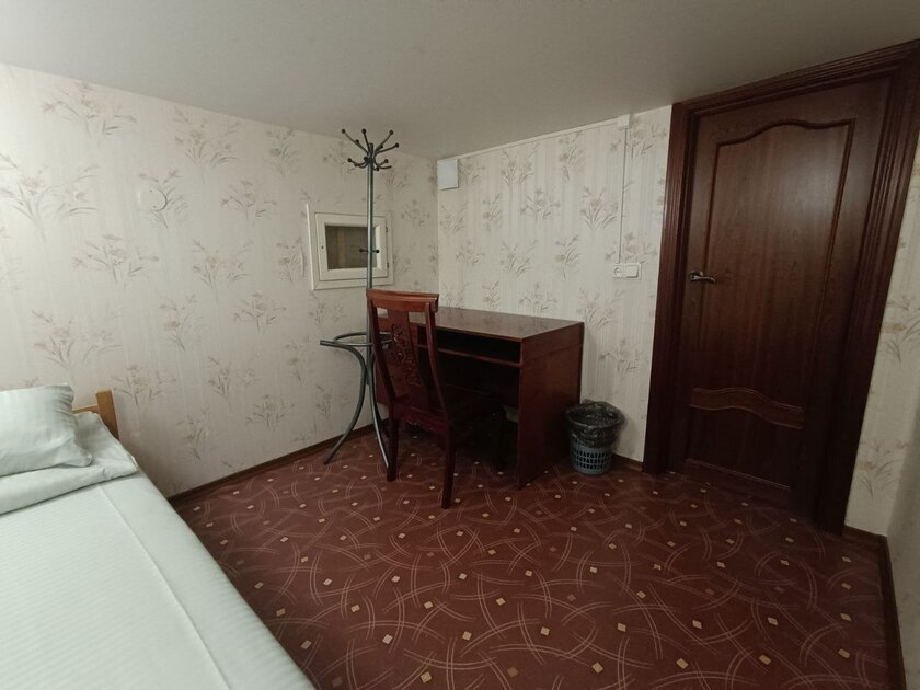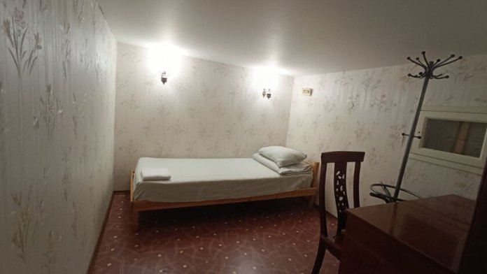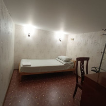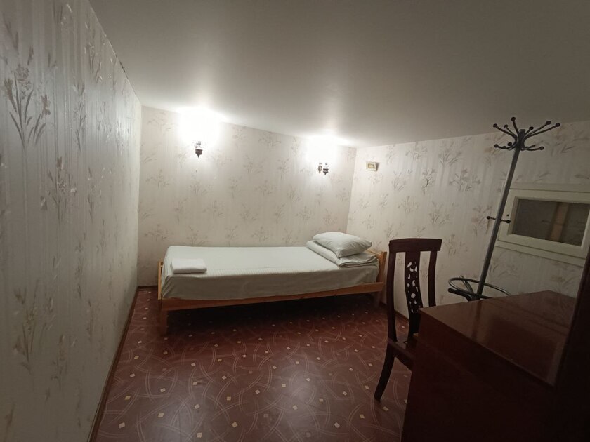 Эта комната без окна. Предлагаем Вам очень маленькую уютную 1-местную комнату со всем необходимым для комфортного отдыха. Комната выполнена в классических тонах. Кушетка раскладывается в односпальную кровать, качественное бельё окутают Вас уютом. Полотенца, вешалка для одежды, стол, стул. Потолки 1, 8 метра, сделана система вентиляции.