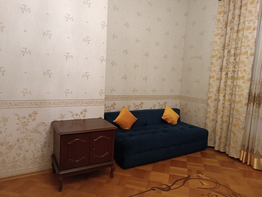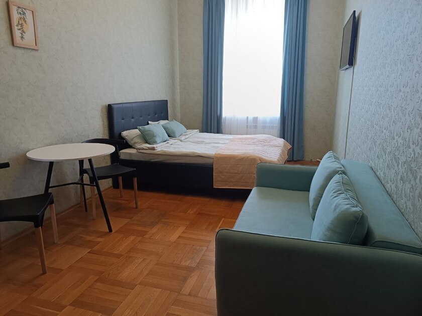 Комната выполнена в классических тонах. Кровать с ортопедическим матрацем 180*200 и качественным бельем окутают Вас уютом. Так же в комнате есть раскладной комфортный диван 140*200 см. и небольшой односпальный диванчик. Полотенца, по 2 шт. на каждого гостя. Шкаф для одежды, стол, стулья, телевизор. Потолки 3,7 метра, невероятный простор и воздух.