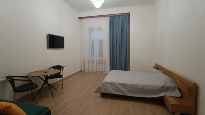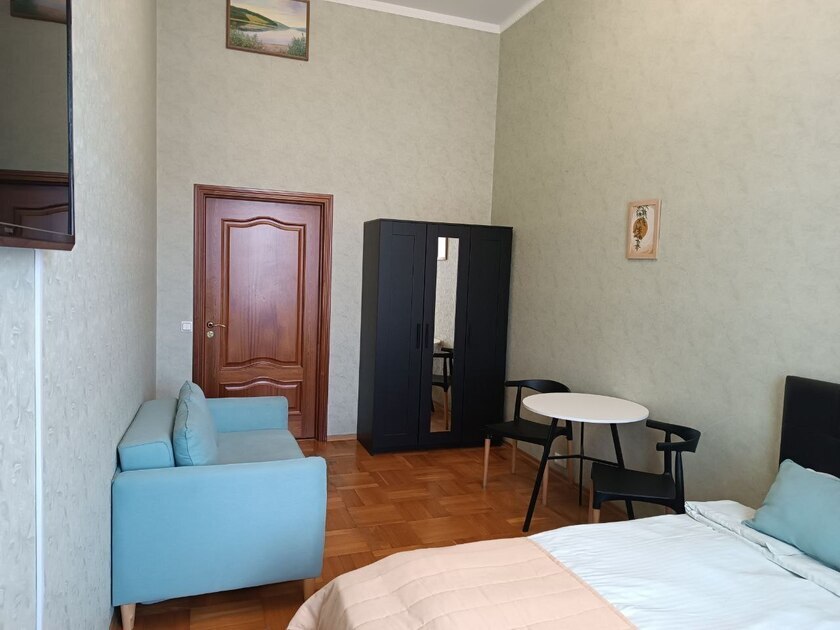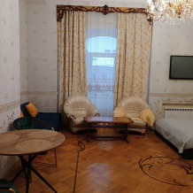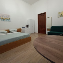 Предлагаем Вам очень большую и уютную 2-6-местную комнату со всем необходимым для комфортного отдыха. Комната выполнена в классических тонах. Кровать с ортопедическим матрацем 180*200 и качественным бельем окутают Вас уютом, есть раскладной комфортный диван 140*200 см. и 2 кровати 80*200 см. Полотенца, по 2 шт. на каждого гостя. Шкаф для одежды, стол, стулья, телевизор. Потолки 3,7 метра, невероятный простор и воздух.