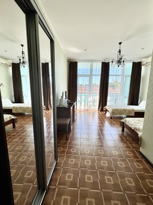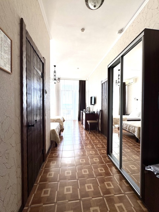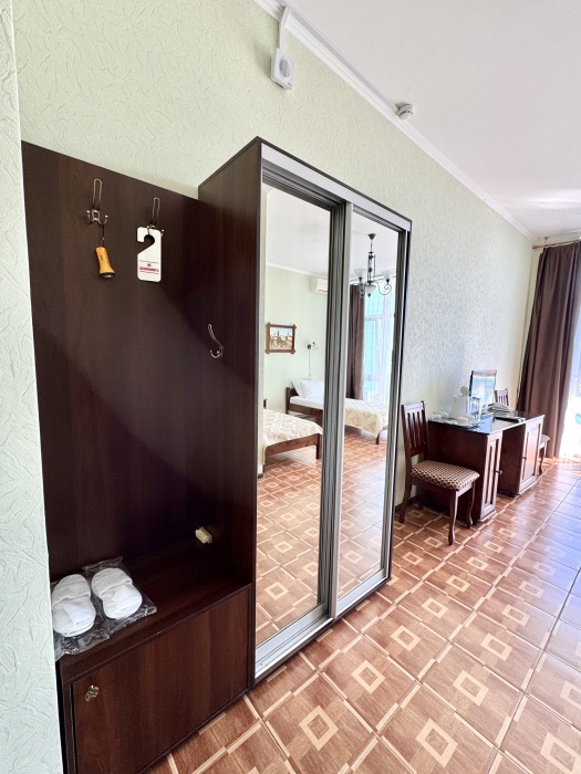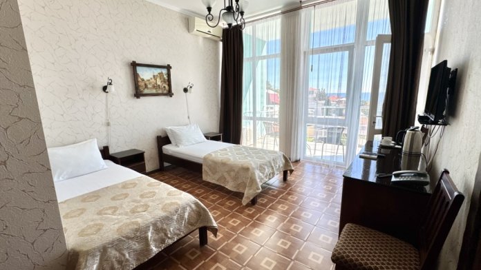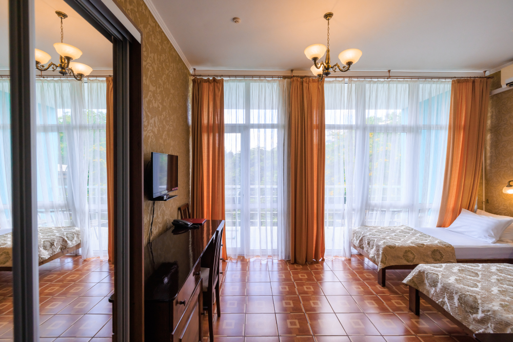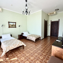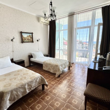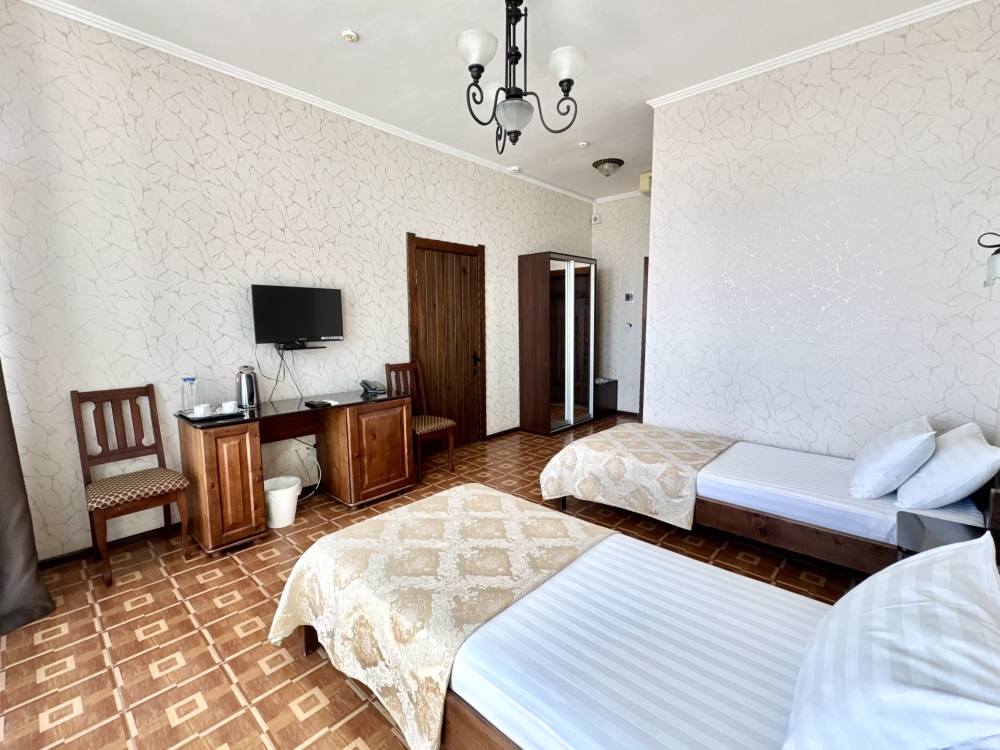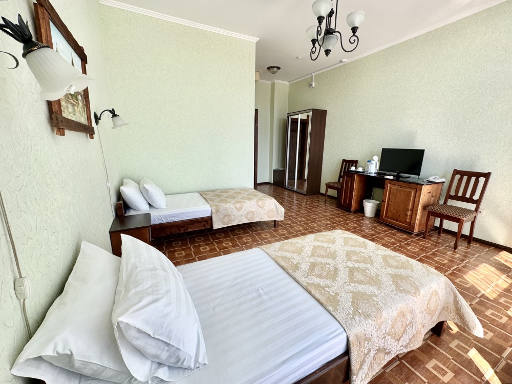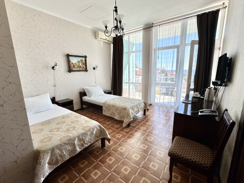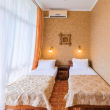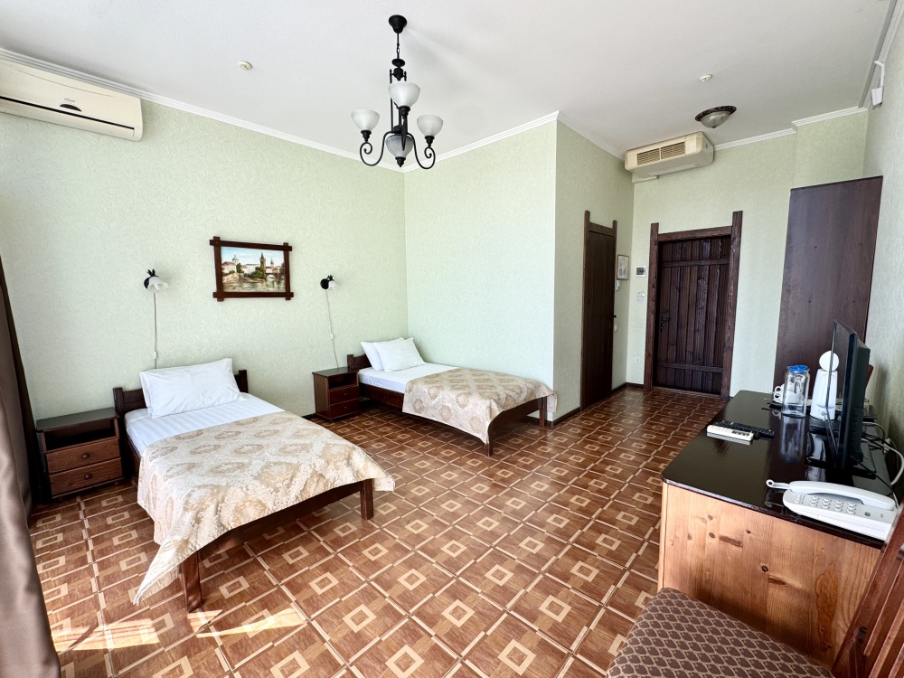 В номере: две односпальные кровати (90х200 см.), шкаф для одежды, прикроватные тумбы, стол, стул, посуда, электрочайник, холодильник, телефон, LCD телевизор, кондиционер, балкон с мебелью.